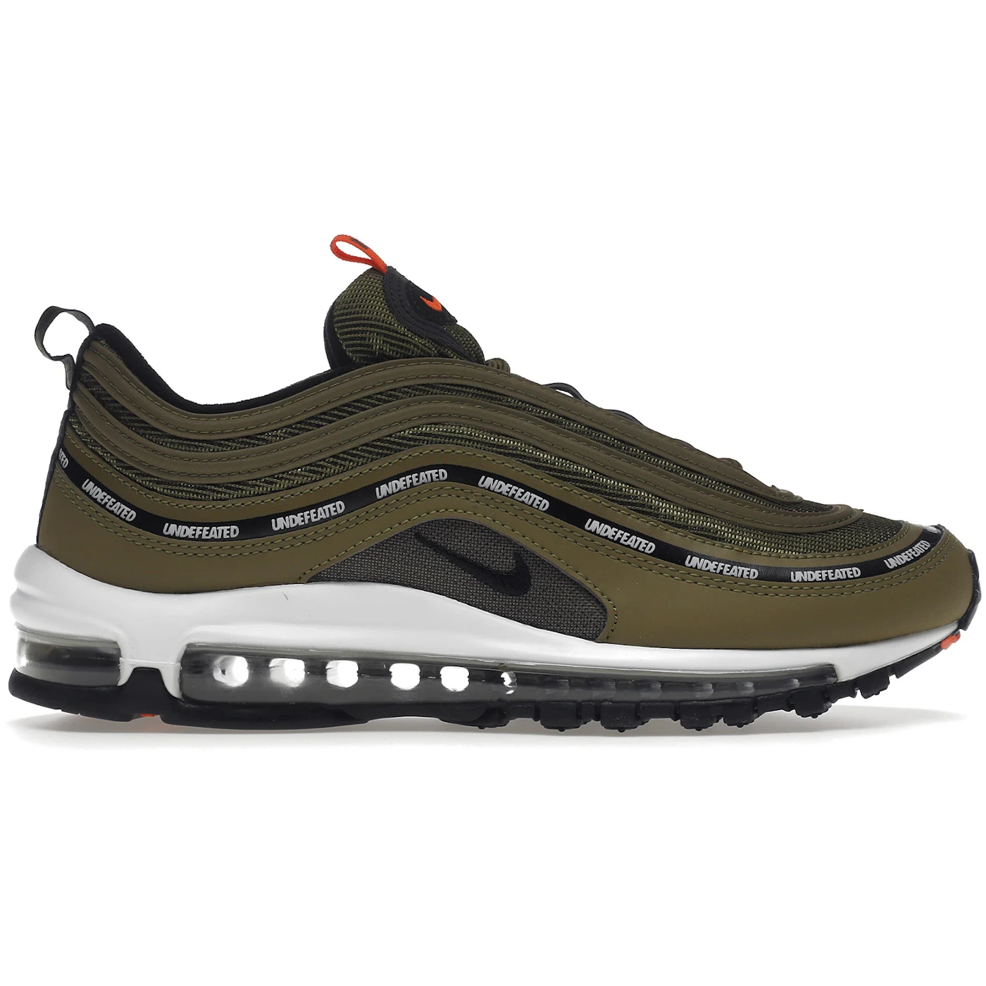 The UNDFTD X Nike Air collaboration brings back a coveted flight jacket-inspired colorway originally in this Nike Air Max 97 Undefeated Militia Green (2020). The Los Angeles retailer s take on the Nike Air Max 97 Undefeated Militia Green (2020) features olive green coloring throughout the mesh and leather upper, accented with a repeating string of Undefeated logos printed on the lowermost of the sneaker s wavy overlays. Touches of Orange Blaze are noticeable on the outsole, tongue patch and anterior pull tab, and underfoot, full-length Max Air provides cushioning.The Nike Air Max 97 Undefeated Militia Green (2020) was released in December 2020 and retailed for $180.