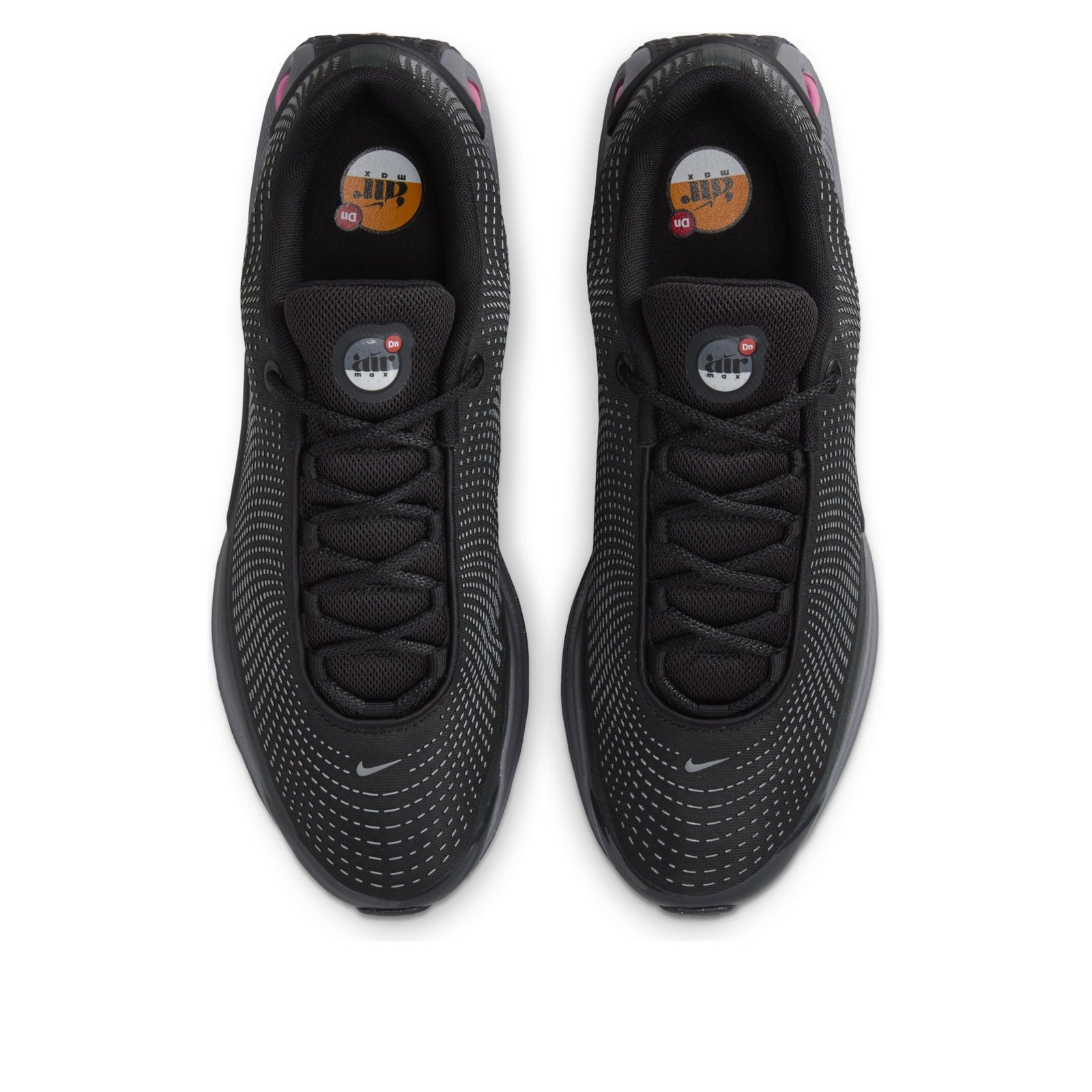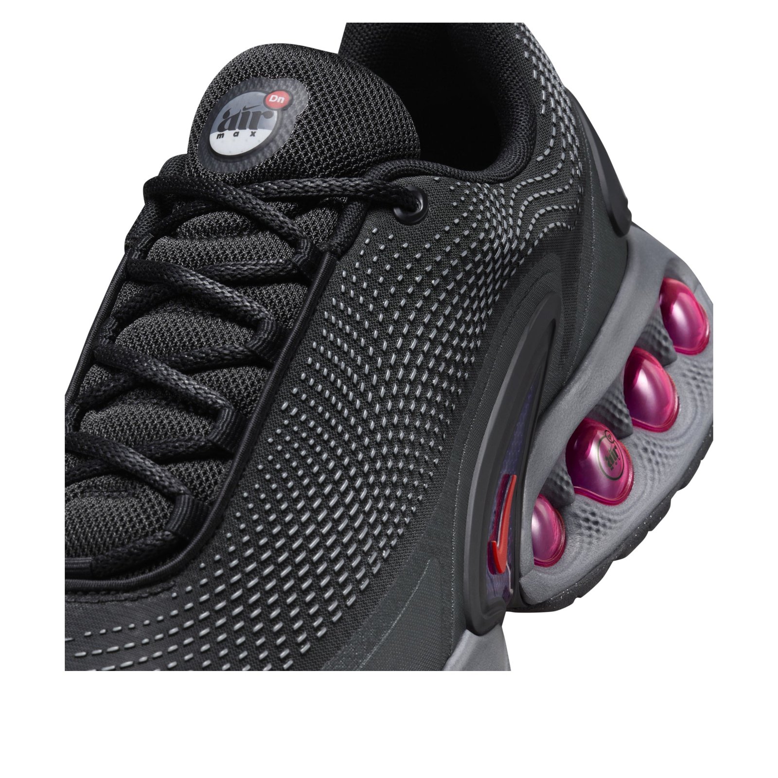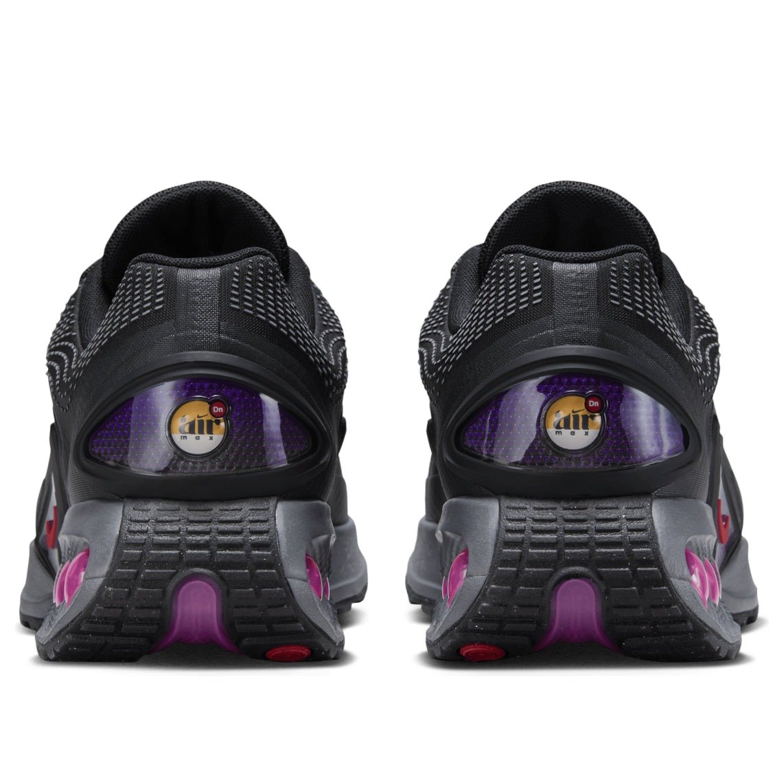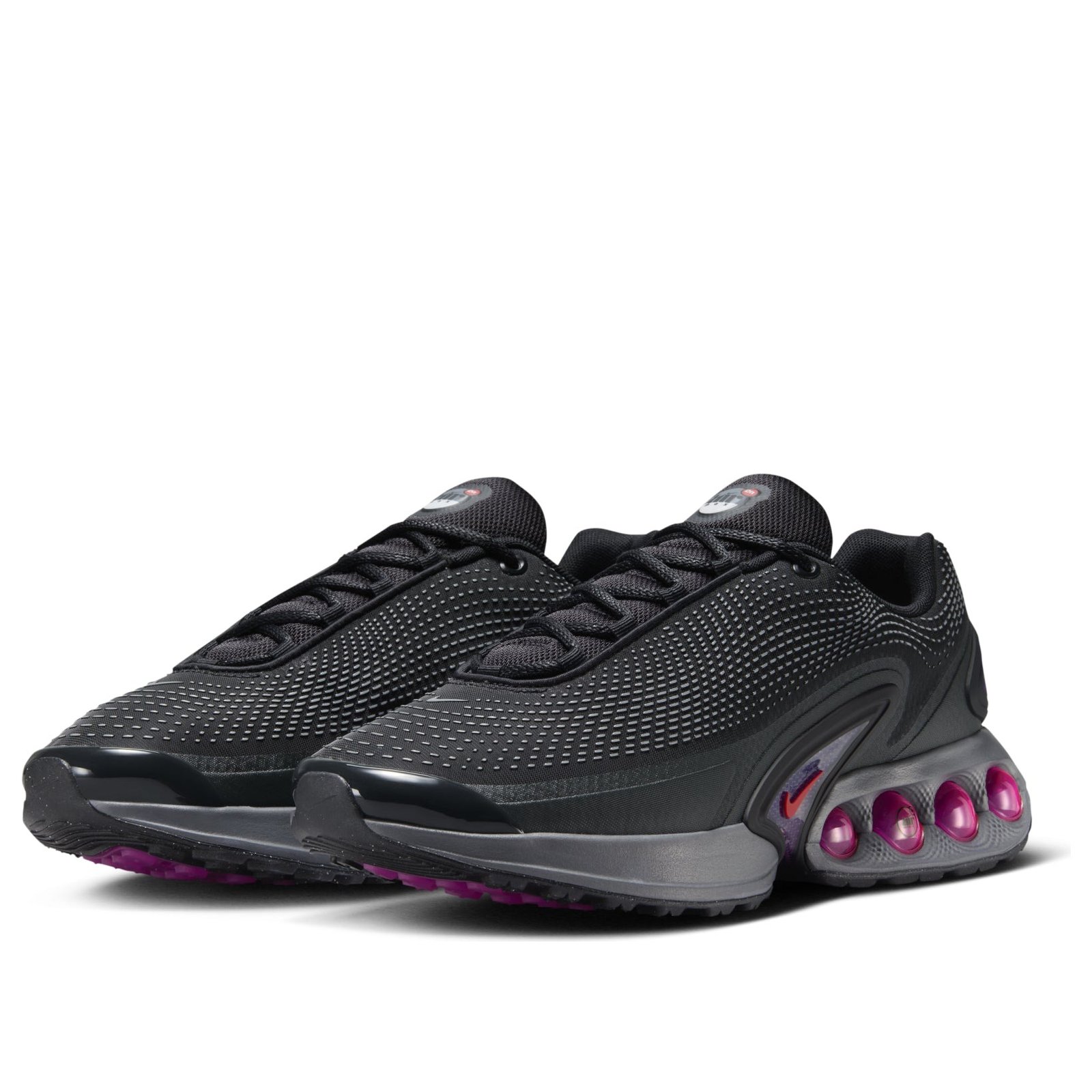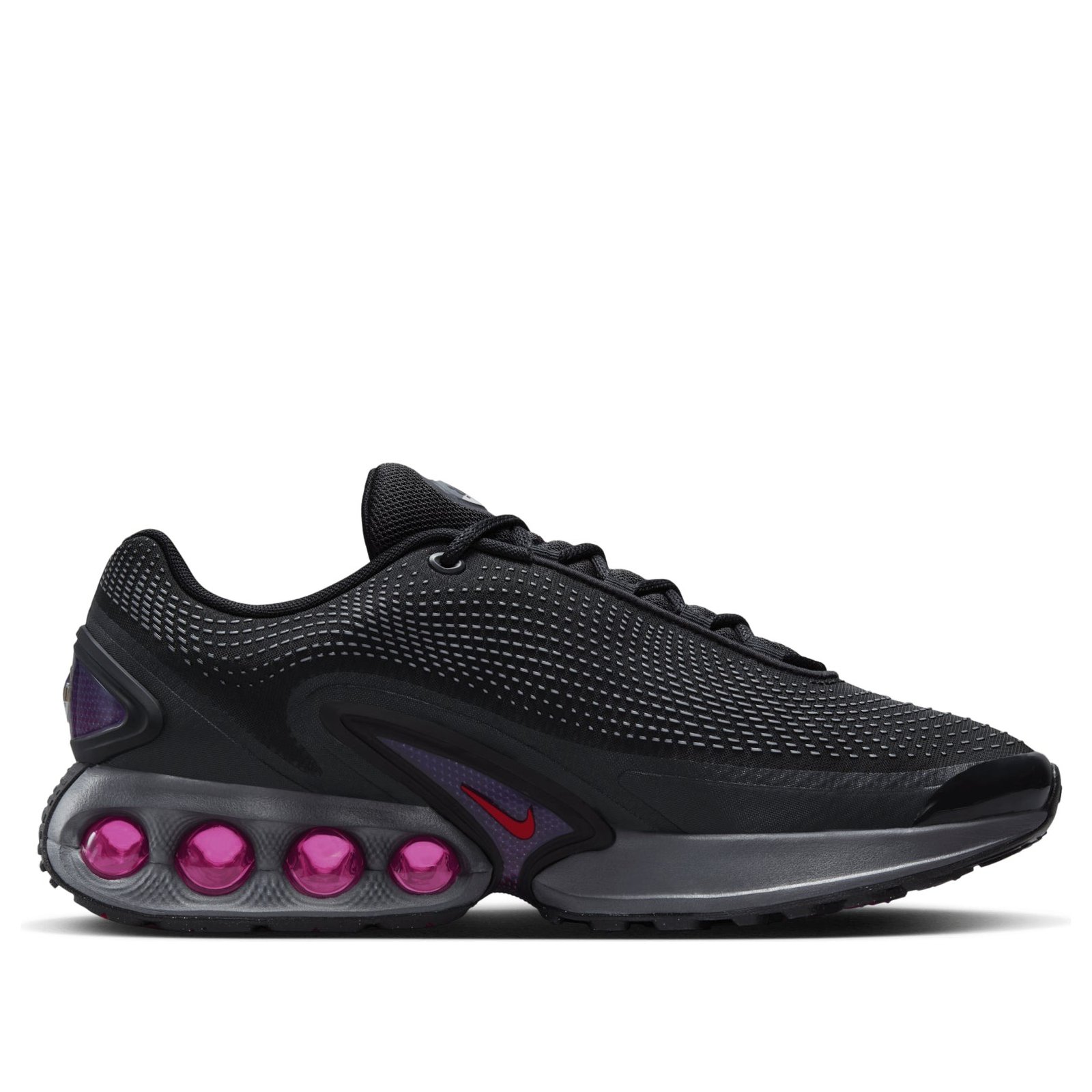 The Nike Air Max Dn All Night is a shoe containing the all new Dynamic Air Max unit in the heel with a few pops of color in the design.This iteration of the Nike Air Max Dn features a mostly black colorway. The breathable textile upper is accented with Dark Smoke Gray dashes, giving it a kind of haptic pattern. The bottom of the upper is supported with black outlines, while the Nike Swoosh shows up in the arches of the foot in a bright crimson color. Air Max logos can be seen both on the tongue and on the heel. The logo on the heel is situated within a shiny oval that fades from dark blue to dark pink. The Dynamic Air units visible in the heel also take on a pink color, adding another pop of vibrance to the otherwise all-black design.Our favorite feature of this shoe is the contrast between the black and pink/crimson that appears on the signature branding elements. The Nike Air Max Dn All Night was first released on March 26, 2024, for a retail price of $160.