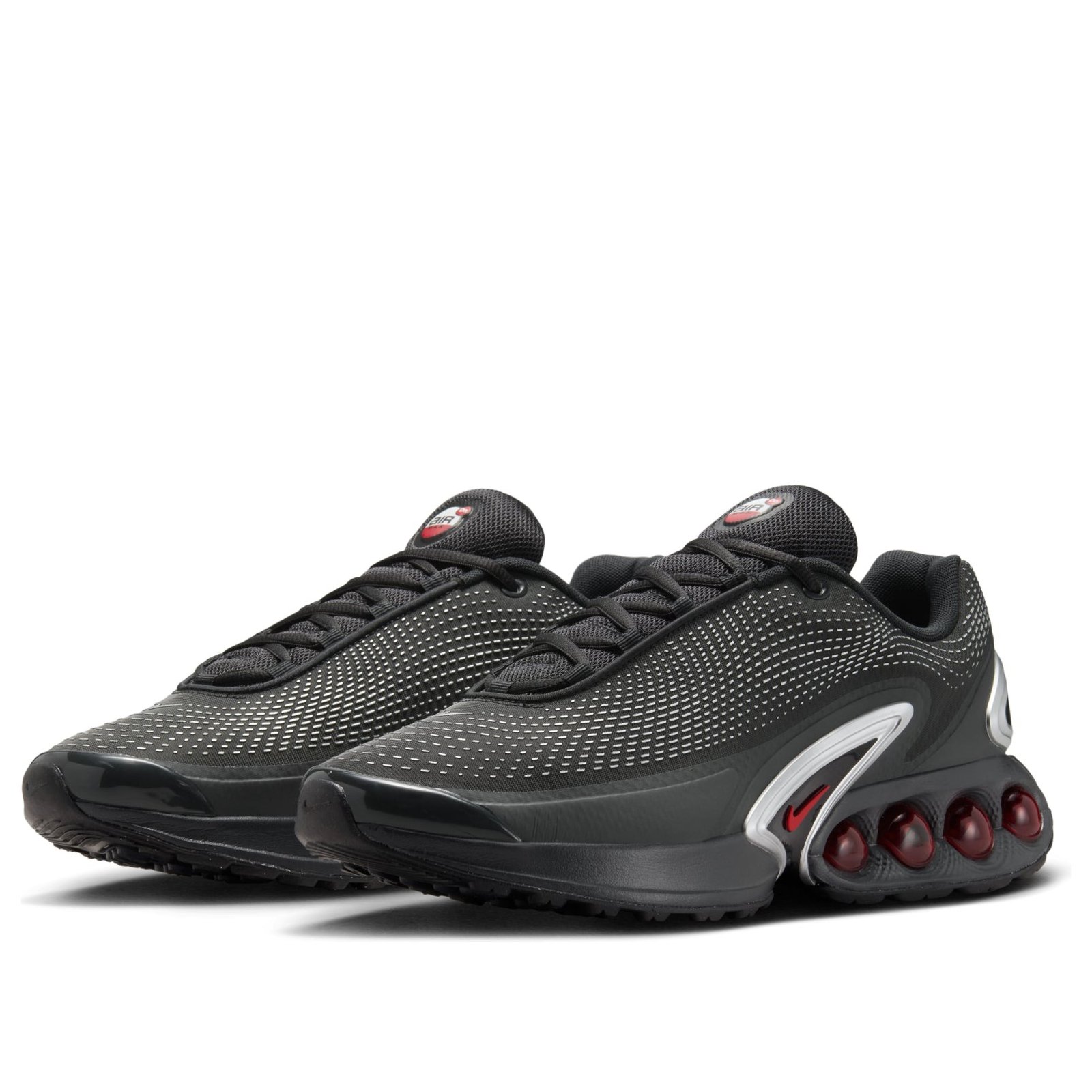 The Nike Air Max Dn Black Metallic Silver Red features a Black/Black/Metallic Silver/University Red colorway. This Nike Air Max Dn was first released for $160 on April 21, 2025.
