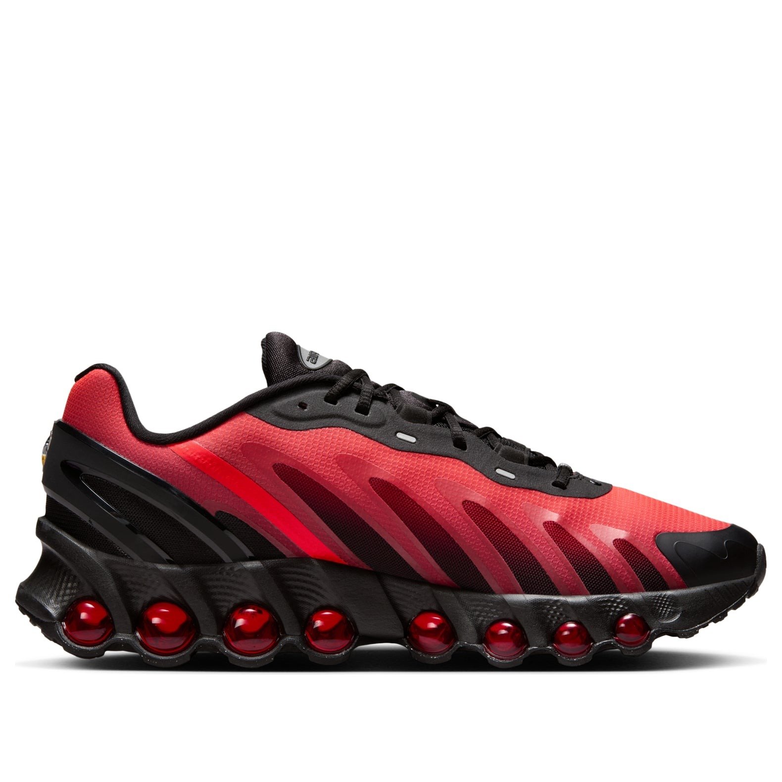 The Nike Air Max Dn8 Black Bright Crimson comes with a woven textile base with bright crimson panels and university-red stripes. There are eight pressurized Air units housed in a foam layer to give you dynamic responsiveness, and a rubber tread for durability, stability, and texture grip. The Black Bright Crimson Air Max Dn8 by Nike has a lightweight knit body with panels to reinforce the toe and heel. There are University-red Swoosh stripes on both sides. A TPU clip at the heel is there to stabilize each step, while the foam columns at the bottom hold the integrated Air cylinders beneath a foam layer. Here at Newsole, a few things we love about the Nike Air Max Dn8 Black Bright Crimson are the reflective heel tab, which increases visibility, and the removable foam insole, which supports custom orthotic inserts for personalized fit. It retailed at $190 when it was released on the 6th of March, 2025.