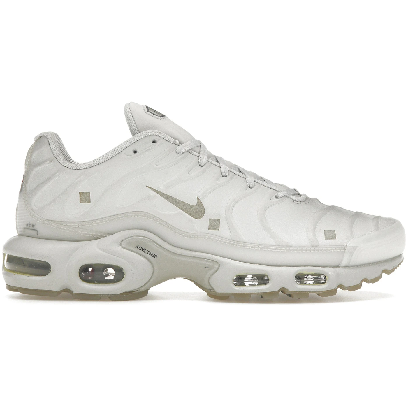 The Nike Air Max Plus A-COLD-WALL Platinum Tint is a collaborative sneaker from A-COLD-WALL (ACW) and Nike, featuring the Nike Air Max Plus silhouette in a Platinum Tint colorway.This Nike Air Max Plus features an Off-White leather upper with thermo-molded exoskeleton overlays, replacing the traditional mesh base and TPU overlays. Contrasting hits of Light Bone appear on the laser-etched Swooshes and compact squares on the sides. Branding details include “ACW” lettering on the shank plate and a co-branded tongue, insole, and heel. Other details include Off-White laces and “Tn” branding on the heel and sole unit. A matching Polyurethane (PU) midsole with visible Air cushioning at the heel and forefoot rests on a translucent rubber outsole. Something we love about this shoe is its contemporary design and unique color scheme, which contribute to its standout status. The Nike Air Max Plus A-COLD-WALL Platinum Tint was made available on September 21st, 2023, for a retail price of $210.