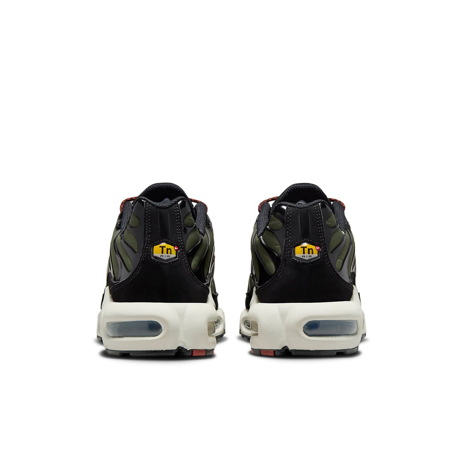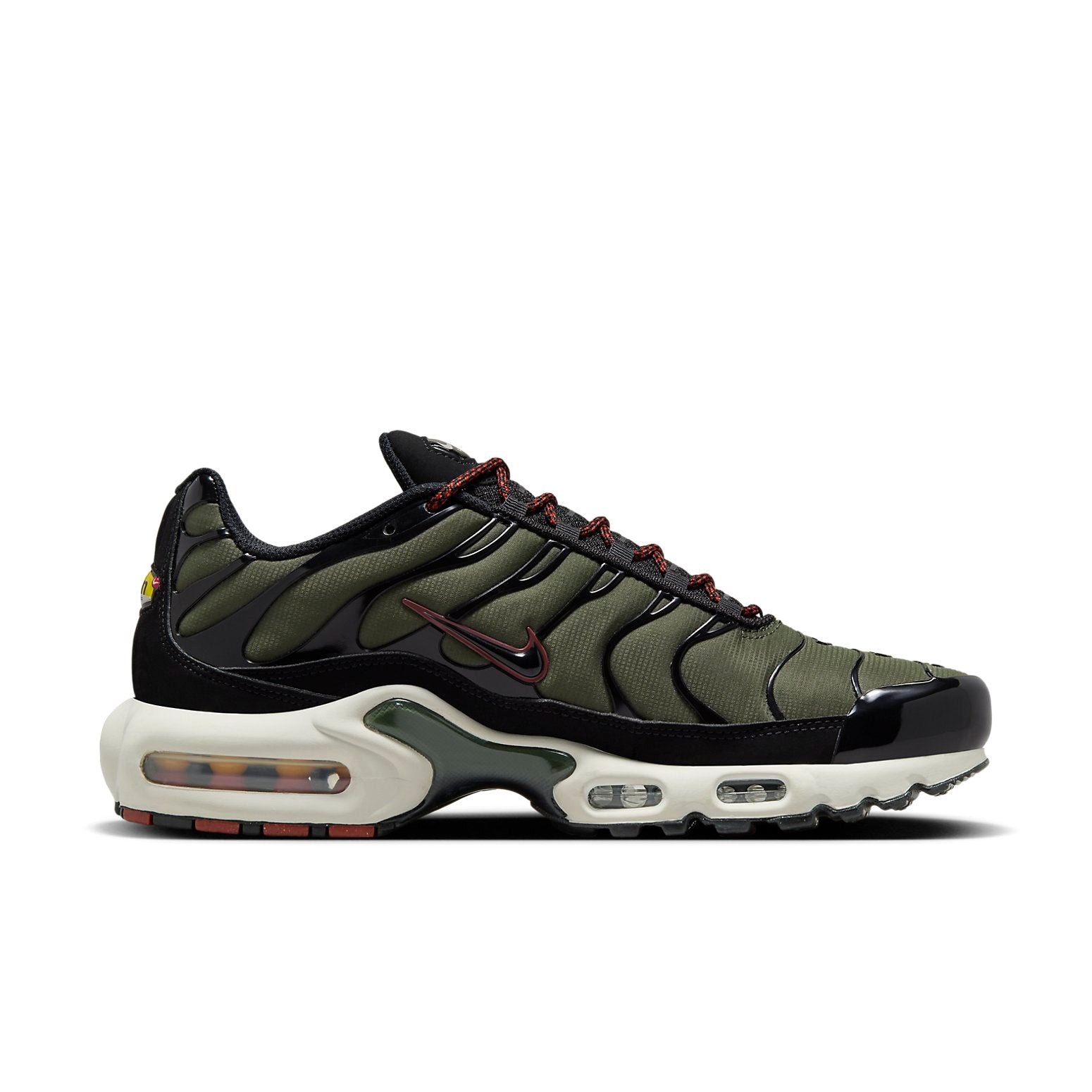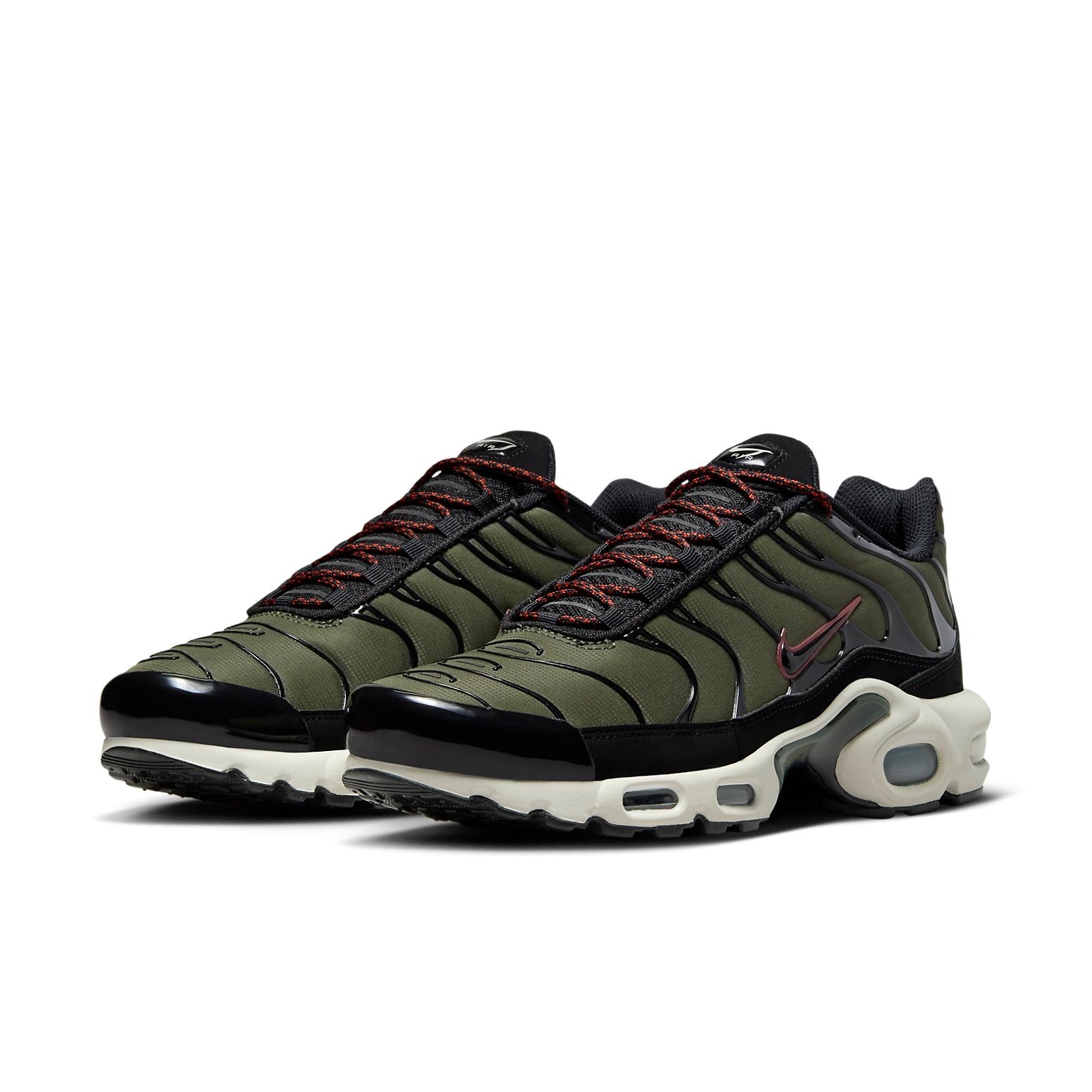 With equal measures of style and functionality, the Nike Air Max Plus Cargo Khaki Phantom is the ideal sneaker to have whether you re going to the gym or going out on the town. This iconic sneaker begins with an upper base of olive green tightly woven mesh that provides a lightweight step and breathability. A glistening black TPU cage undulates across the upper from toe to heel in wavy lines, offering foot support that’s integrated into the shoelaces. A white foam midsole houses visible cassettes of Tuned Air to provide springy takeoffs and soft landings with every step. The midfoot carbon fiber plate that offers stability and support matches the olive textile of the upper. The black rubber outsole has thick lugs to offer shock absorption and traction. The feature of this sneaker that we most enjoy is the addition of orange-red into the colorway. Hits of this contrasting hue accent the outsole, the side panel Nike swoosh outline, and the shoelaces, adding subtle contrast. The Nike Air Max Plus Cargo Khaki Phantom was released on November 16, 2023, for a retail price of $175.