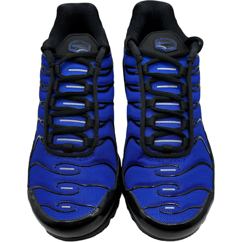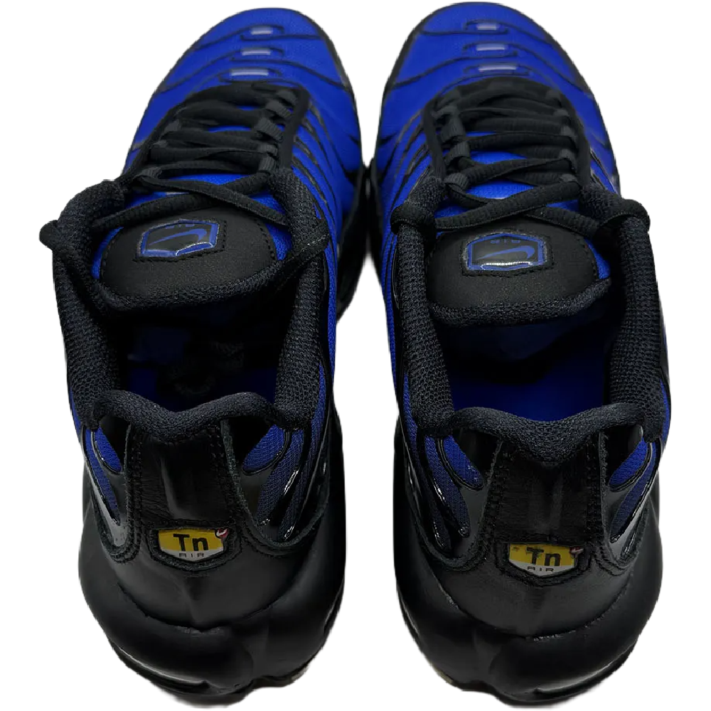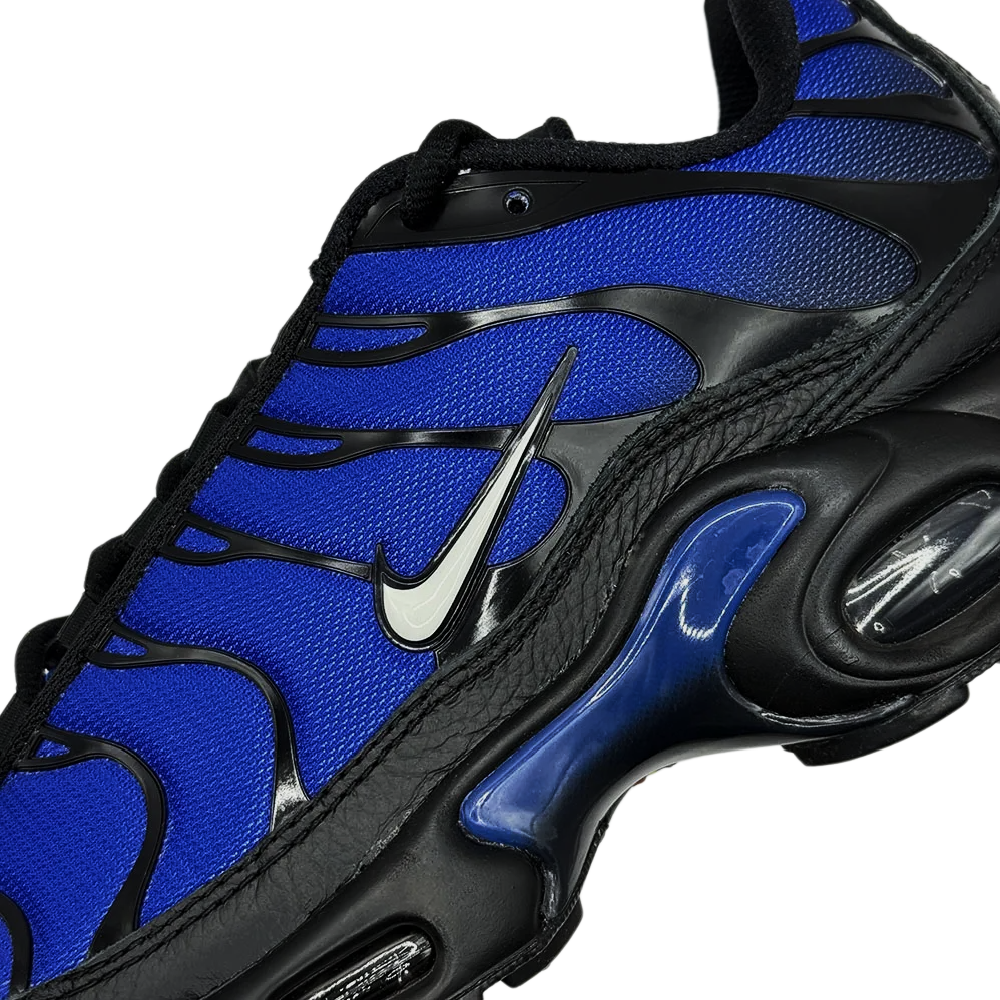 Inspired by nature, the Black Racer Bule Nike Air Max Plus Premium features wavy overlays that mimic waves or swaying palm palms. They support the airy mesh and give the upper a sense of mobility. The midfoot arch, which supports the foot and has a whale’s tale-like appearance, is another feature influenced by nature. The upper transitions from black to racer blue starting at the heel, and a black real leather mudguard encircles the shoe. Visible Nike Air components in the sole unit provide lightweight support and give the sneaker a technological look.