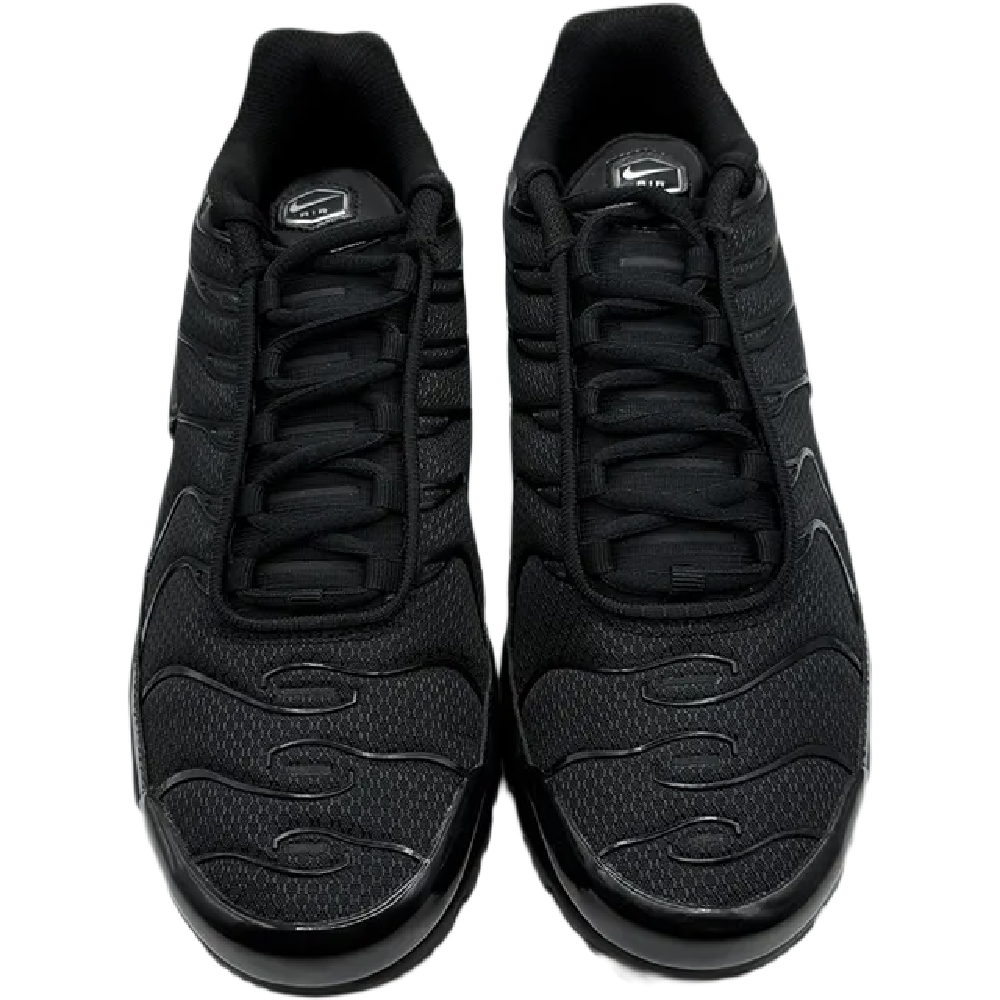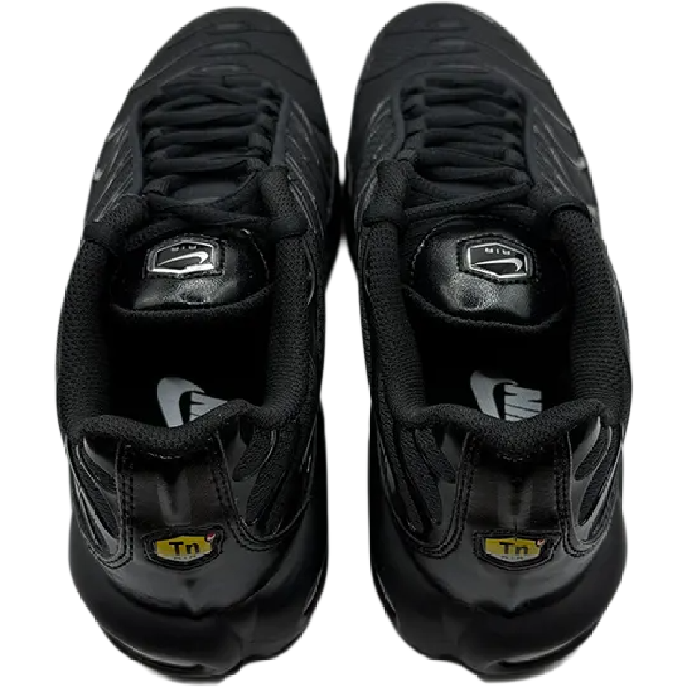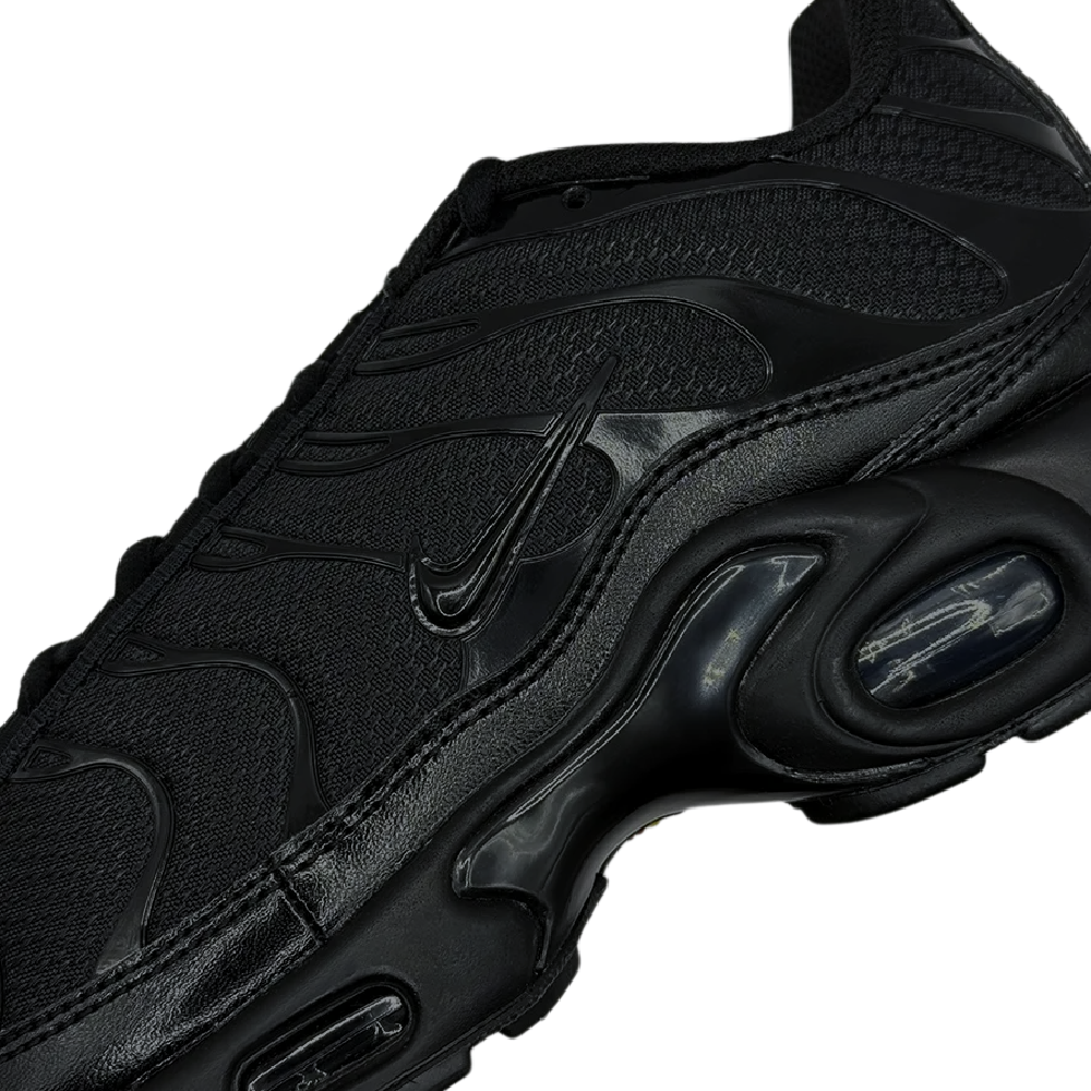 An all-black version of the Nike Air Max Plus is called the Nike Air Max Plus Triple Black. This shoe, which was released in advance of the Nike Air Max Plus’s 20th anniversary, has a low mudguard, textured ankle strip, edgy TPU ribbing, an external toe cap, and a breathable synthetic upper with closed mesh inserts. It also has a Max Air sole unit and a lightweight midsole with Tuned Air technology.