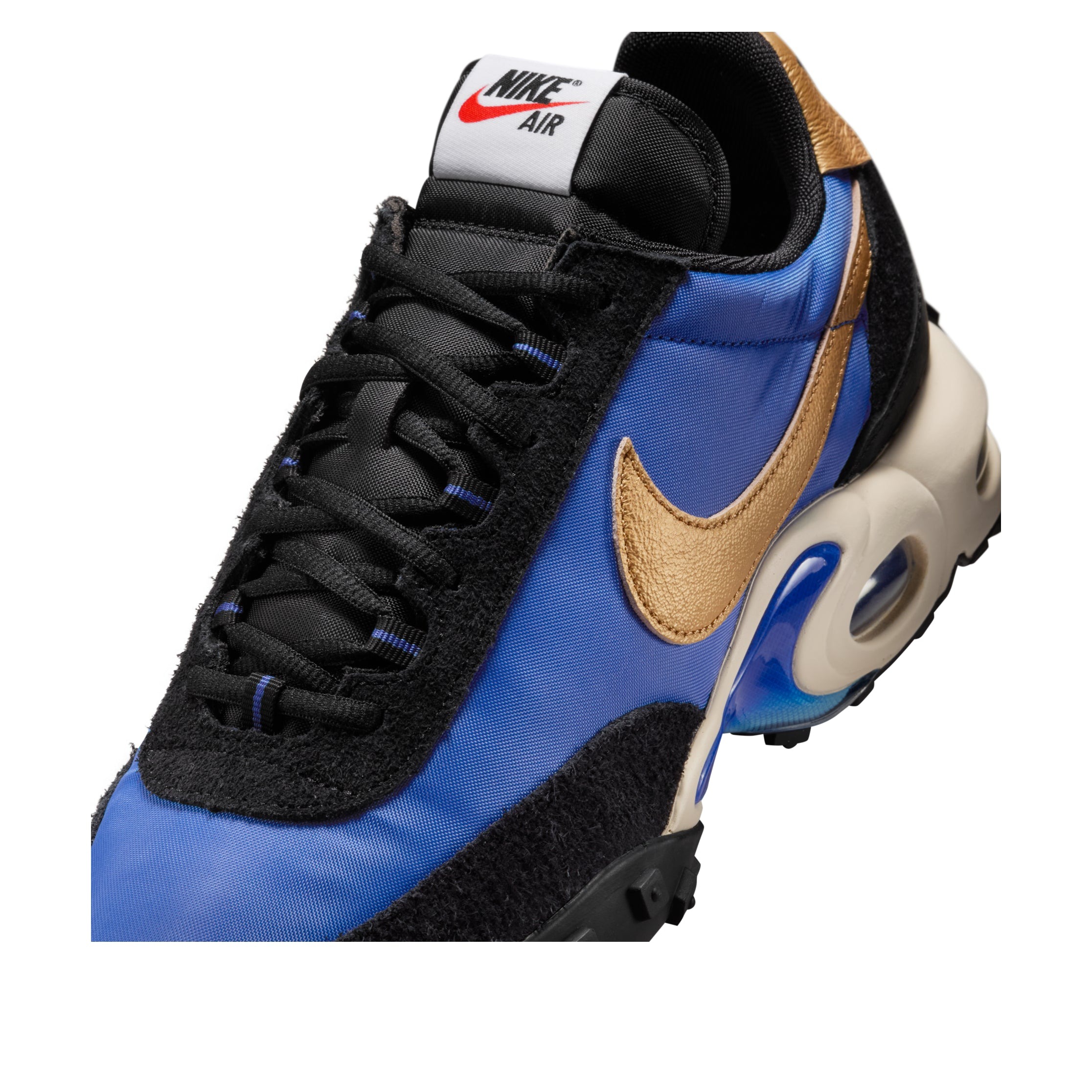 The Nike Air Max Waffle Racer SP Hyper Blue Metallic Gold blends two icons, Air Max cushioning and the legendary waffle outsole, into a striking, street-ready silhouette. Drenched in Hyper Blue with Metallic Gold accents and grounded by bold black detailing, this colorway turns heads while staying versatile for everyday wear. A sculpted midsole with visible Air cushioning softens each step, while the grippy waffle traction pattern nods to Nikes trailblazing running heritage. Layered materials and clean paneling add depth and dimension, highlighting the swooping Swoosh and sharp lines that define the Waffle Racer SP. From morning commute to late-night meetups, the ride stays smooth and responsive without sacrificing style. Purpose-built details make the Nike Air Max Waffle Racer SP a standout in the rotation. Lightweight textiles and supportive overlays balance breathability with structure, and a padded collar enhances comfort around the ankle. The Hyper Blue/Metallic Gold/Black palette pairs just as easily with athletic staples as it does with elevated streetwear, making this a go-to for sneaker enthusiasts who value design and function in equal measure. With its heritage-inspired outsole, sleek Air Max tooling, and refined proportions, this model captures the energy of modern lifestyle sneakers while honoring Nikes roots. Style code FV6946-400 and a release date of March 20, 2025, round out the details for collectors and trendsetters alike. Our team loves this product because it delivers cushioned comfort, standout color, and everyday versatility in one timeless Air Max-meets-waffle package.
