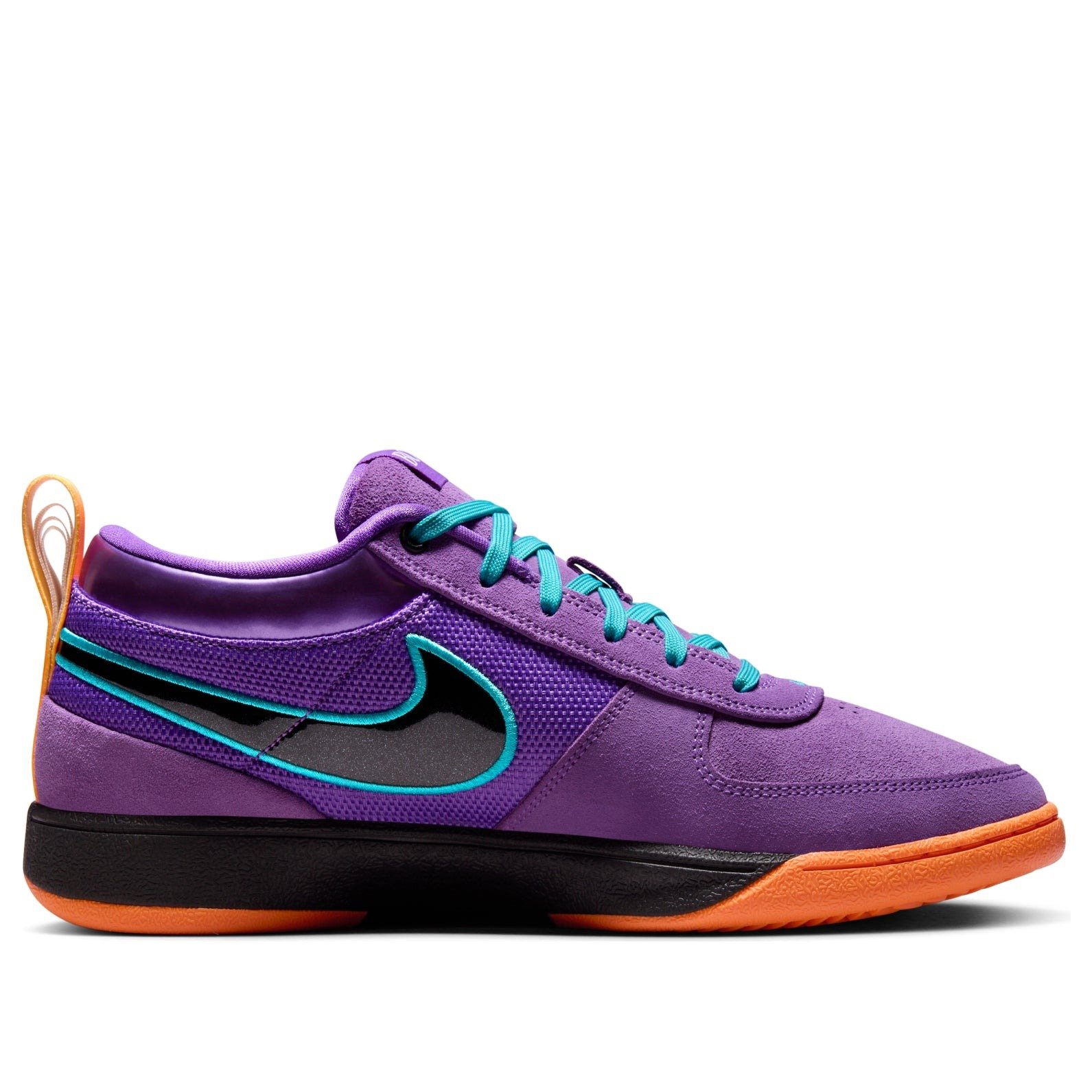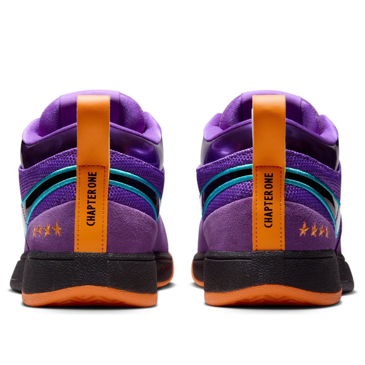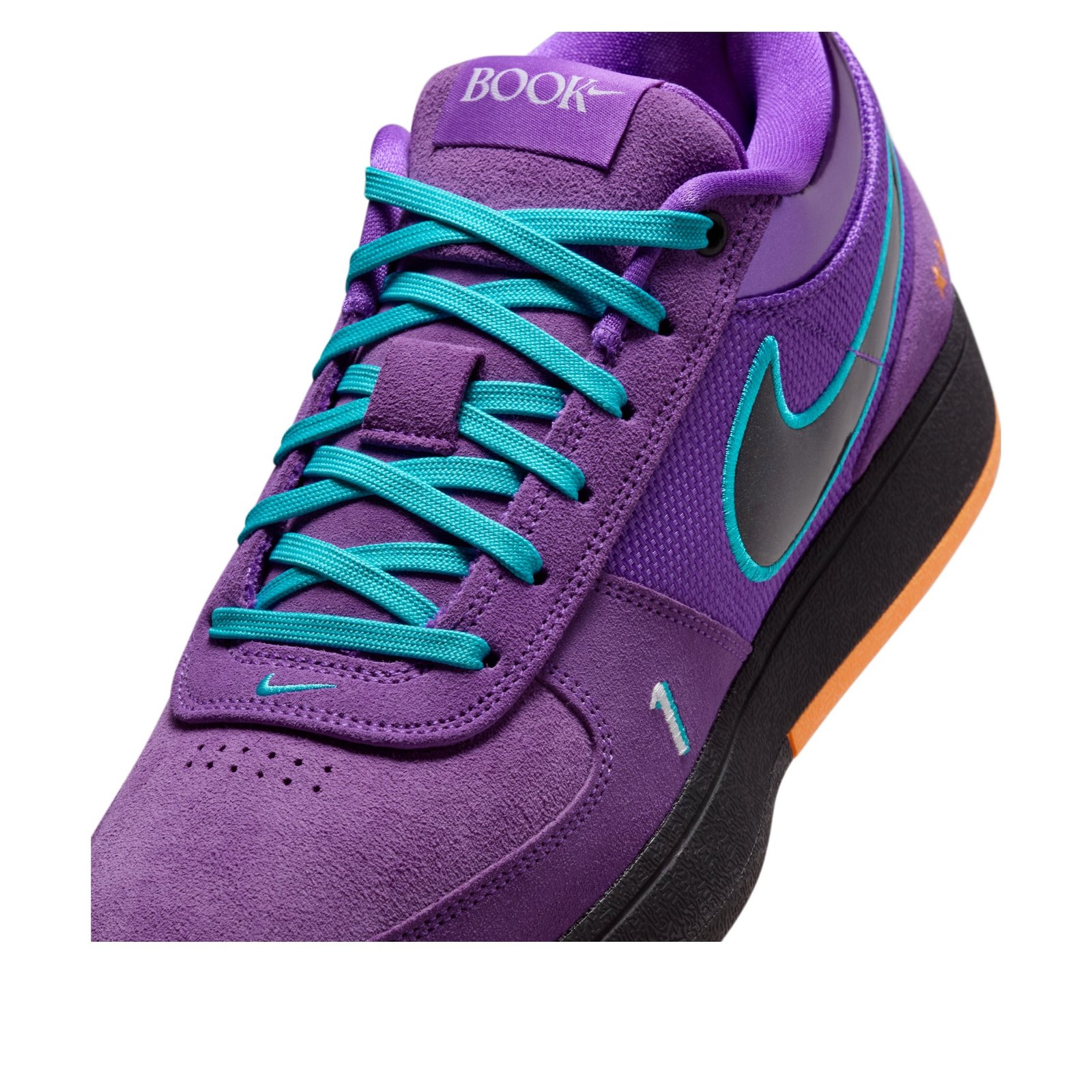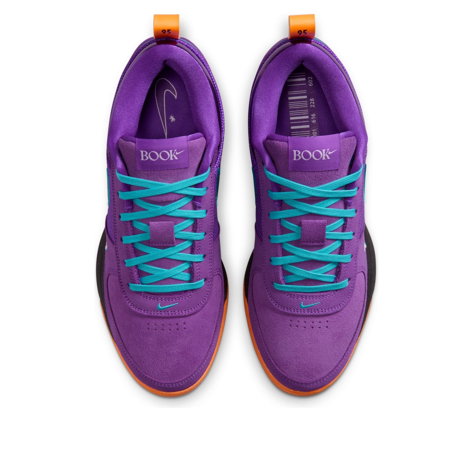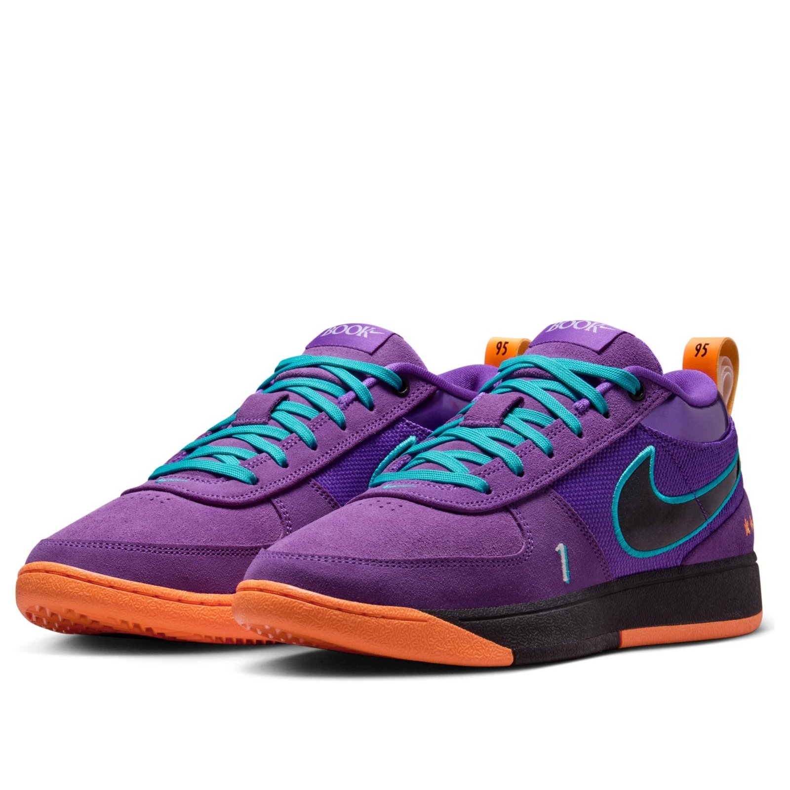 The Nike Book 1 1995 All-Star is a vibrant performance shoe that pays homage to the Phoenix Suns basketball team. This iteration of the Nike Book 1 has a base of Wild Berry purple mesh that forms the sides and heel area. Wild Berry suede forms the toe box and toe cap, with perforations located directly under the laces for added breathability. Shiny black Swooshes adorn each side with Dusty Cactus blue outlines, which match the laces. Book branding is found on the tongue, while the Bright Mandarin heel pull tab contains the words “Chapter One.” A white and blue “1” is also found on the lateral toe, and three orange stars on the lateral heel. The shoe features a black midsole and an orange outsole. Our favorite thing about this shoe is its bright colorway, which is eye-catching no matter how you spin it, and the patterned outsole. The Nike Book 1 1995 All-Star was released on May 2, 2025, for $150.