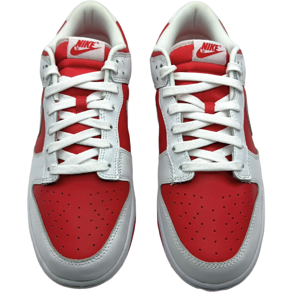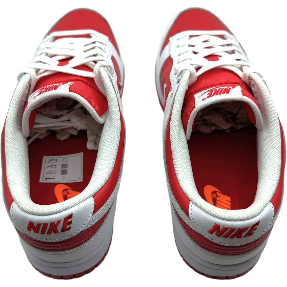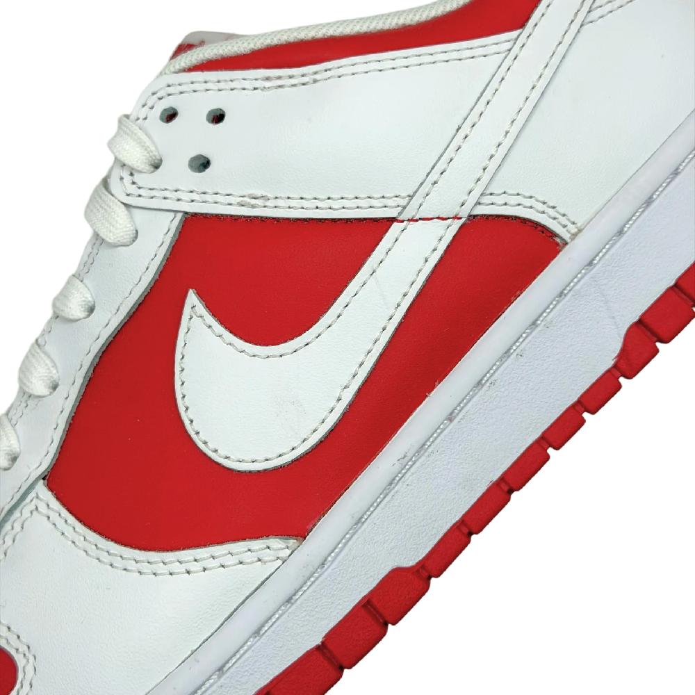 The Nike Dunk Low Championship Red features a University Red leather upper with white leather overlays and Swooshes. A matching sole and woven tongue label adds the finishing touches to this retro design.