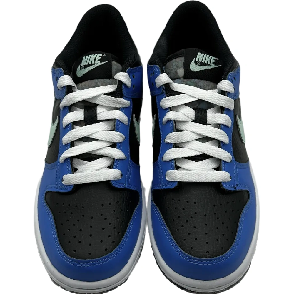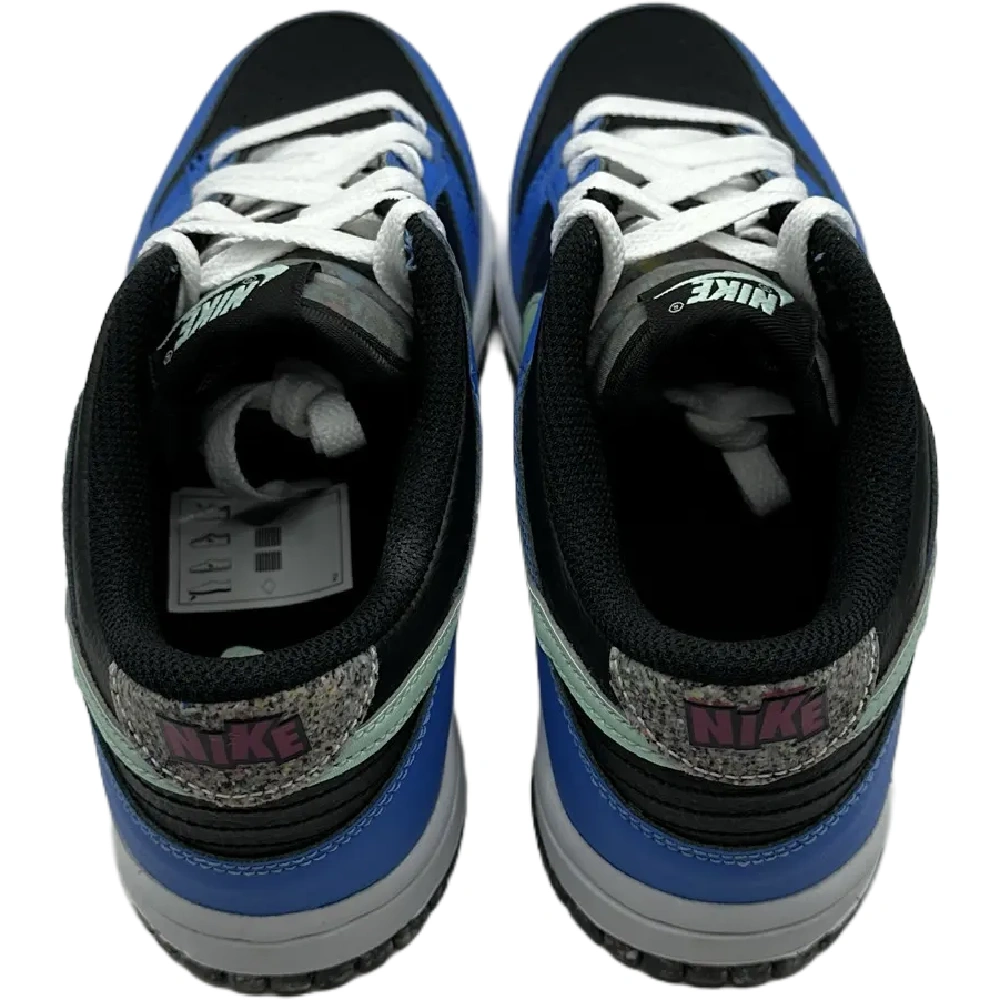 The upper of the Nike Dunk Low Crater Blue Black (GS) has royal blue overlays on a black foundation. On the lateral and medial sides, a turquoise green Swoosh can be seen, neatly matched with the Nike logo on the tongue. The upper is completed by white laces and a crater heel tab. The midsole and Nike Grind outsole also feature the same color combination.