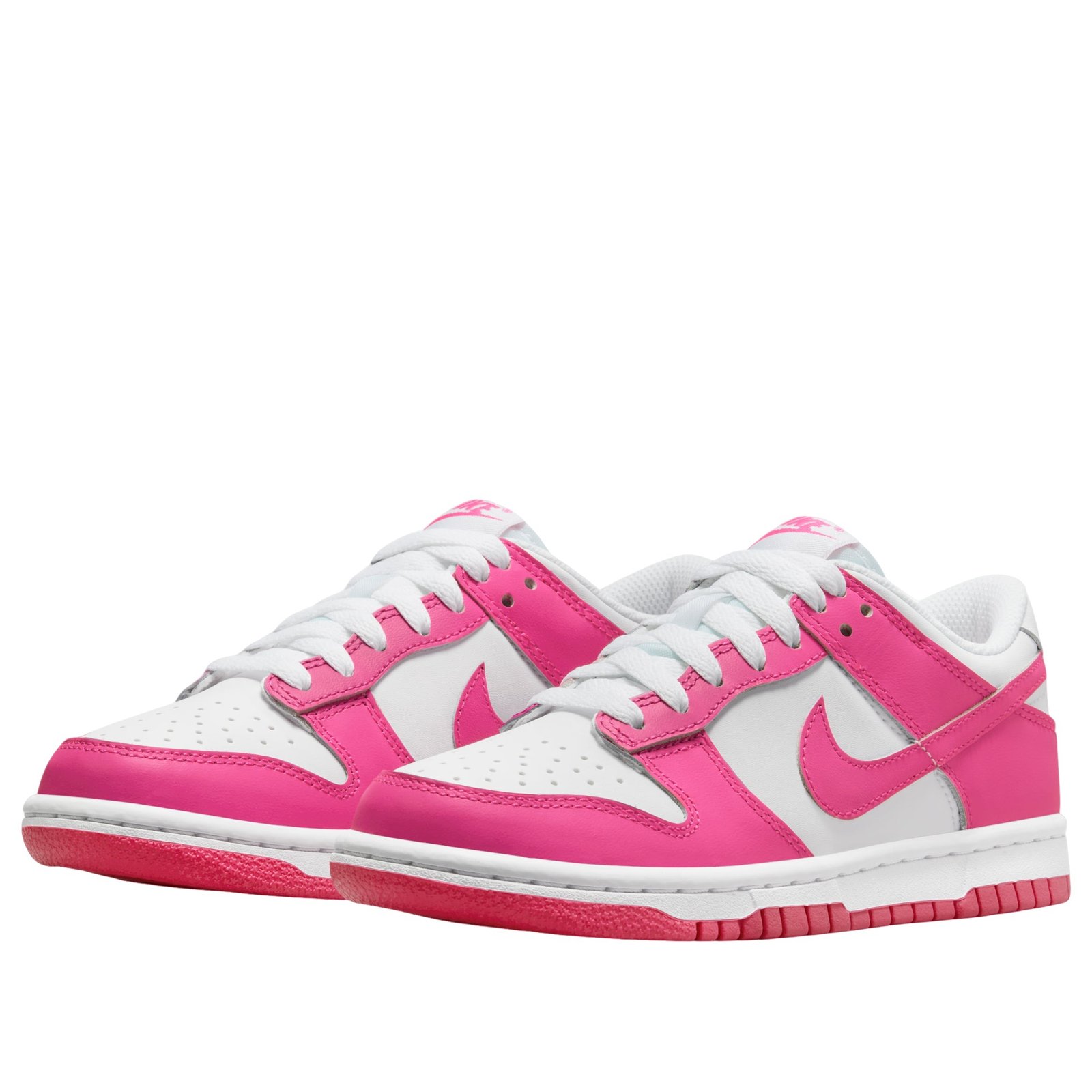 The Nike Dunk Low Laser Fuchsia (GS) offers an iconic silhouette dressed in a crisp, clean, dual colorway that Nike rolled out exclusively for kids. This sneaker sized specifically for grade school kids will garner attention on the playground with its eye-popping colors.The Laser Fuchsia Nike Dunk Low-Top for Grade School kids sports classic color blocking that starts with a pristine base of white leather with signature perforations in the toe box. This white is echoed in the leather heel tab, the laces, the tongue, and the mesh sock liner. Overlays of smooth fuchsia leather adorn this shoe, providing hits of bright contrast. The insole is also bright pink with white Nike branding, and fuchsia Nike branding adorns the heel and woven tongue tag.What we enjoy most about this colorful sneaker is the way the sole unit locks in the colorway. The white foam midsole with tonal stitching and the fuchsia rubber outsole with pivot traction lock in the iconic look of this shoe. The Nike Dunk Low Laser Fuchsia (GS) was released on October 24, 2022, for $90 retail.