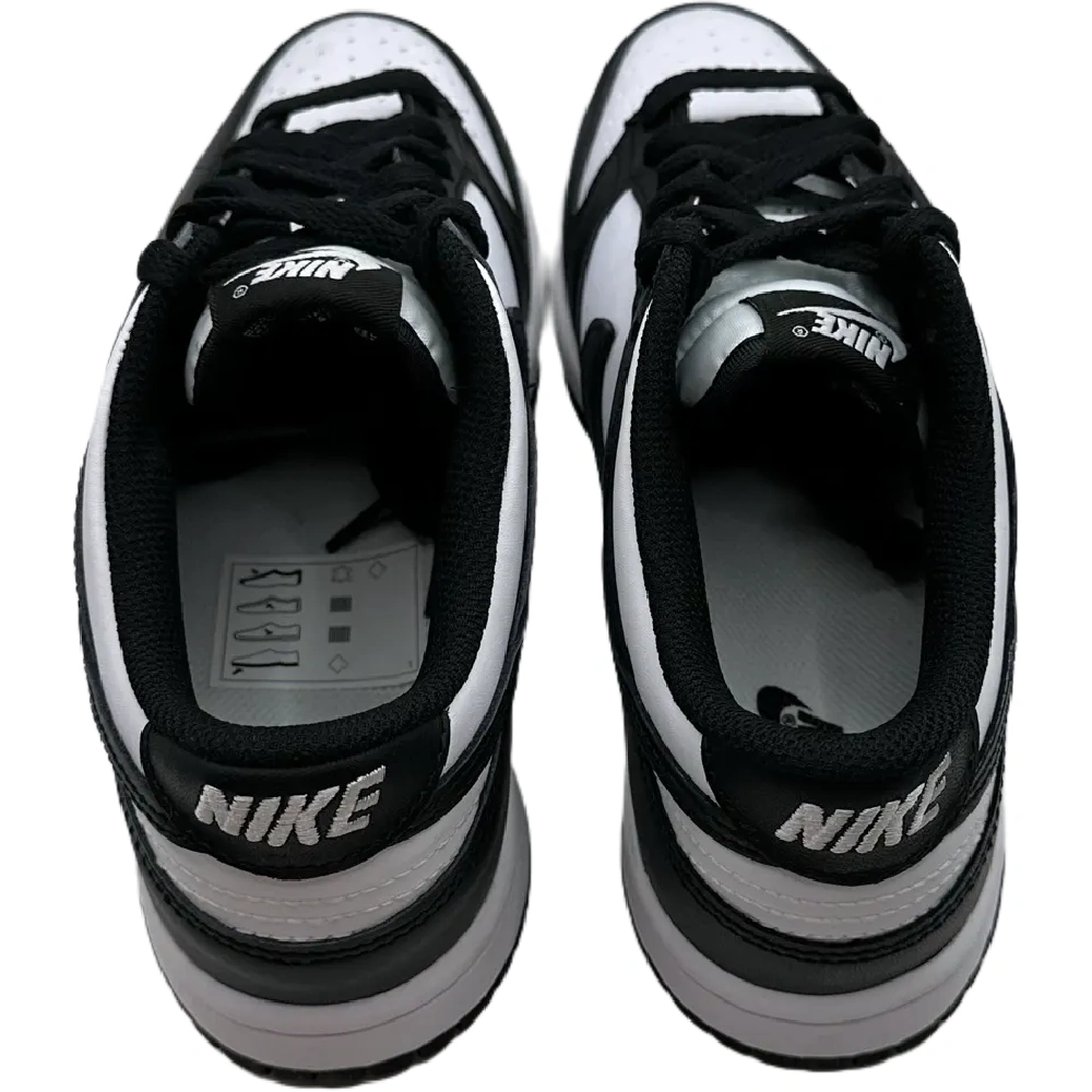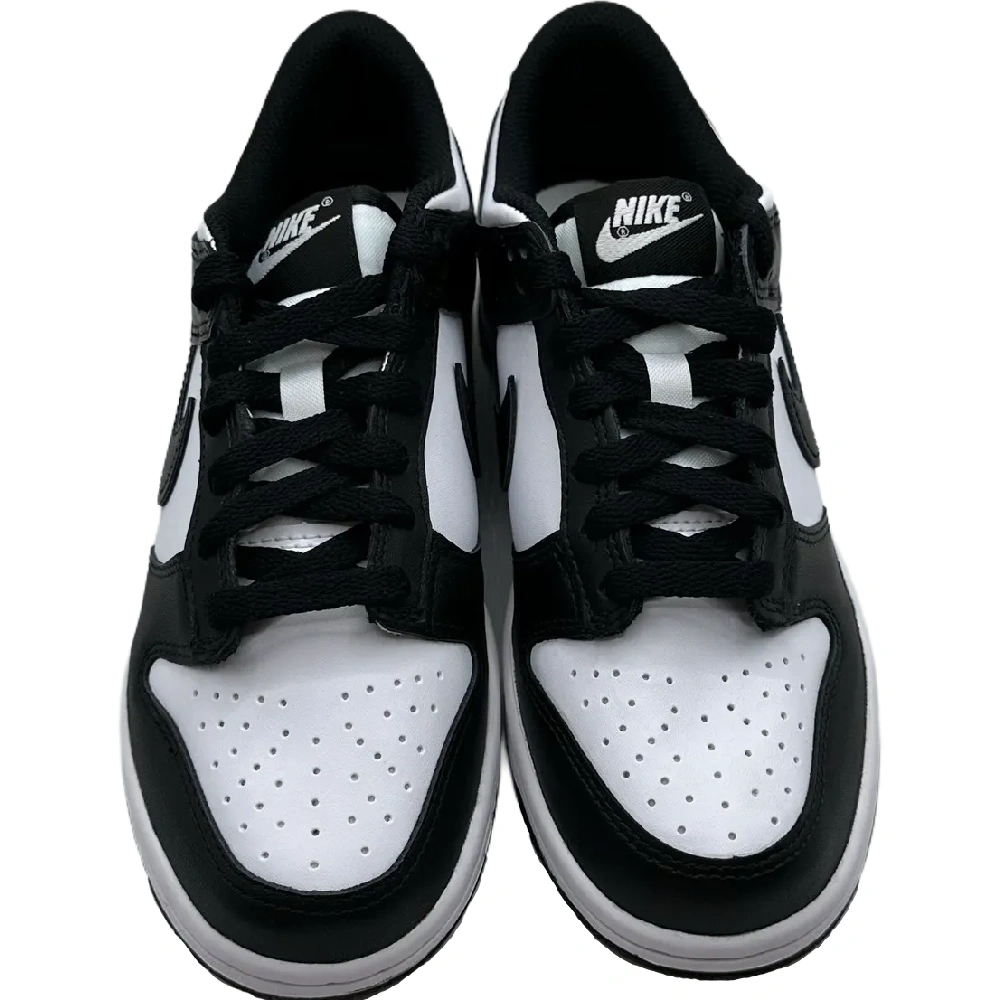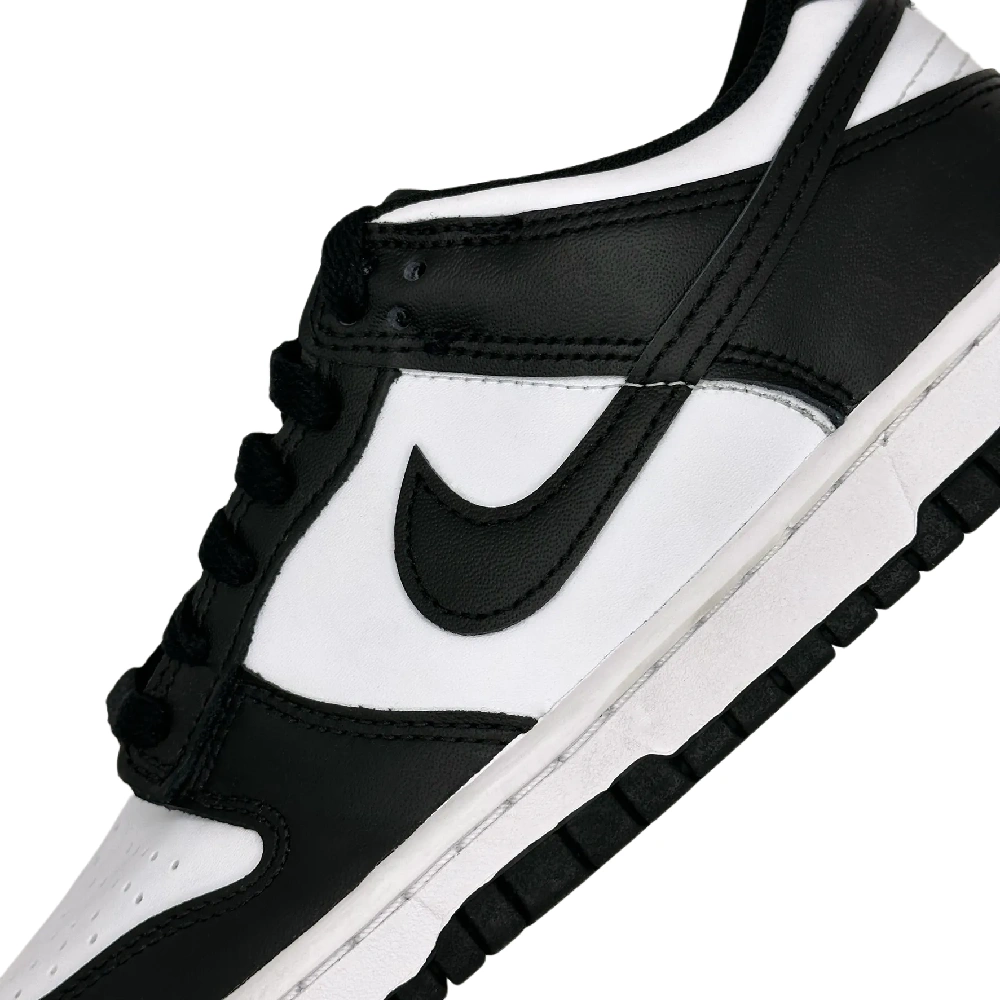 The Nike Dunk Low Panda Black & White (GS) silhouette is constructed entirely of fine leather and comes in a stark black and white colour. Additionally, white Nike lettering accents the back ankle support of the silhouette, and the tongue is decorated with the Nike Air text and the standard Swoosh logo. The appearance of this Dunk Low Retro shoe is completed by a white midsole sitting atop a black outsole, sticking with the color scheme.
