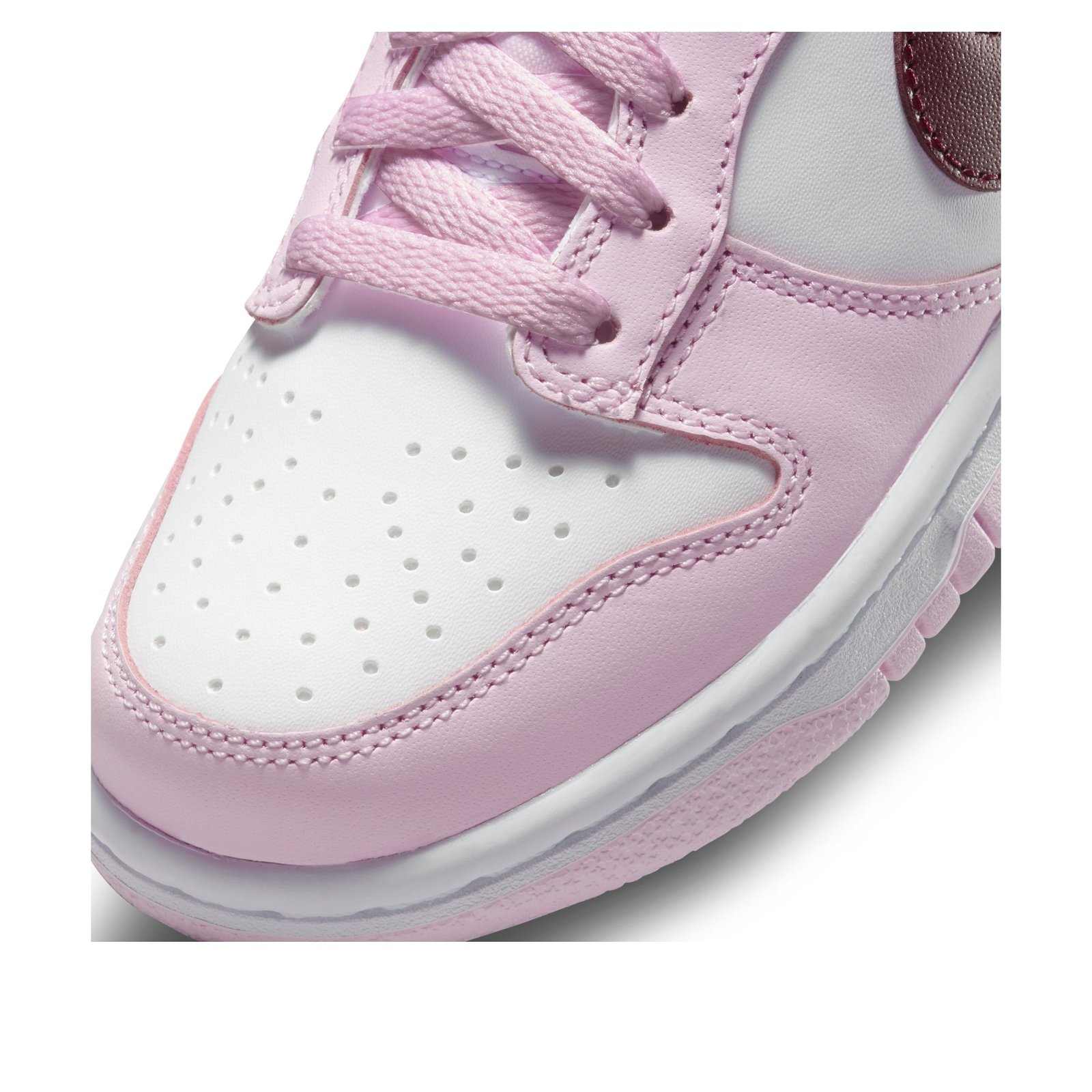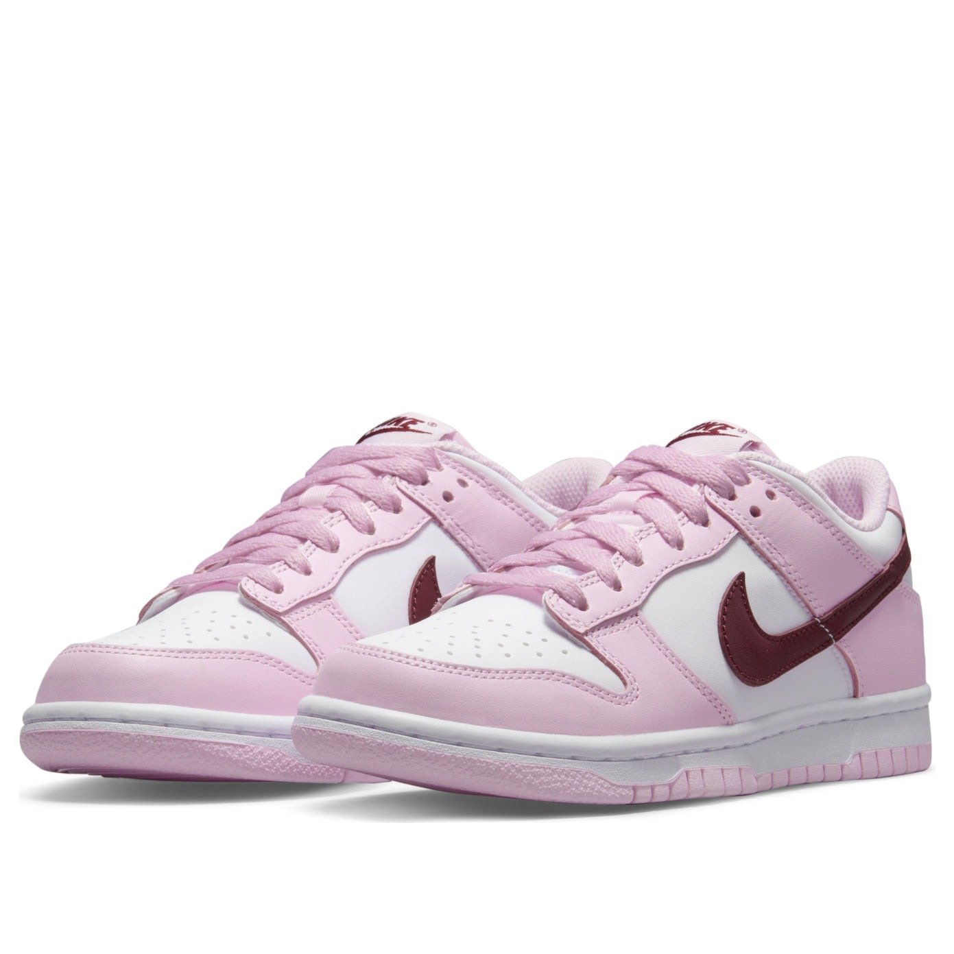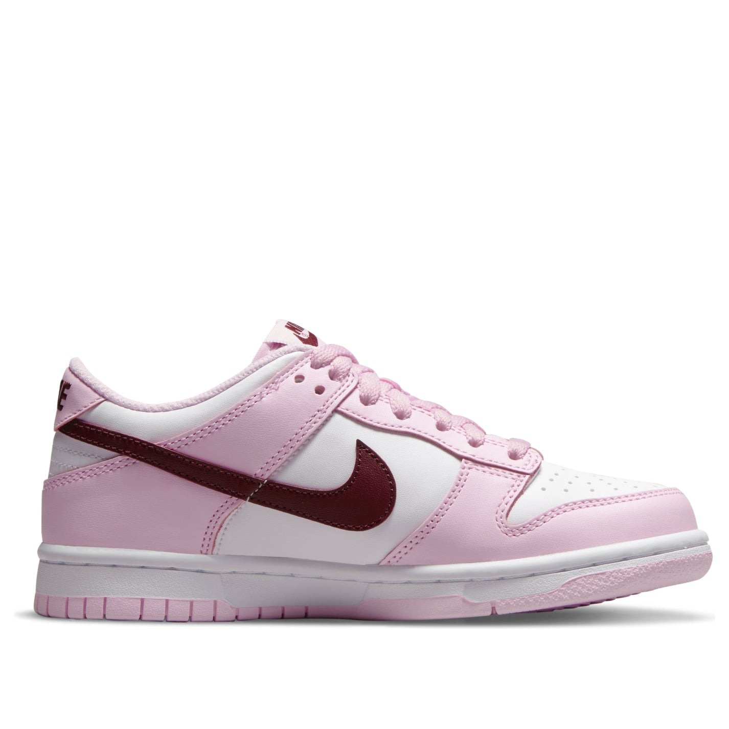 The Nike Dunk Low Pink Red White GS features a white leather upper complemented by pink overlays and a deep red, purple-like shade marking the Swoosh. The pink continues to the mudguard, lacing system, and heel, while underneath, the Nike Dunk keeps its classic color blocking with a white midsole and a pink outsole and treading. The grade school-sized Nike Dunk Low Pink Red White GS was released in August 2021 and retailed for $85.