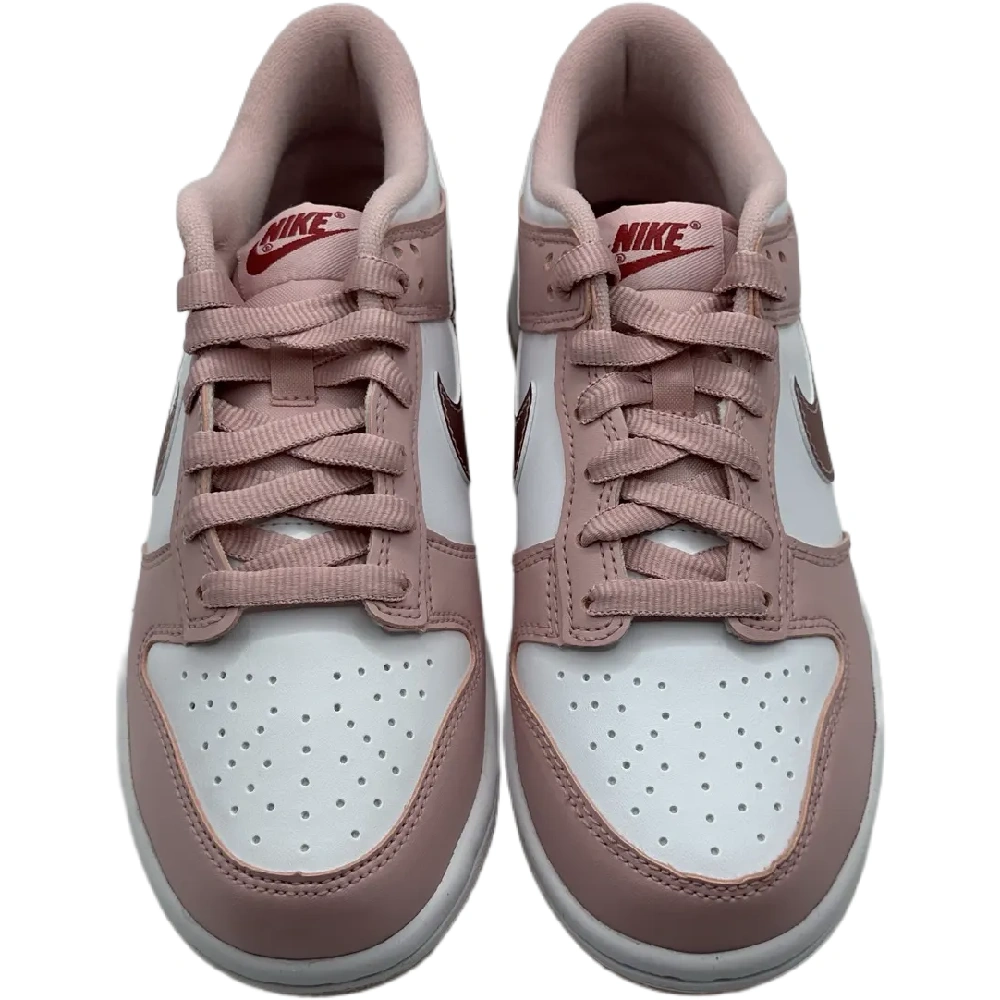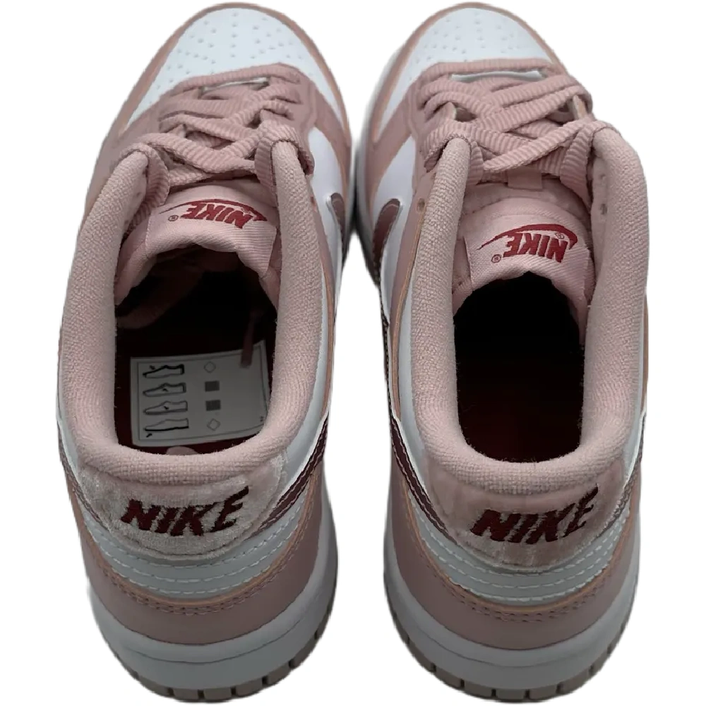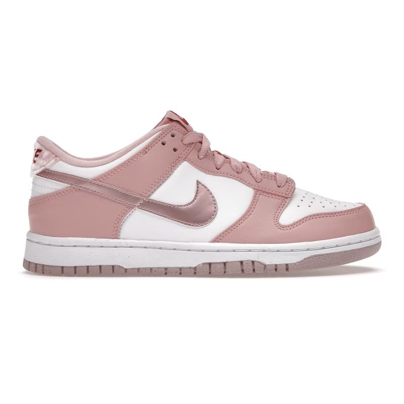 The white leather upper of the Nike Dunk Low Pink Velvet (GS) is accented with pink leather overlays and metallic pink Swooshes. The design is finished with a pale pink, semi-transparent outsole, woven tongue label, and a velvet heel tab bearing the Nike logo.