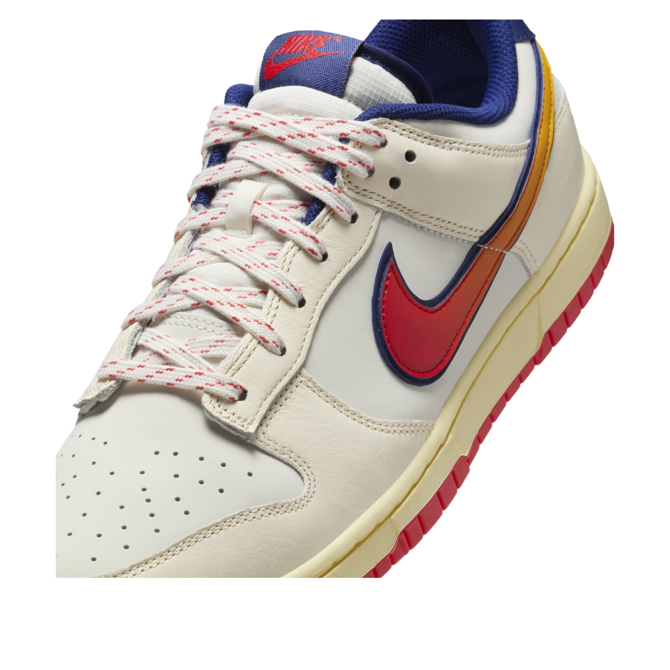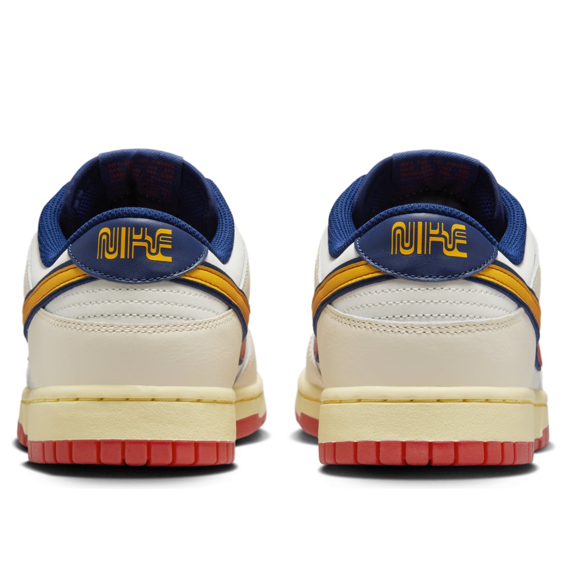 The Nike Dunk Low Retro Lettering is a low-top silhouette featuring design elements reminiscent of the 1970s style. This iteration of the Nike Dunk Low has a base of calf leather in a Sail white color. This forms the entire upper section, which is paneled for added support. The toe box is also perforated for breathability. The Nike Swooshes appear in a gradient from yellow to orange on each side, while a Navy heel collar bearing Nike branding in a curvy retro font in orange is visible on the back. The tongue also contains a branding patch, and Navy outlines are seen around the Swooshes and the ankle area. The shoe sits on a thin Sail midsole and an orange outsole. What stands out about this shoe are the bright Swooshes, white laces, and patterned soles, which add even more of a retro vibe. The Nike Dunk Low Retro Lettering was released on February 16, 2025, for $115.