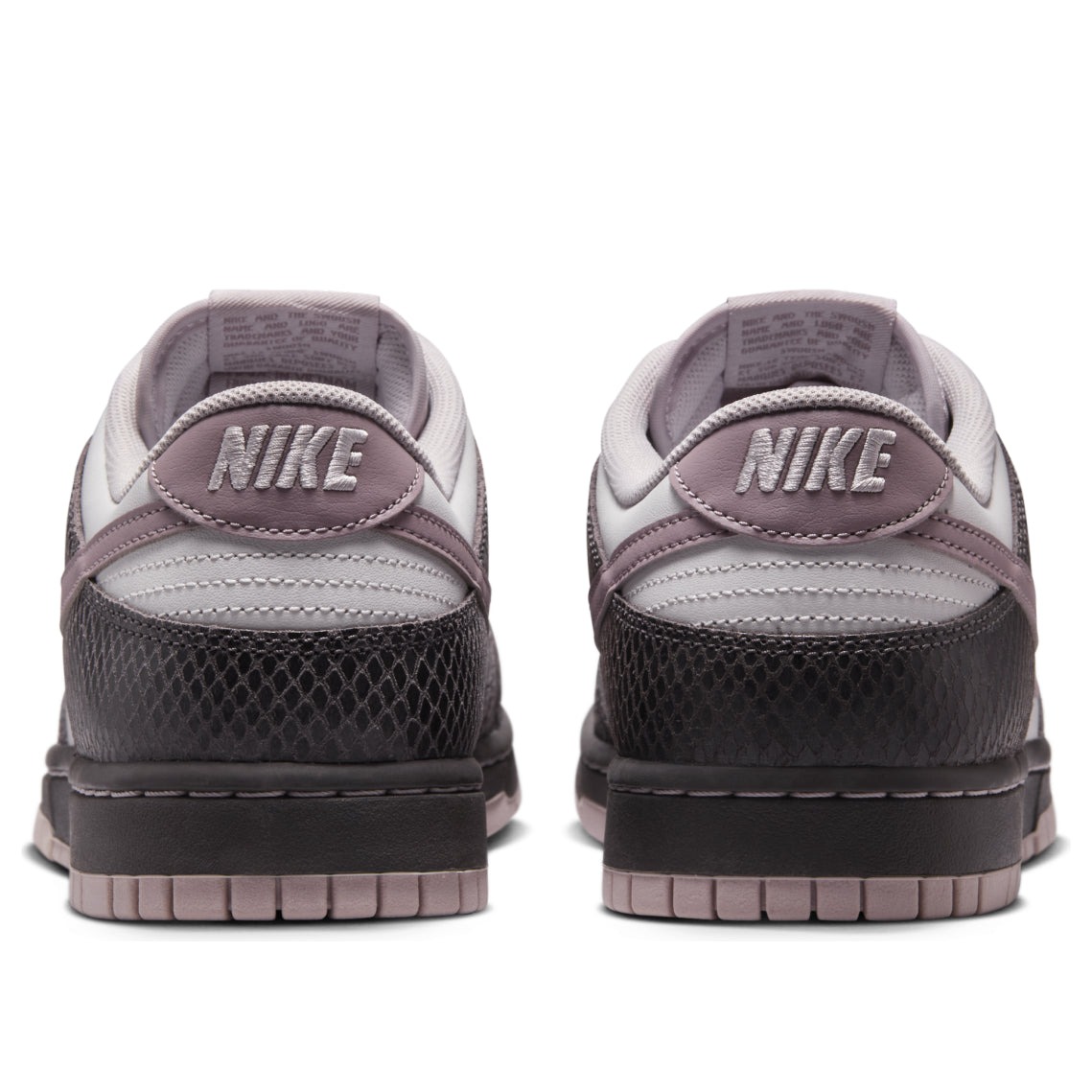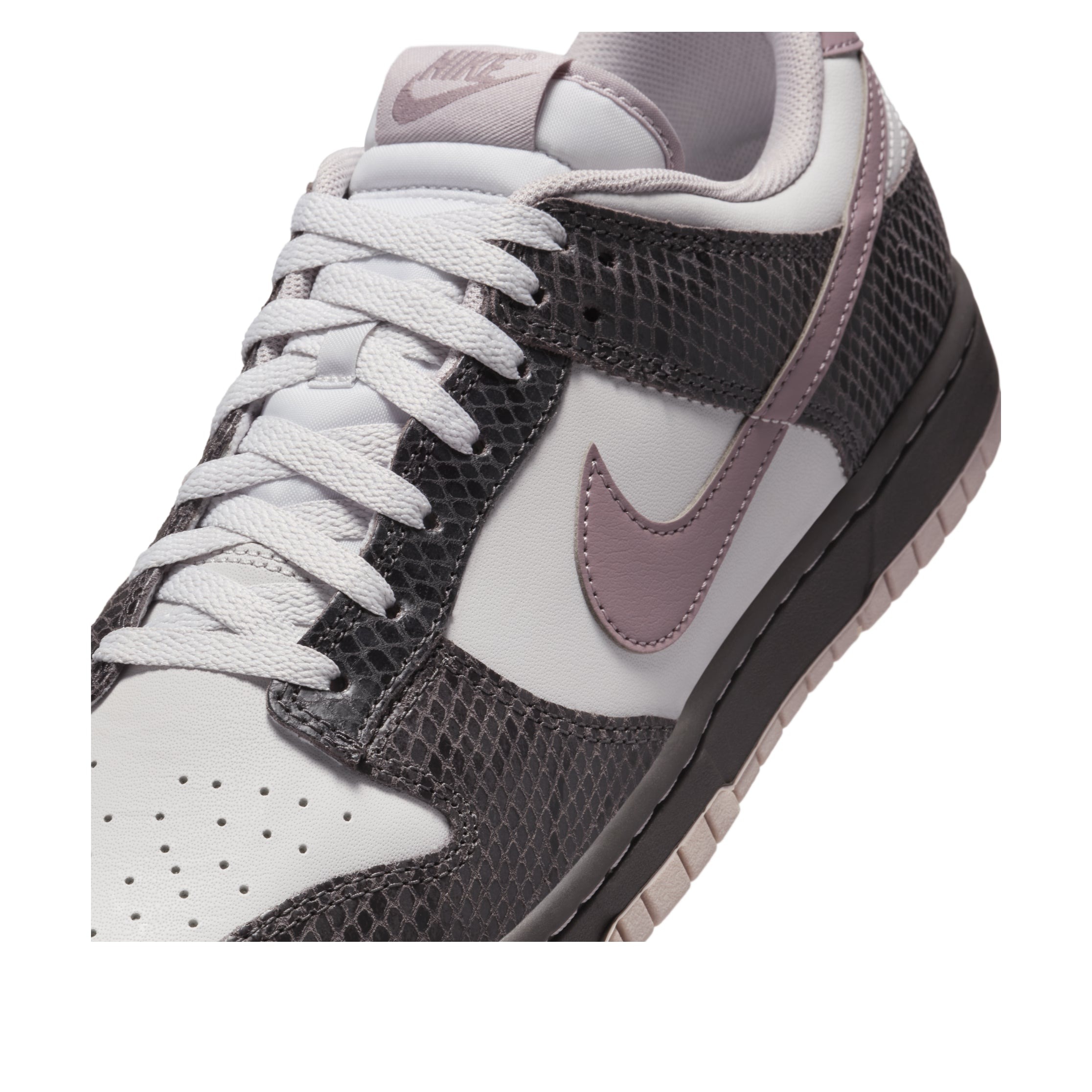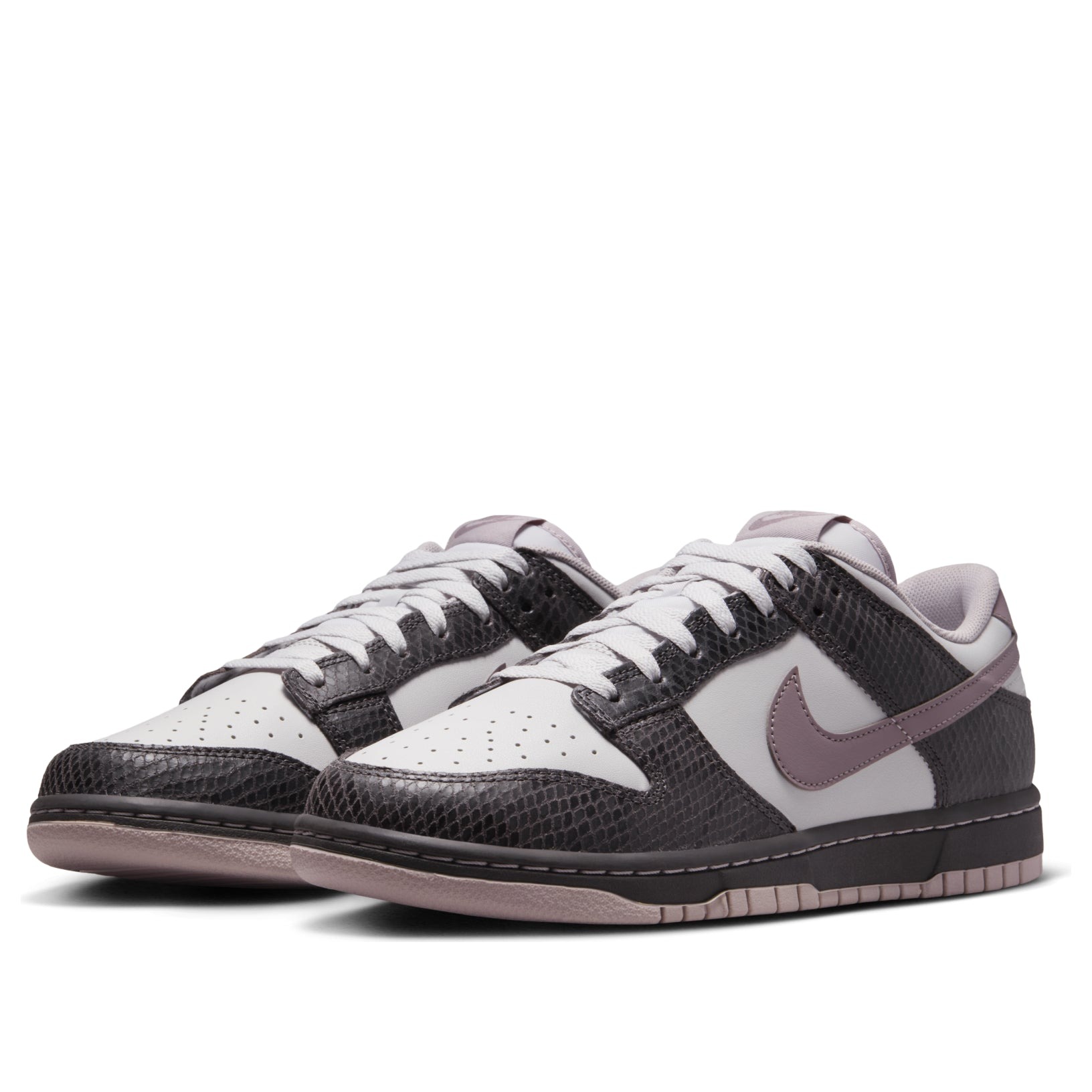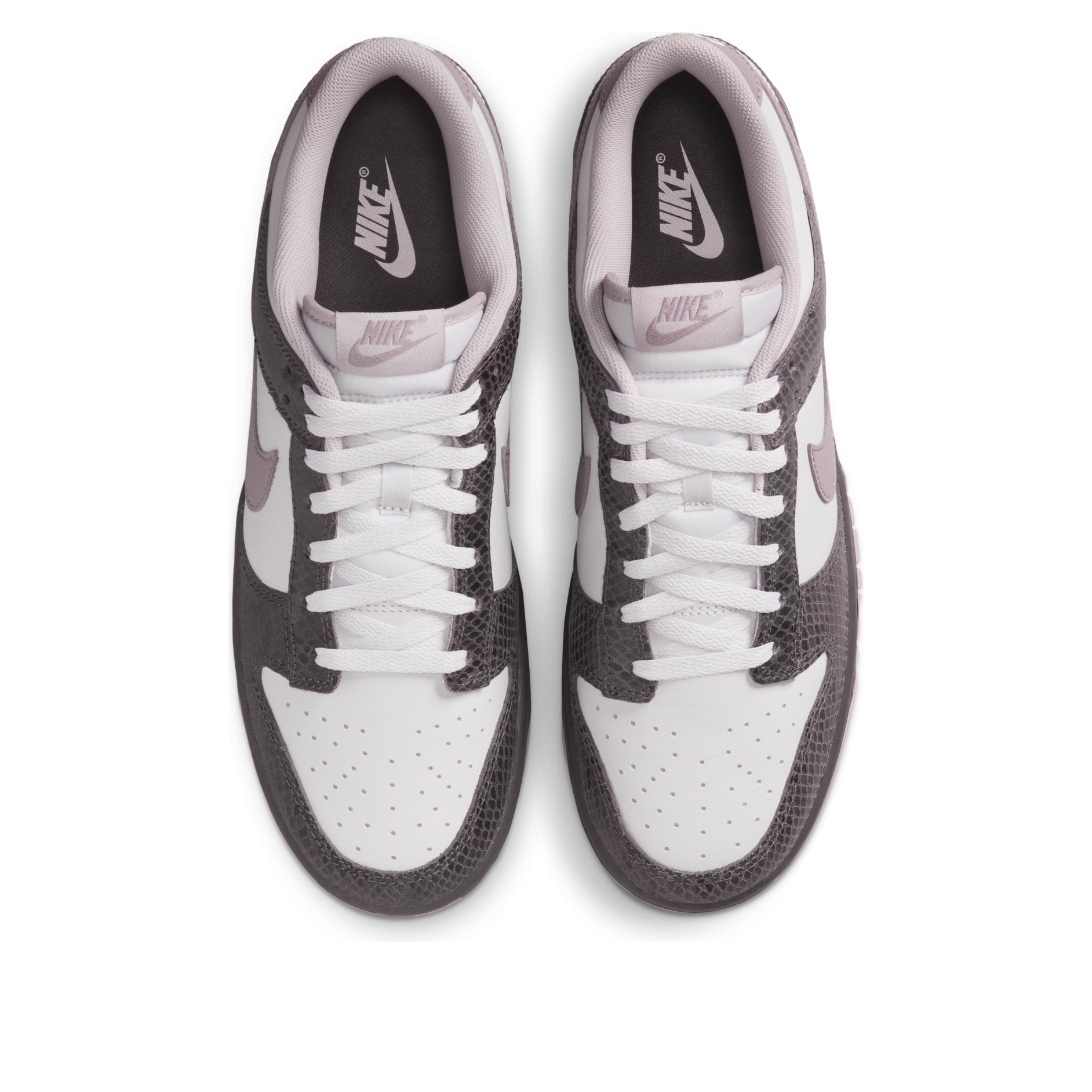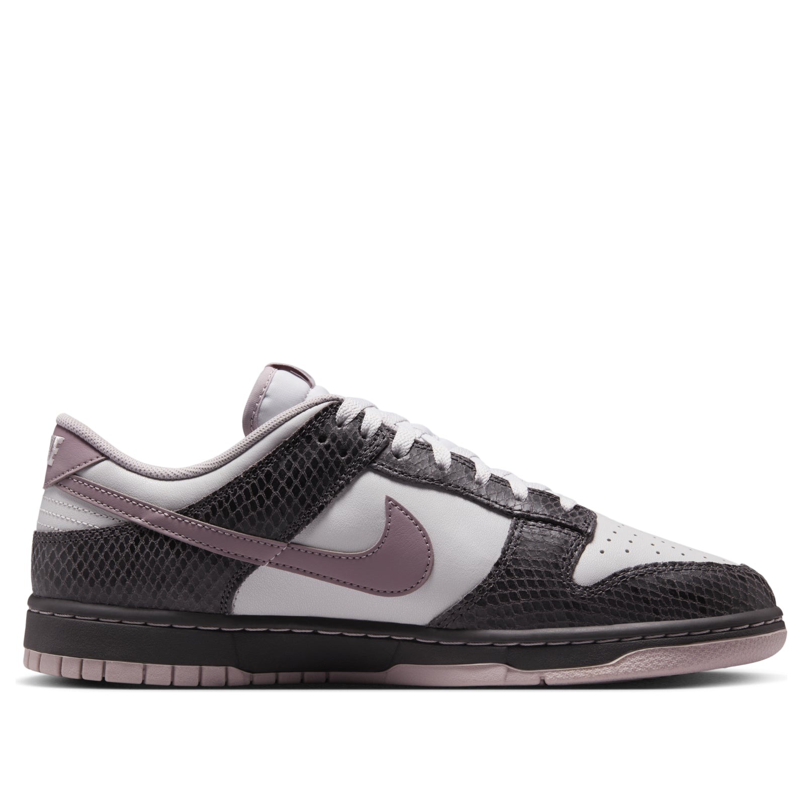 The Nike Dunk Low SE Medium Ash Violet Snakeskin is a special edition of this beloved sneaker model. The high-quality materials and sophisticated color combination give it a premium look to match the Nike performance. This Nike Dunk Low model has dark ash snakeskin patterned panels, which alternate with snow white ones. Both are made from genuine leather. The Nike Swoosh appears in a light violet shade. The trainer has the characteristic perforated toe for extra breathability, along with Nike’s lightweight foam midsole to absorb impact and provide additional lift on jumps. We’ve always loved the Dunk Low model. The classic low-profile silhouette and high traction sole performs equally well on the basketball court, on a skateboard or on urban streets. The supple premium leather also impressed us, and the unusual, appealing colorway is the cherry on top. The Nike Dunk Low SE Medium Ash Violet Snakeskin was released on March 1st, 2025, at a retail price of $130.