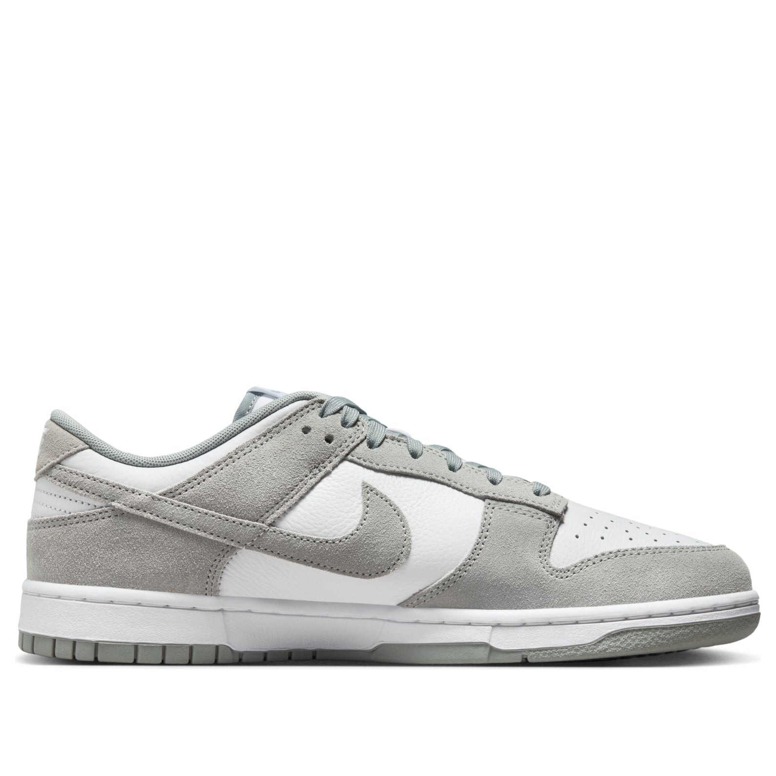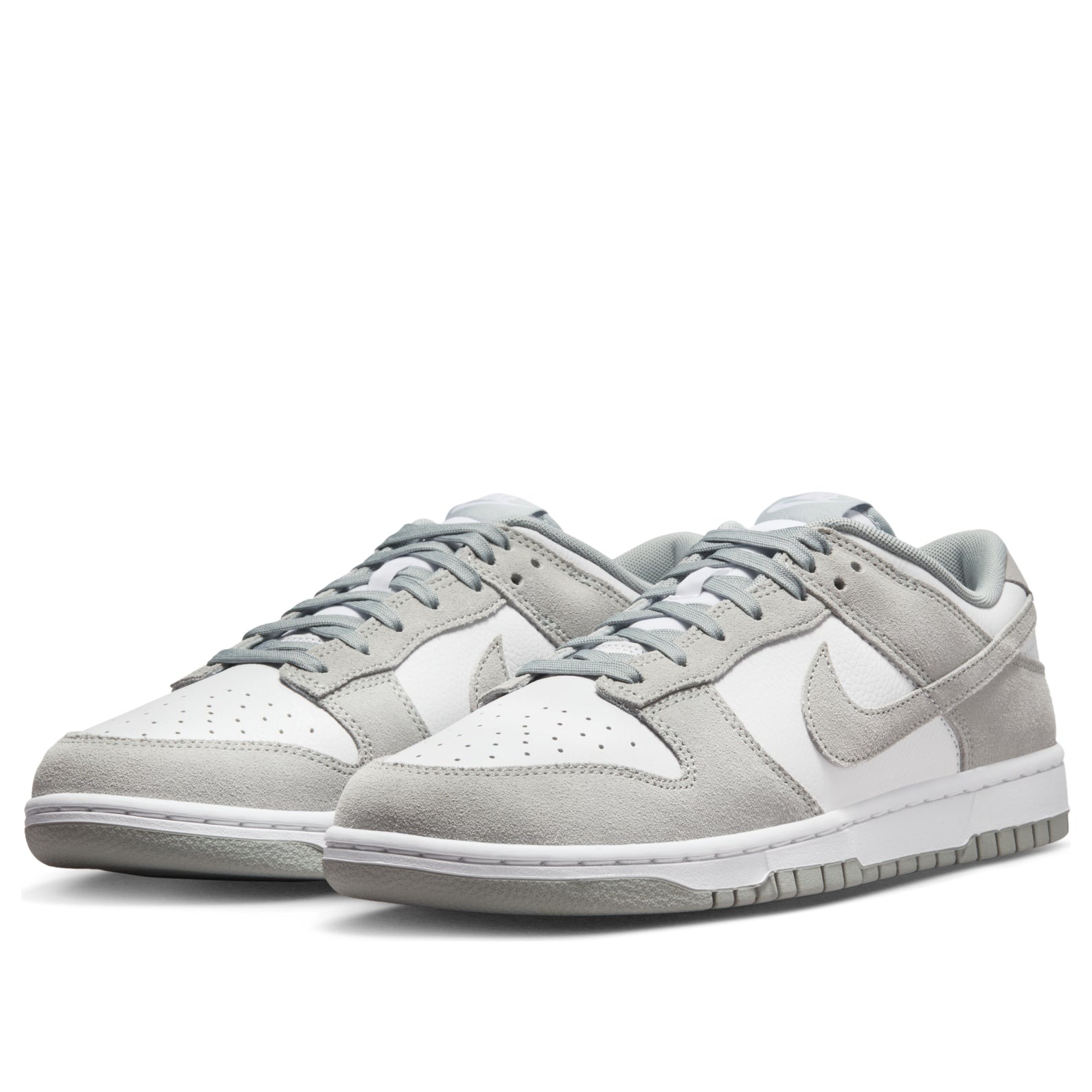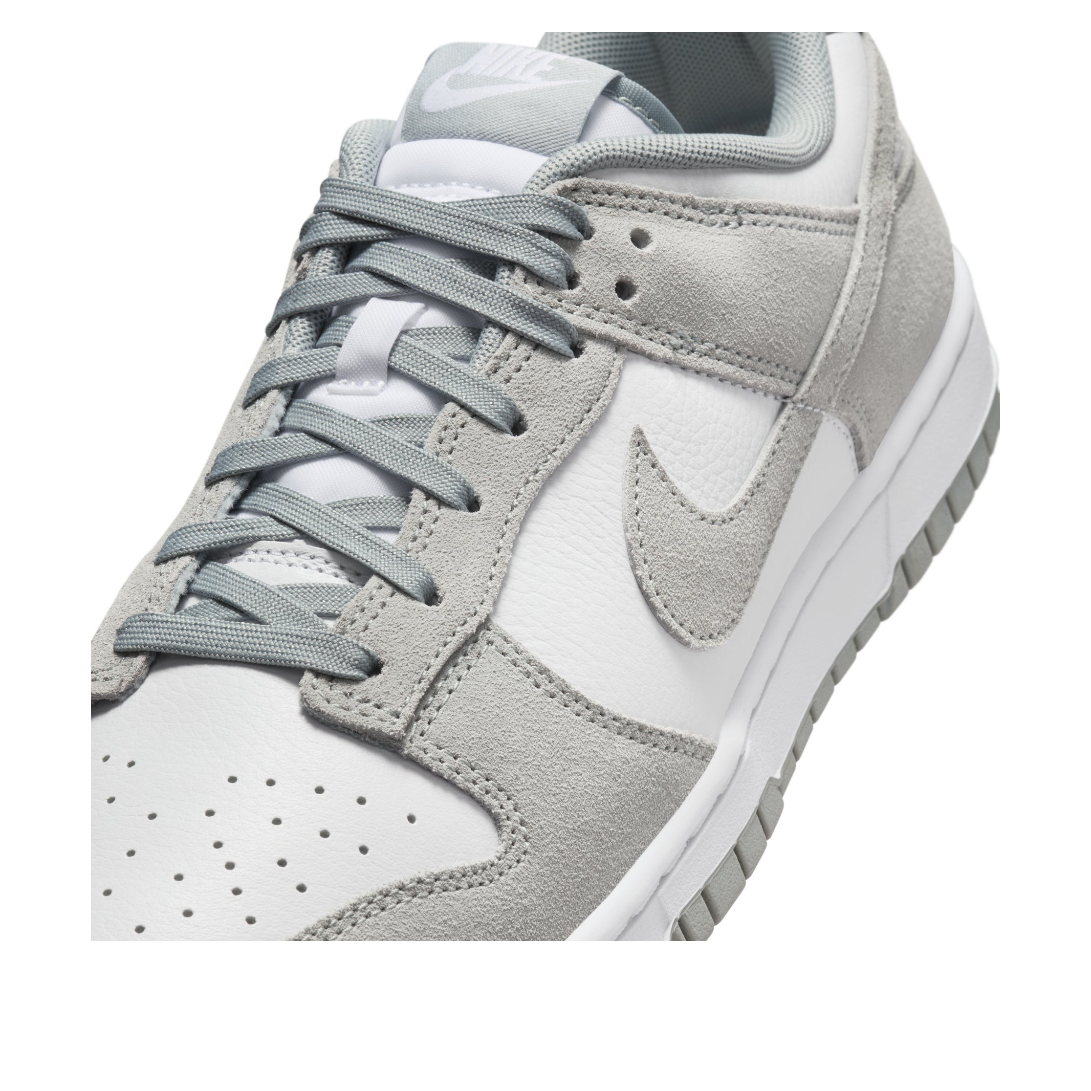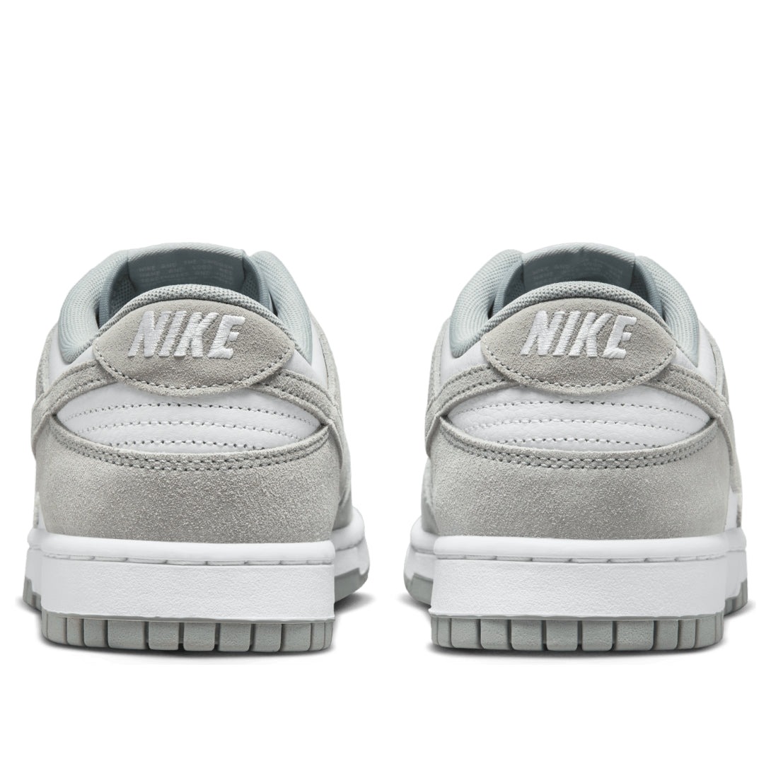 The Nike Dunk Low SE White Light Pumice is a low-top shoe with a color-blocking design and a subtle colorway. The White Light Pumice Nike Dunk Low SE has a base of white leather. The white toebox features perforations for increased air flow, while the side panels and ankle collar also appear in white. Soft suede overlays in a Light Pumice gray color round out the toe and form the eyestays and the ankle strap. The Nike Swoosh can also be seen crossing each side as a Light Pumice overlay. The heel collar features the Nike brand name embroidered in white, and the tongue bears another Nike logo patch. The shoe sits on a white midsole and a Light Pumice outsole. What we like most about this sneaker is the simplistic design with a neutral colorway, which makes the shoe versatile. The Nike Dunk Low SE White Light Pumice was released on July 1, 2024, for $125.