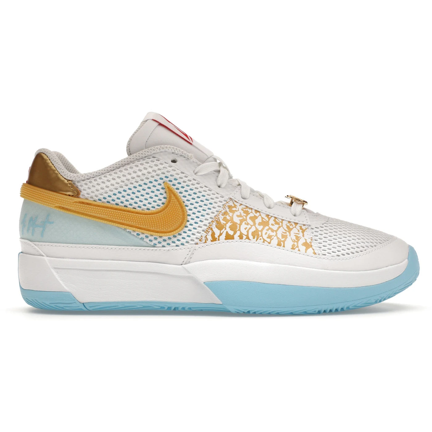 The Nike Ja 1 Year of the Dragon (GS) is a shoe for grade schoolers designed to help celebrate the 2024 Lunar New Year. The Year of the Dragon (GS) version of the Nike Ja 1 has a crisp white mesh upper for breathability. Under the white mesh on the sides, a bright-blue color peeks out. White leather forms the toe cap and mudguard, which encircles the entire shoe. A white leather overlay with a scale pattern in metallic gold is also on each side, separating the forefoot from the rest of the shoe. A textured Nike Swoosh appears on each side, while the glacier-blue heel collar contains Ja Morant s branding. The gold heel collar contains the number 12 in red, while the tongue also contains Morant s logo in red. The thick white midsole is equipped with an Air Zoom unit.Our favorite features of this shoe are the metallic-gold accents, which allow the shoe to stand out. The Nike Ja 1 Year of the Dragon (GS) was released on December 30, 2023, for $105.