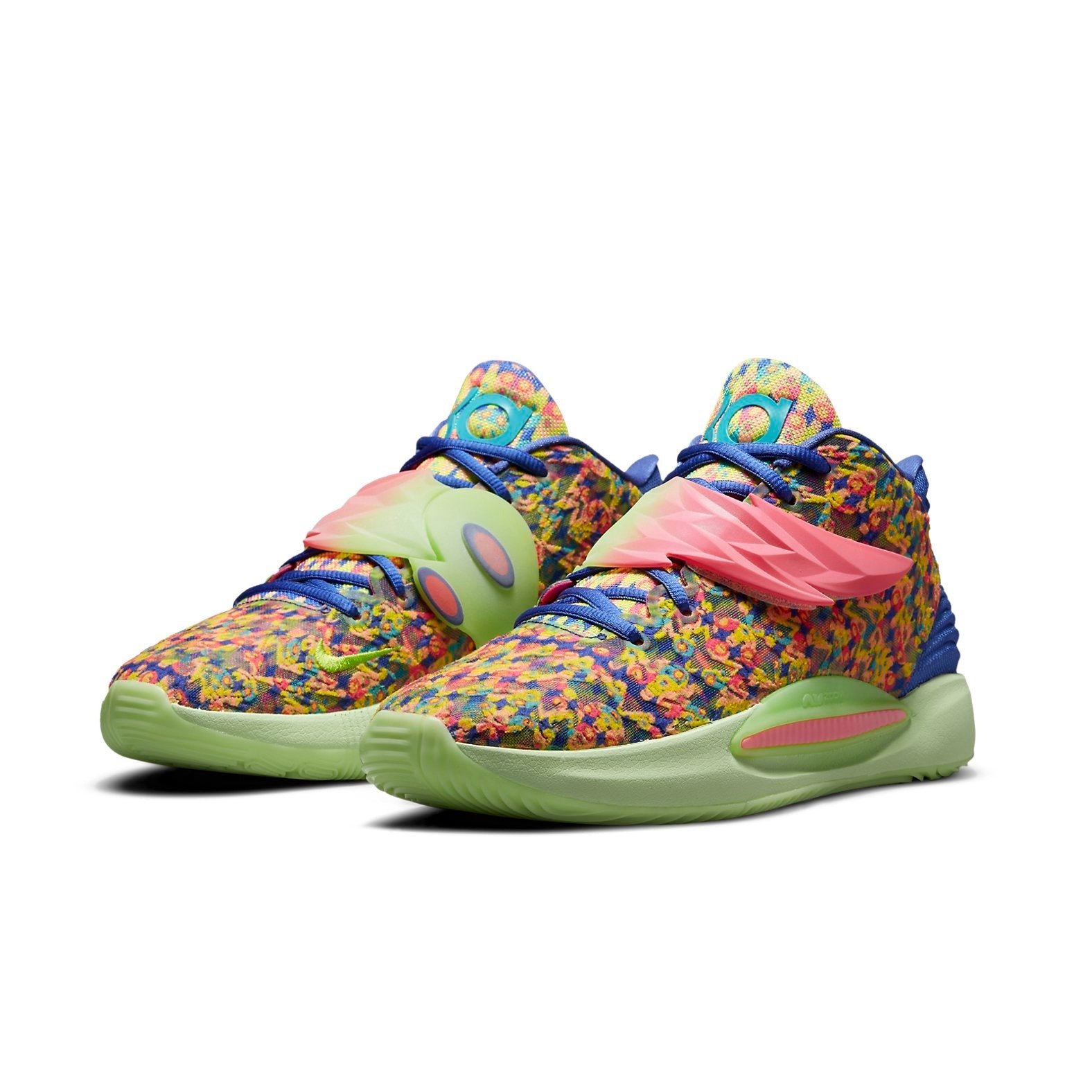 The Nike KD 14 Ron English 1 is a limited-edition sneaker that was created by Nike in collaboration with American contemporary artist, Ron English. The KD 14 Ron English 1 features a mix of colors including Lapis, Hyper Pink, and Turquoise Blue. The upper is made using textile and TPU. The midsole is made using Nike’s Air sole technology, which is encased in soft foam. In addition, the sneaker has a mid-top profile and includes padding on the collar and tongue. Moreover, the tongue includes the KD logo, while the Nike Swoosh is on the forefoot. The outsole is made from translucent rubber and includes a circular and waffle traction pattern.Our experts say that one of the highlights of the Nike KD 14 Ron English 1 is the incorporation of a midfoot strap that is designed to resemble a feathered wing. The shoe was released on September 21st, 2021, at a retail price of $150.