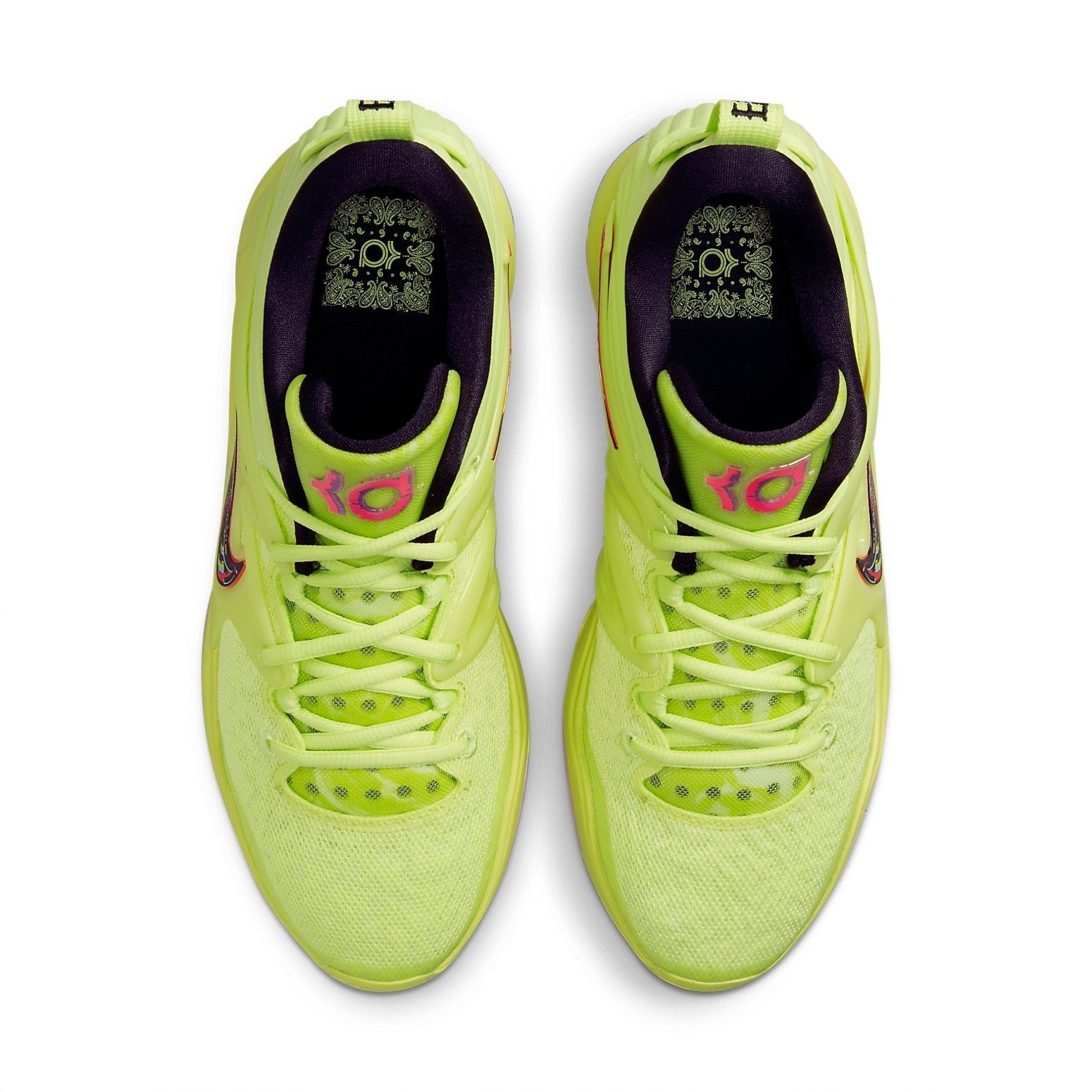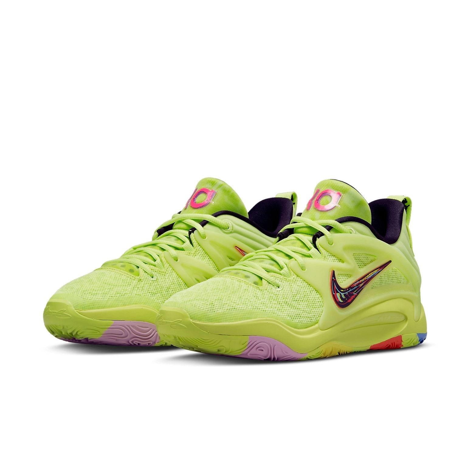 Since its first release, Nike KD 15 Aimbot continues to record the highest number of sales in the Nike catalog. Featuring a twisted lemon design, the Nike KD 15 Aimbot appears in multi-colors. Its upper is made from breathable mesh with a construction of different shades of green. It also features floating Thermoplastic Polyurethane (TPU) wings. The Nike KD 15 Aimbot has a molded heal knit together with a pull tab with a black inner lining. Its midsole and the upper sole are made of rubber that features a mixture of blue, red, purple, and shades of green. The Nike KD 15 Aimbot was first released on June 25, 2022. At the time of its first release, its price was $150.