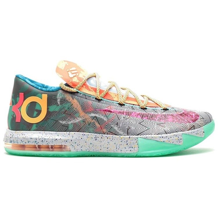 The Nike KD 6 What The KD was released as part of the Nike KD 6 basketball sneaker line developed by Nike in partnership with Kevin Durant.The What The KD Nike KD 6’s colorway features a mix of Hoop Purple, Urgent Orange, and Shark colors. The sneaker has mismatching shoes which boosts Nike’s innovative Flywire technology, which provides stability while allowing the player to move with fluidity. The sneaker s Zoom Air cushioning system further enhances this, ensuring that players can make quick cuts and sharp turns without sacrificing comfort or support.We especially love the Nike KD 6 What The KD for its eclectic design that features elements from all the previous KD 6 releases. The shoe incorporates different colors, designs, and patterns, making it stand out. The upper of the What The KD features a mix of different designs, including the Aunt Pearl, Energy, Seat Pleasant, DC Preheat, and N7 models. The Nike KD 6 What The KD was released on June 14th, 2014 at a retail price of $150.