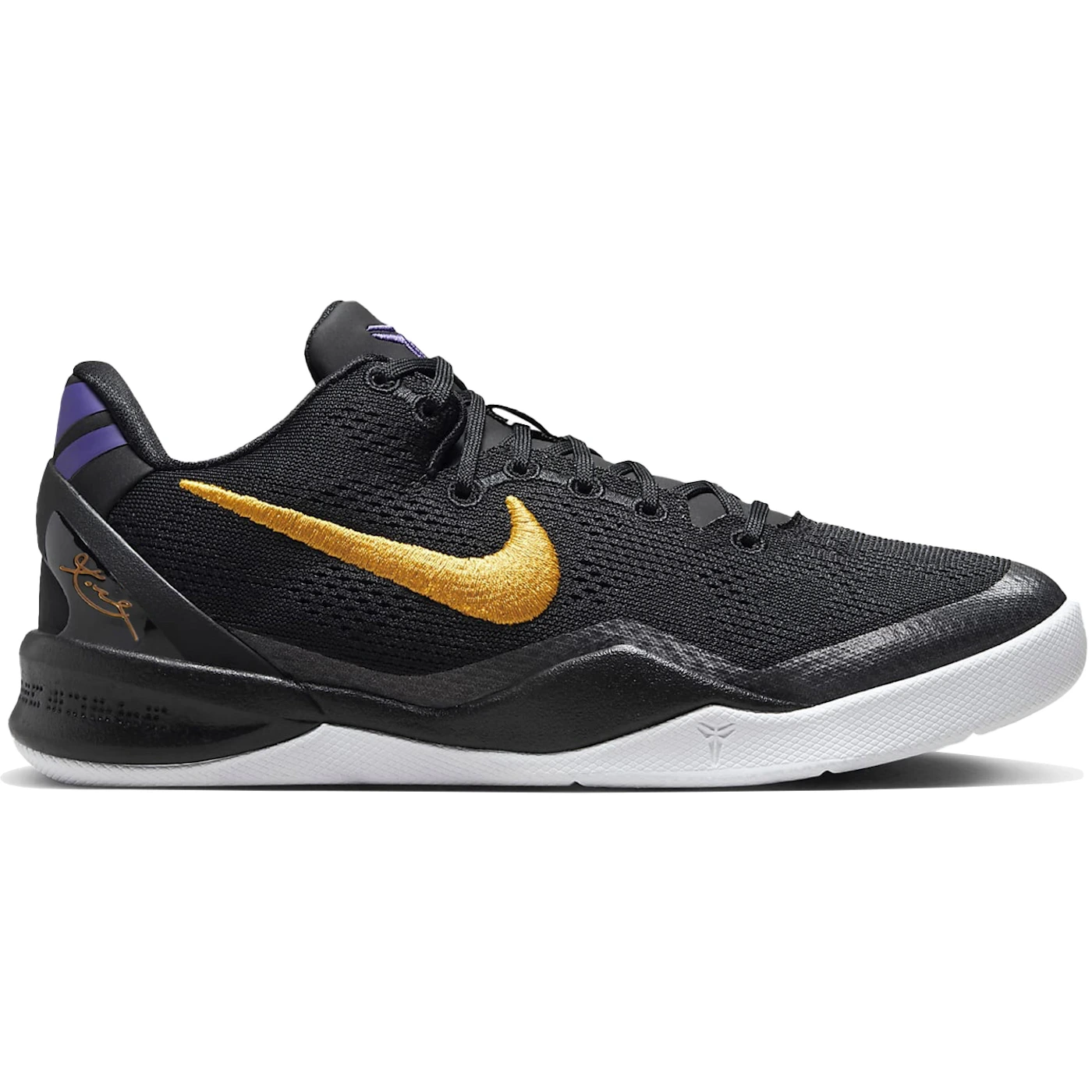 The Nike Kobe 8 Lakers Away (GS), in grade school sizes, is an athletic shoe featuring a Black Flyknit upper accented by the Nike Swoosh in embroidered University Gold on the sides. A Black midsole contrasts a stark White outsole, while Court Purple and Kobe Bryant s autograph accent the heel.Kobe Bryant was a beloved Shooting Guard for the NBA s Los Angeles Lakers, whose storied career captured attention from his rise as a youth in the Philadelphia suburbs until his tragic death in 2020. Having only ever played professionally for the Lakers, the Kobe 8 was designed by Eric Avar, and the Lakers Away colorway was used for the Lakers’ away game uniforms. Our experts feel that the best feature of the Kobe 8 is its colorway, which looks great while keeping the memory of Kobe Bryant alive. The Nike Kobe 8 Lakers Away (GS) released on September 6, 2024, and retailed at $120.