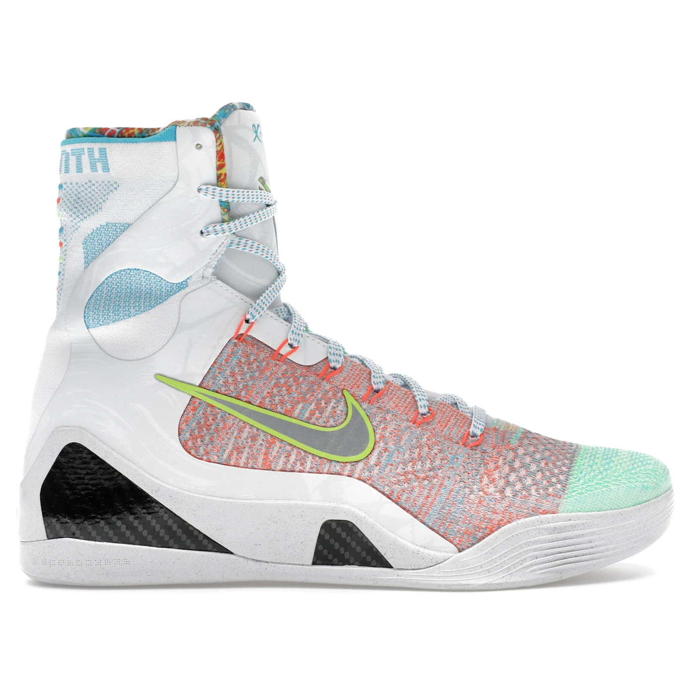 The Nike Kobe 9 Elite What The Kobe is a special edition shoe released by Nike as part of the “What The” collection, which were sneakers that combined various aspects of previous Kobe models.The Kobe 9 Elite What the Kobe has a multicolored scheme with Reflective Silver and Chlorine Blue hues. The shoe’s upper is made of Flyknit material, which is lightweight and breathable. It also features Nike’s Flywire technology for added support and stability. The midsole is made of Lunarlon foam, which provides cushioning and helps reduce impact.We especially love the Nike Kobe 9 Elite What the Kobe for its extended collar. The shoe has a high-cut design with an extended collar that provides additional ankle support and protection. The extended collar is made of Flyknit material that is reinforced with Flywire cables for added support and stability. The Nike Kobe 9 Elite What the Kobe was released on January 11th, 2015 at a retail price of $275.