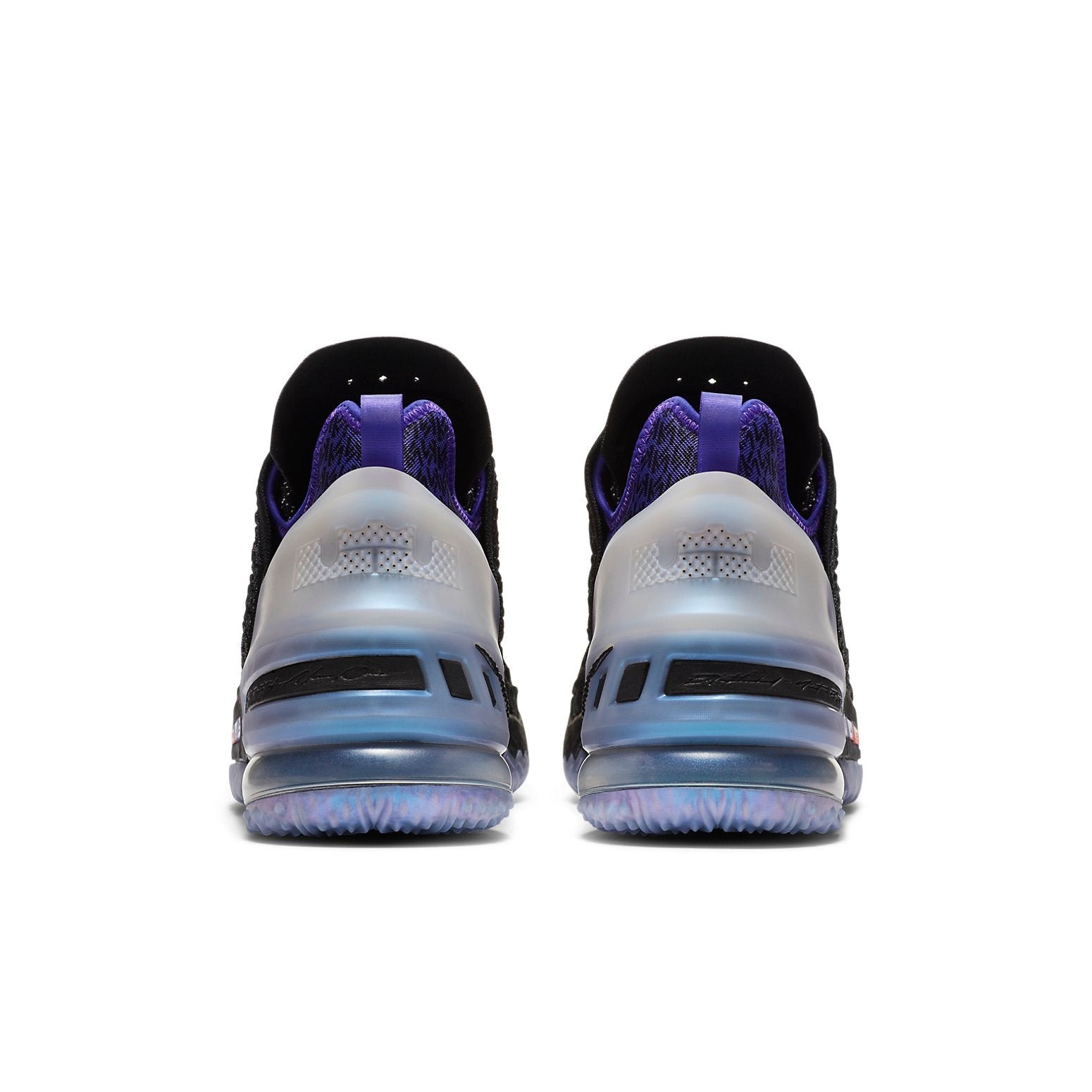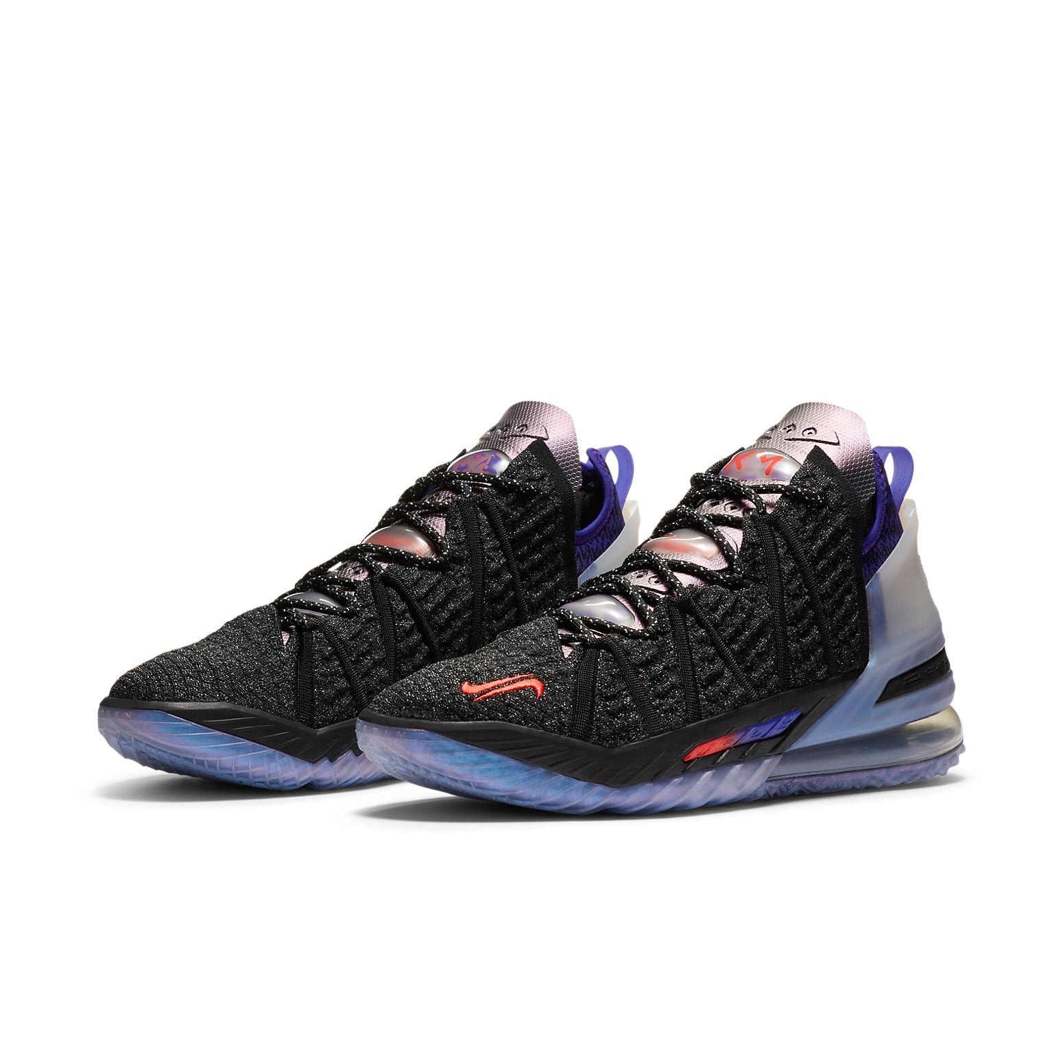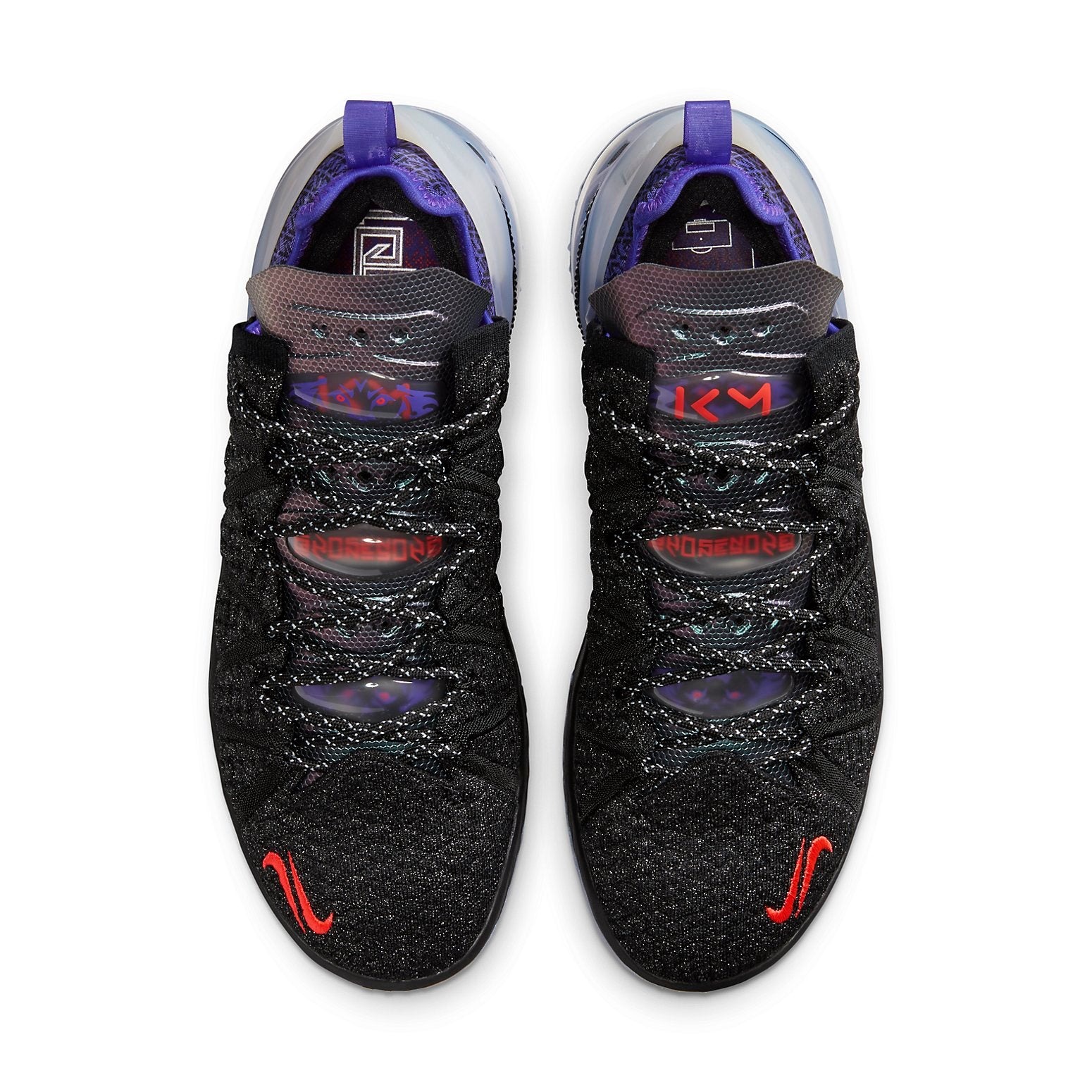 The dominant colors that give the outer appearance of the Nike LeBron 18 Kylian Mbappe its distinctive design are red, purple, and black.The Kylian Mbappe Nike LeBron 18 showcases a combination of vibrant purple, blue, and red highlights across the primarily grayscale Knitposite 2.0 upper. Notable elements encompass this football shoe’s distinctive “KM” logo imprinted on the tongue, two small Swoosh logos intricately stitched on the toe, as well as an iridescent heel counter and outsole. This sneaker features a Nike Zoom Air unit for responsive cushioning. Max Air Cushioning is also employed on this shoe in the heel. The upper part of the Nike LeBron 18 Kylian Mbappe is crafted using BattleMesh material. A black lacing system completes the look of this sneaker.The Nike LeBron 18 Kylian Mbappe had a recommended retailing value of $225 at the time of market launch on January 7, 2021.