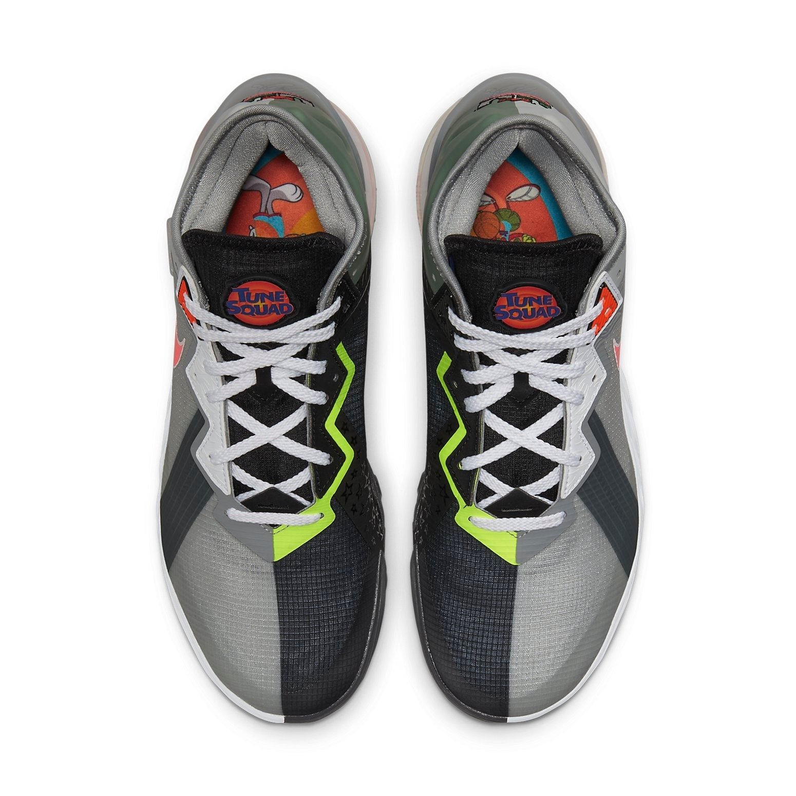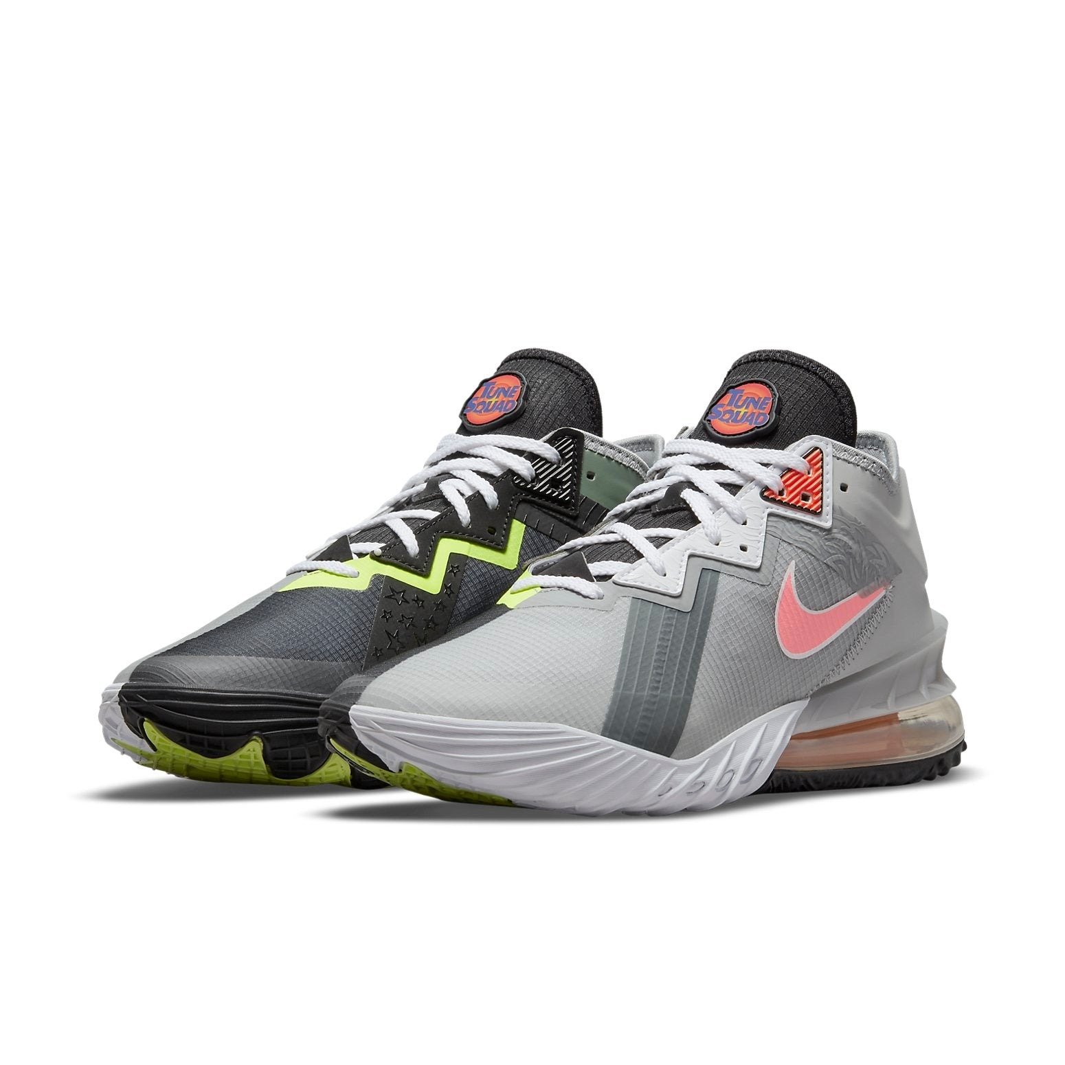 With a two-tone appeal, the Nike LeBron 18 Low Bugs vs Marvin Space Jam illustrates the legendary rivalry between Looney Tunes characters Bugs Bunny and Marvin the Marvin. The lateral facing sides of the upper nod to Bugs Bunny with a Light Smoke Grey palette, representing his fur. The medial sides feature a black and neon green construction, similar to the appearance of Marvin. Tune Squad insignias on the tongue and graphic heel embroidery adds the finishing touch.The Nike LeBron 18 Low Bugs vs Marvin Space Jam released in July of 2021 and retailed for $160.