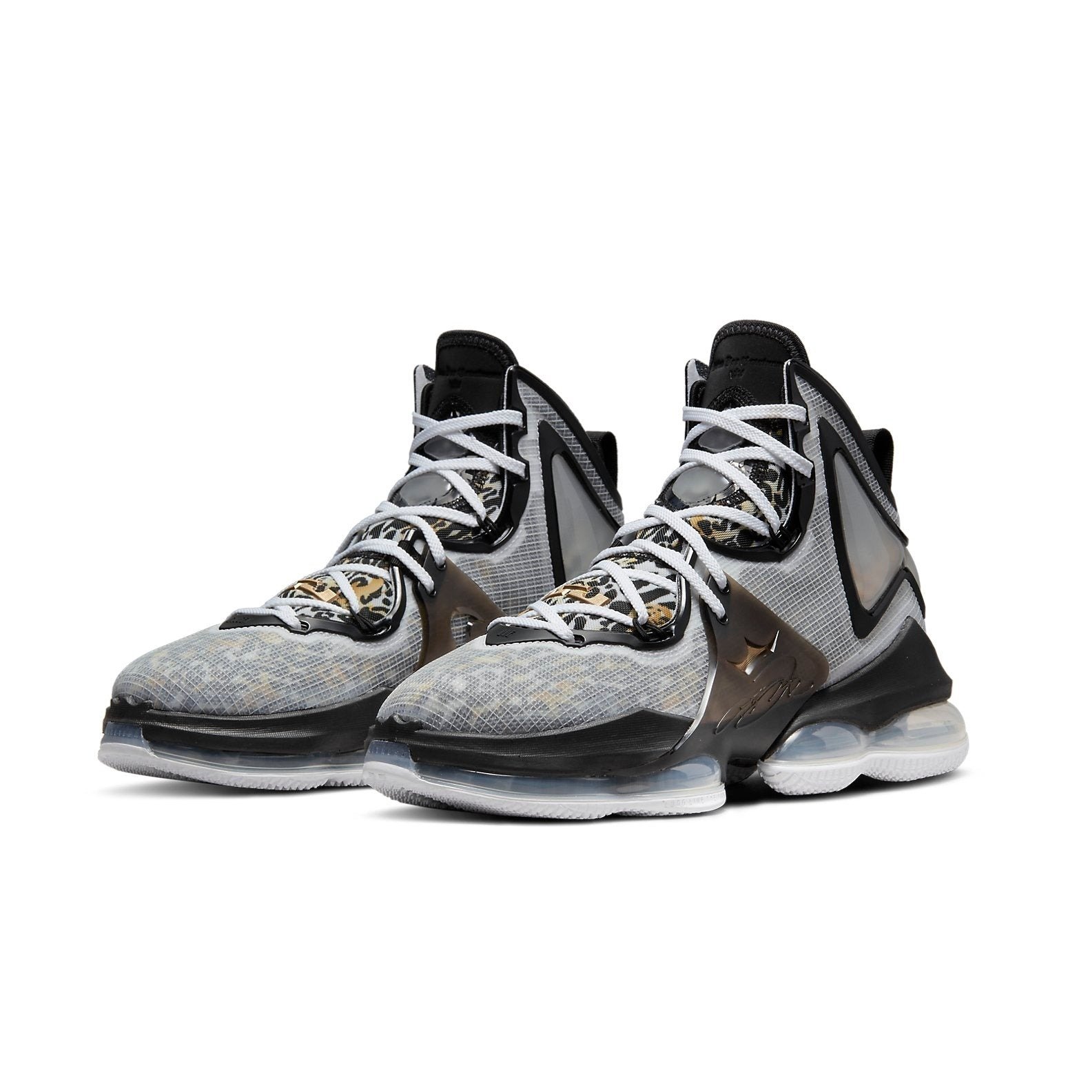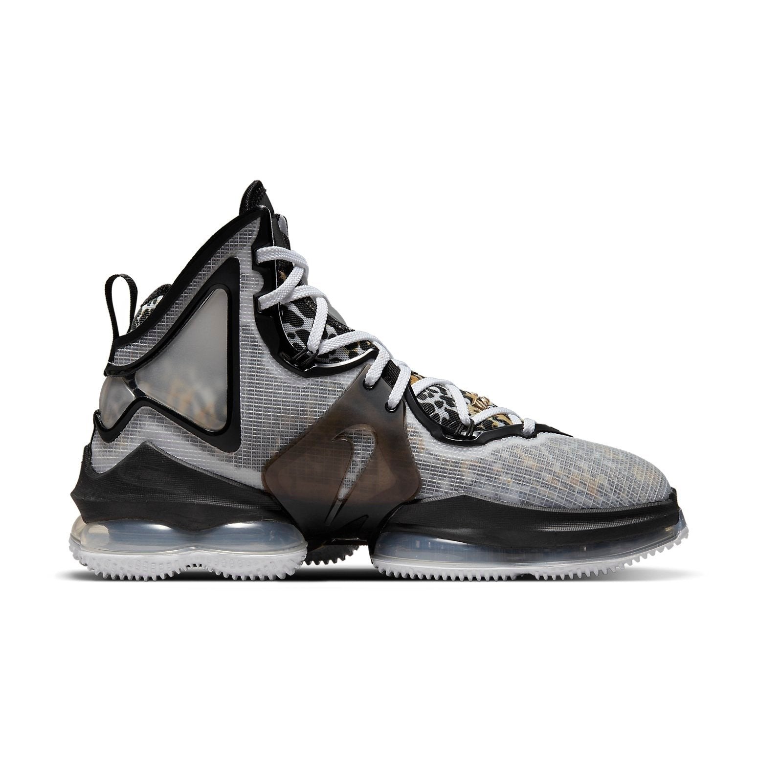 The Nike LeBron 19 Royalty was designed in collaboration with NBA s champion LeBron James. The shoe is designed for basketball players, but can be worn for leisure. The Nike LeBron 19 Royalty comfort is enhanced by the cushioning capsules around the tongue and mouth, ensuring a snug fit. The upper is made of a textile woven material, which is light in weight and durable. The laces pass through an interior lining made from an overlay, which reduces the movement of the shoe and provides grip. The outer rubber sole adds cushioning and boosts traction for players in the field. Something our experts love about the Nike LeBron 19 Royalty is its colors black and white combination with a highlight of a leopard print panel. The front of the tongue contains the LeBron James golden logo, a Swoosh, and a crown on a semi-translucent black plate on the quarter panel. The release date of the shoe was January 15th, 2022, at a retail price of $200.