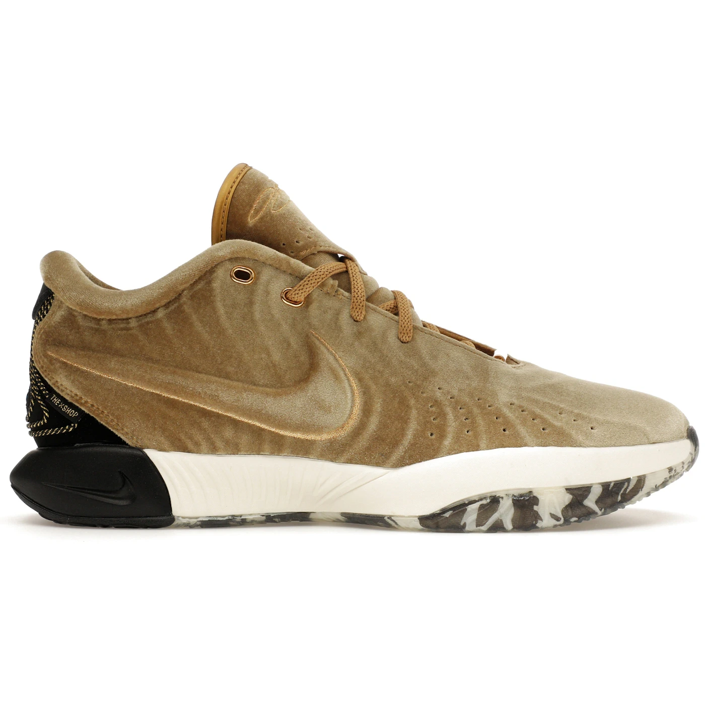 The Nike LeBron 21 The Shop Nobility (Marbled Sole) features a Metallic Gold/Black/Coconut Milk/Aquamarine colorway. This Nike LeBron 21 was first released for $210 on June 07, 2024.