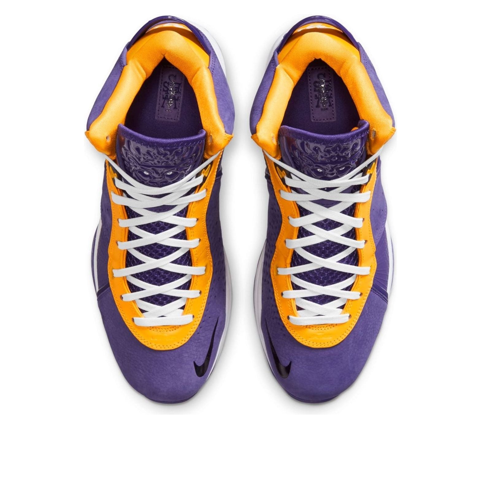 With every championship ring, LeBron James continues to cement his place in basketball history. As his popularity grows and Nike continues to develop new signature sneakers, his older models become more admired. To continue the legacy that is LeBron James, Nike has been retroing his older signature kicks. To end December of 2020, Nike brought back the LeBron 8, a sneaker that last released in 2011. The Nike LeBron 8 Lakers don the LA team s notable purple and gold colors. Home of the greats like the late Kobe Bryant, Magic Johnson, and now, LeBron James, the sneakers pay homage to the popular west coast franchise. The latest LeBron 8 retro adds a new luxe look to the model, dressing the sneaker s upper in premium suede. Familiar aspects of the silhouette come through on this Lakers colorway, such as LeBron s iconic Lion logo embossed on the tongue and his signature stamped on the heel.The Nike LeBron 8 Lakers released December 2020 for $200.