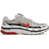 The Nike P-6000 Platinum Varsity Red draws inspiration from the Pegasus 2006 and the Nike Air Pegasus 25 in order to create a stylish, comfortable, running shoe that evokes a vibe reminiscent of the early 2000s.The Platinum Varsity Red colorway of the Nike P-6000 features an upper with a base of Snowy White mesh with a strip of black on the side panel, offering lightweight breathability. Synthetic leather overlays in white and pale gray course across the upper, from the toecap to the heel counter, providing support and a dynamic aesthetic. A molded red synthetic side-panel Nike Swoosh outlined in gold embroidery complements the hits of red in the white foam midsole that offers cushioning and impact absorption. The rubber outsole continues the colorway in black, white, gold, and red. The aspect of this sneaker that we most enjoy are the nods to Nike co-founder and legendary track coach Bill Bowerman. The webbing on the tongue sports “Bowerman Series” branding and the outsole features a modified waffle traction pattern, an innovation originally designed by Bowerman. The Nike P-6000 Platinum Varsity Red was released on December 10, 2023, for $110 retail.
