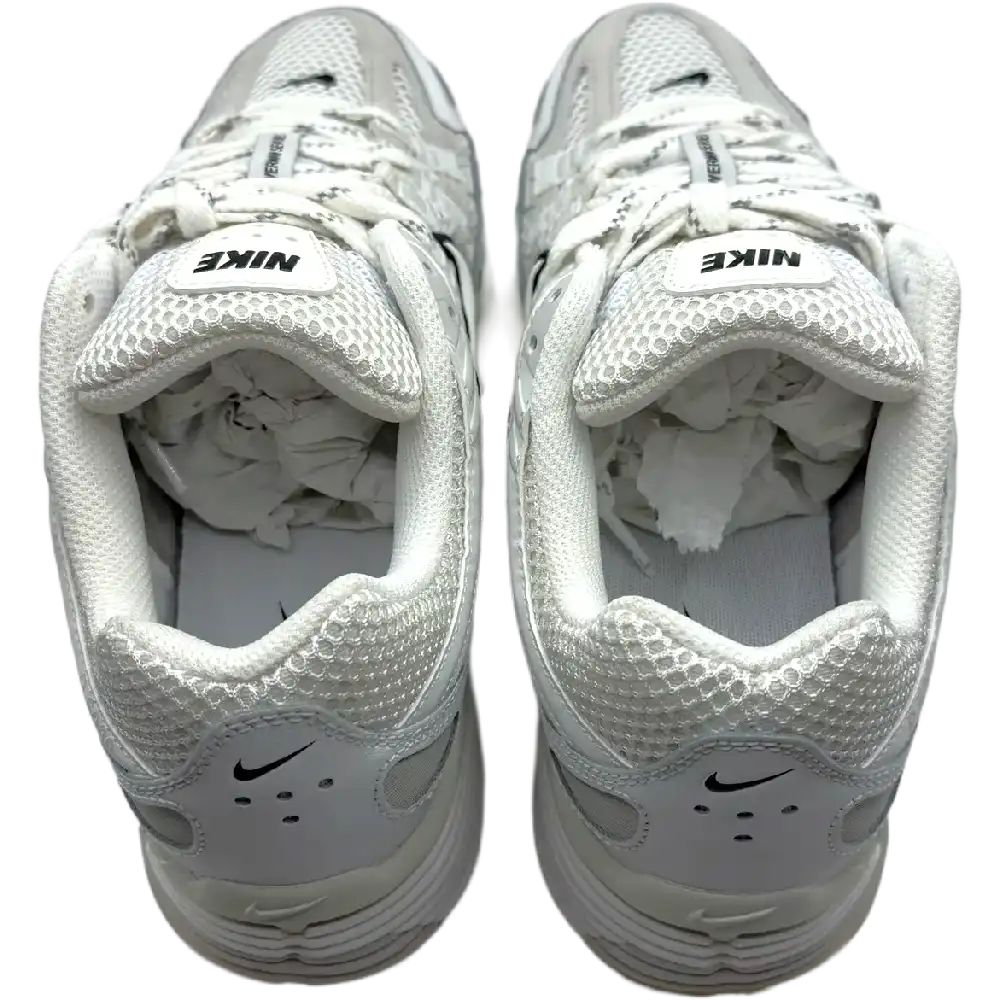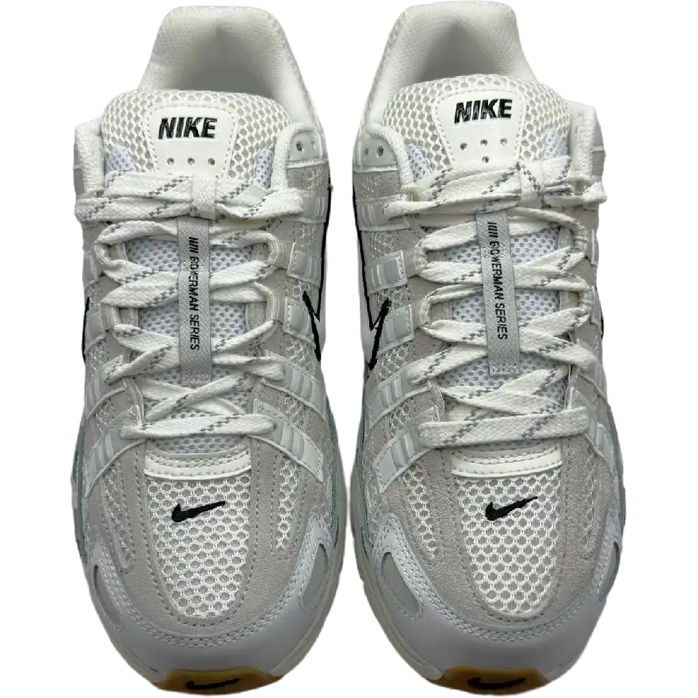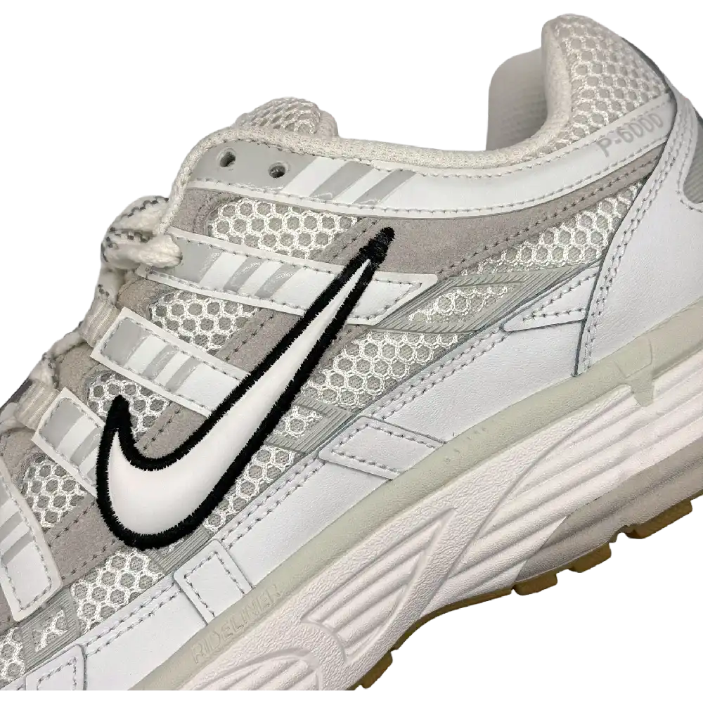 The Summit White mesh upper of the Nike P-6000 Premium Summit White shoe is accentuated with Light Bone and Phantom linear leather overlays, giving the shoe a multi-tonal, multi-textured white look. On the sides, a black edge highlights the Nike Swoosh. The multi-white style is maintained by the linearly textured midsole, and the final touch is a gum outsole. On the back heel, there is another Nike Swoosh that is accentuated by P-6000 branding.