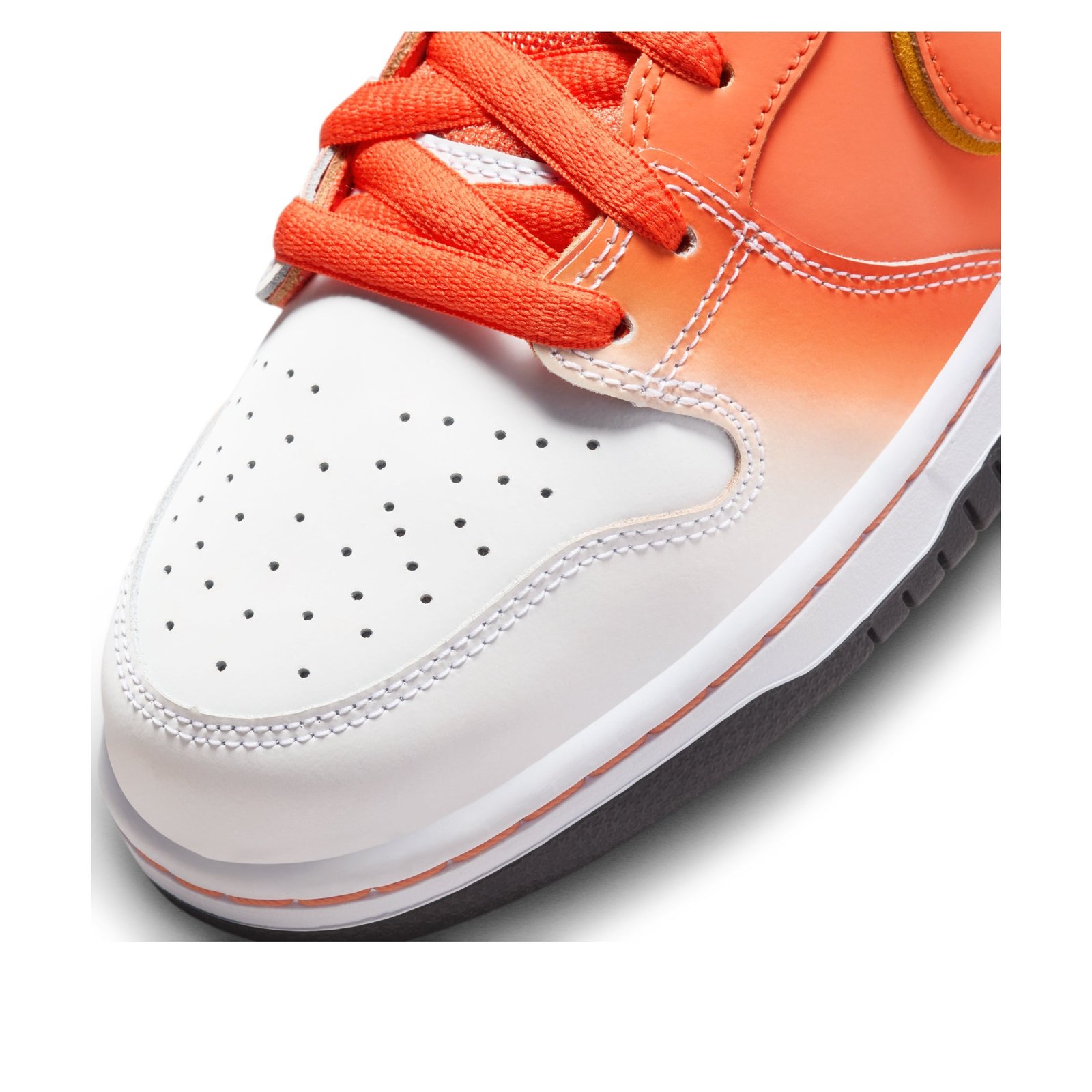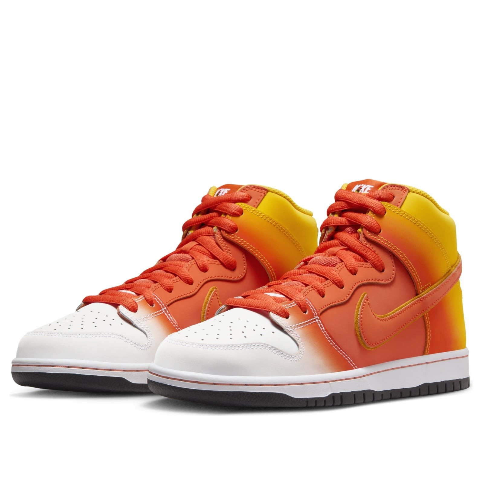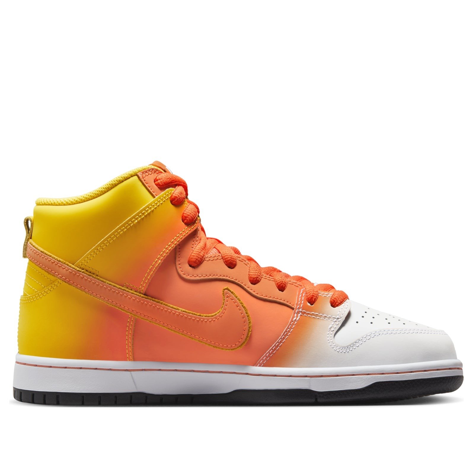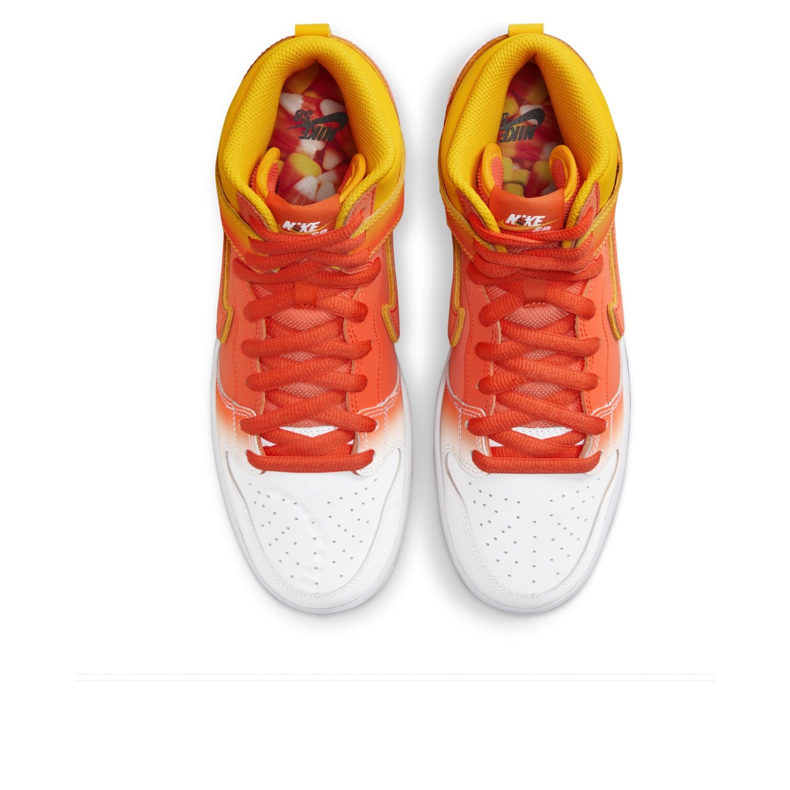 The Nike SB Dunk High Sweet Tooth Candy Corn boasts that recognizable Nike SB Dunk silhouette with a Halloween-inspired colorway and candy details.A gradient of Amarillo and Orange covers the smooth leather upper and overlays before fading to white across the vamp. It appears almost spraypainted across the sneaker. This high-top skateboarding shoe features overlapping Swoosh logos in Orange and Amarillo on the left and right sides that connect around the heel. In addition, the Orange swoosh complements the laces and the stitching along the midsole. The rubber outsole provides traction and a burst of black that contrasts the bright colors on the upper.Our experts at Newsole love the Trick-or-Treat-inspired insole. It features graphics of candy corn with pennies, a nod to candy corn’s status as the original “penny candy.” The Nike SB Dunk High Sweet Tooth Candy Corn was released on October 18, 2023, and retailed at $125.