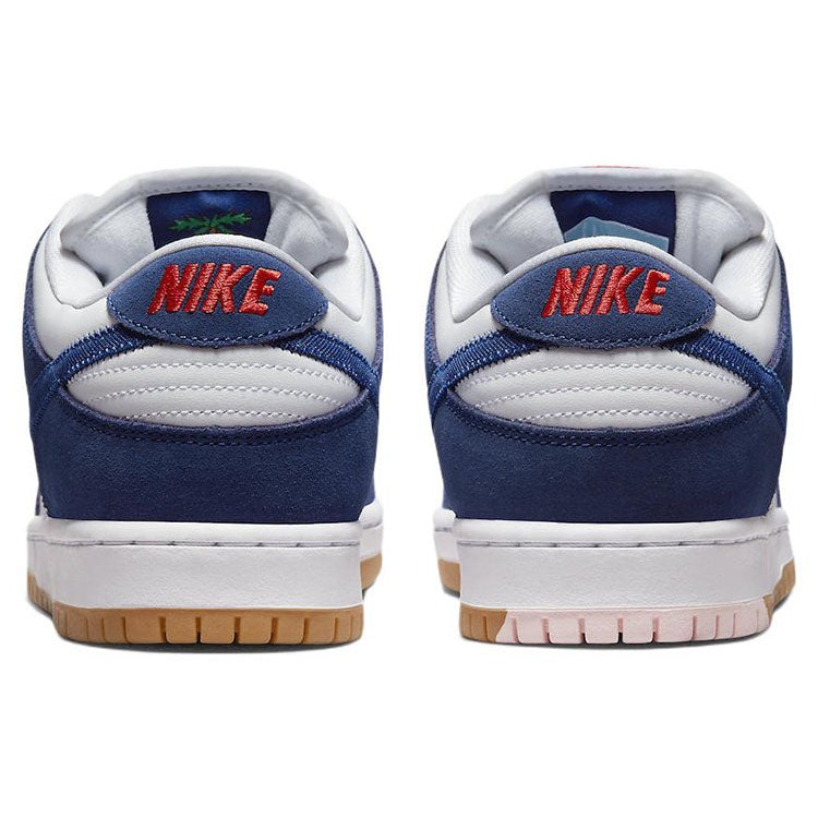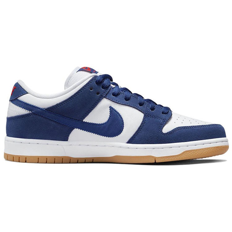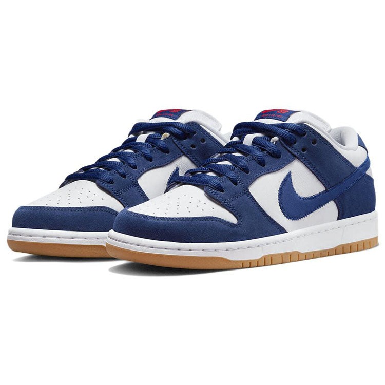 The Nike SB Dunk Low Los Angeles Dodgers features a white leather upper with blue overlays and red Swoosh logos. The “Nike” brand name is prevanlent on the heel tab in red.The Nike SB Dunk Low Los Angeles Dodgers is a low-top sneaker with lace-up closure style. The shoe features a blue and white color scheme that has shades similar to the traditional blue and white worn by the MLB’s LA Dodgers. It has a light-brown sole with a pink graphic on the ankle s right side.The Nike SB Dunk Low Los Angeles Dodgers was released in June of 2022 at the retail price of $120.