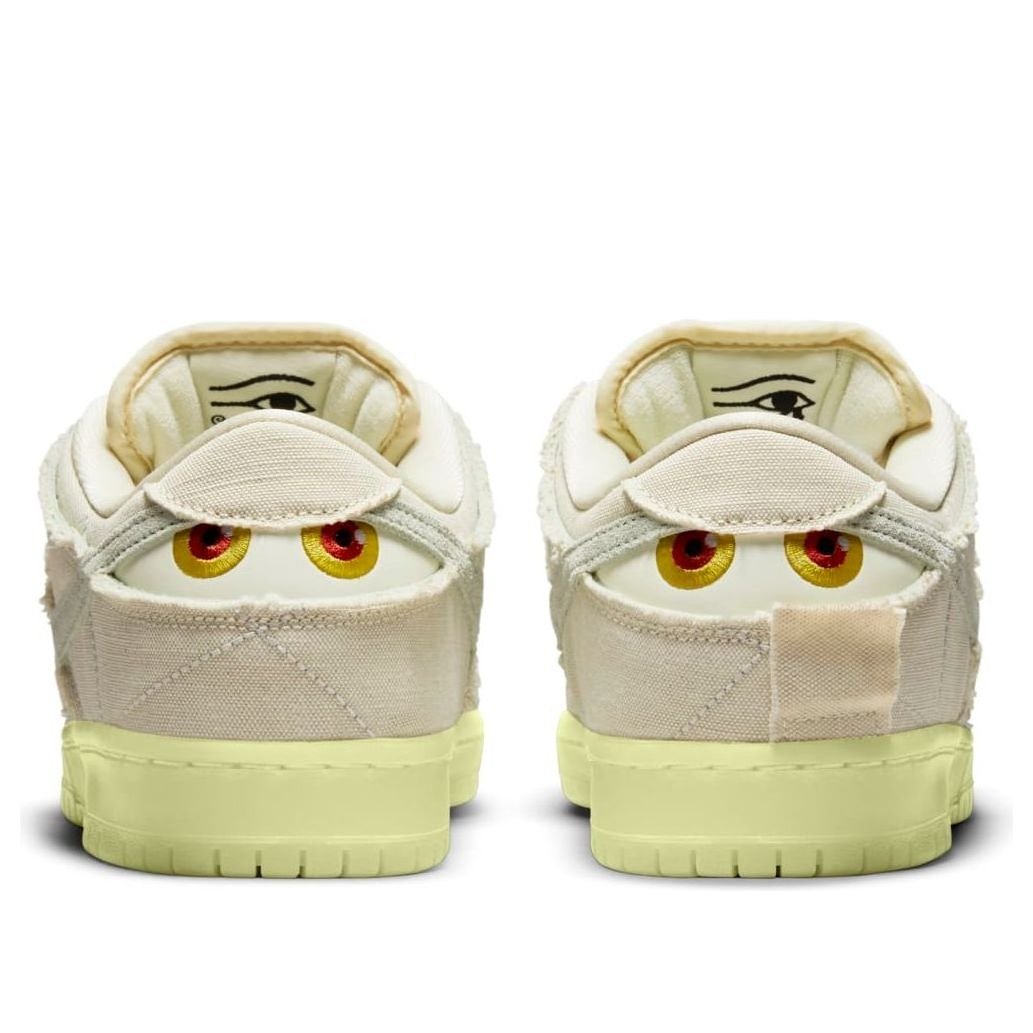 The Nike SB Dunk Low Mummy draws inspiration from the Ancient Egyptian mummification process. It features a layered textile upper with cross-stitched detailing and a suede Swoosh overlay. At the heel, eye graphics peek out from underneath the layered textile. A glow-in-the-dark sole and Eye of Horus woven tongue tag completes this Halloween design.The Nike SB Dunk Low Mummy released in October of 2021 and retailed for $110.