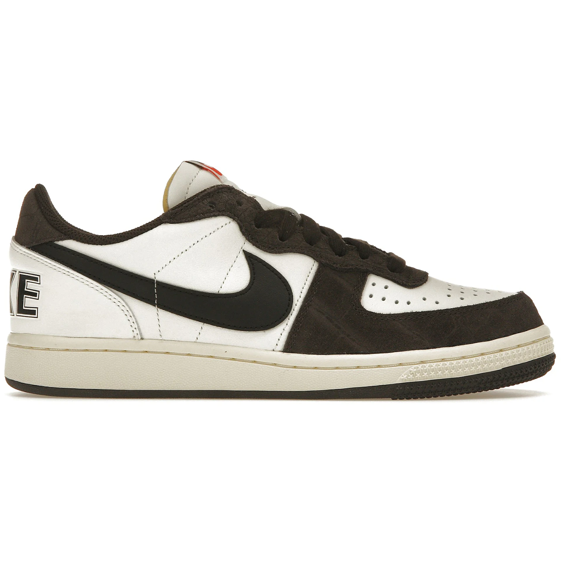 The Nike Terminator Low Croc Velvet Brown embraces an exotic motif, imparting a color scheme of Sail, White, Chocolate Brown, and Black to the sneaker. This iteration takes on the classic low-top silhouette. The Croc Velvet Brown Nike Terminator Low features an off-white leather upper, complemented by a dark brown suede forefoot overlay embossed with a crocodile pattern. This rich brown hue is also repeated on the leather Swoosh and the oversized Nike branding encircling the heel. To enhance its retro aesthetic, the midsole is given a vintage finish. Underfoot, a brown herringbone rubber outsole ensures traction. What our experts love about the Nike Terminator Low Croc Velvet Brown is its material selection, featuring a Sail leather foundation paired with brown suede elements, some of which showcase a reptilian texture, which adds a unique and luxurious touch to the shoes design. The sneaker debuted on the 14th of July 2023 for $120 retail.