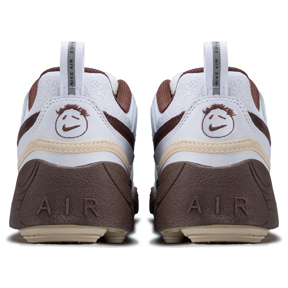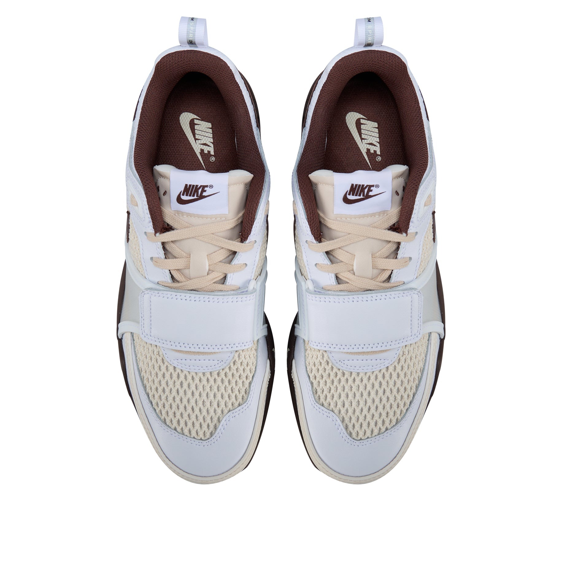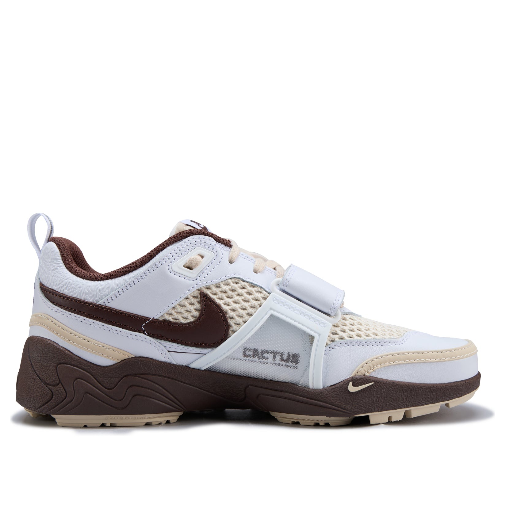 The Nike Zoom Field Jaxx Travis Scott Light Chocolate is a performance shoe designed in collaboration with American rapper Travis Scott. The Travis Scott Light Chocolate Nike Zoom Field Jaxx features an off-white mesh base thickly woven for extra visual texture. This mesh makes up the toe box and sides. White leather overlays form the toe cap, mudguard, eyestays, ankle strap, and heel area, while the mudguard is separated from the rest by a thin cream strip. A forefoot strap also appears over the laces in white leather, while Shark branding is seen underneath it on the inner side. The Nike swoosh crosses the sides in a Light Chocolate brown color, while the tongue also bears Cactus Jack branding in Light Chocolate. The Nike swoosh appears as the mouth inside a drawn face on the heel, and the shoe sits on a branded brown midsole complete with Air technology.What we like best about this sneaker is the unique branding, including the face on the heel. The Nike Zoom Field Jaxx Travis Scott Light Chocolate will be released in January 2025 for $170.