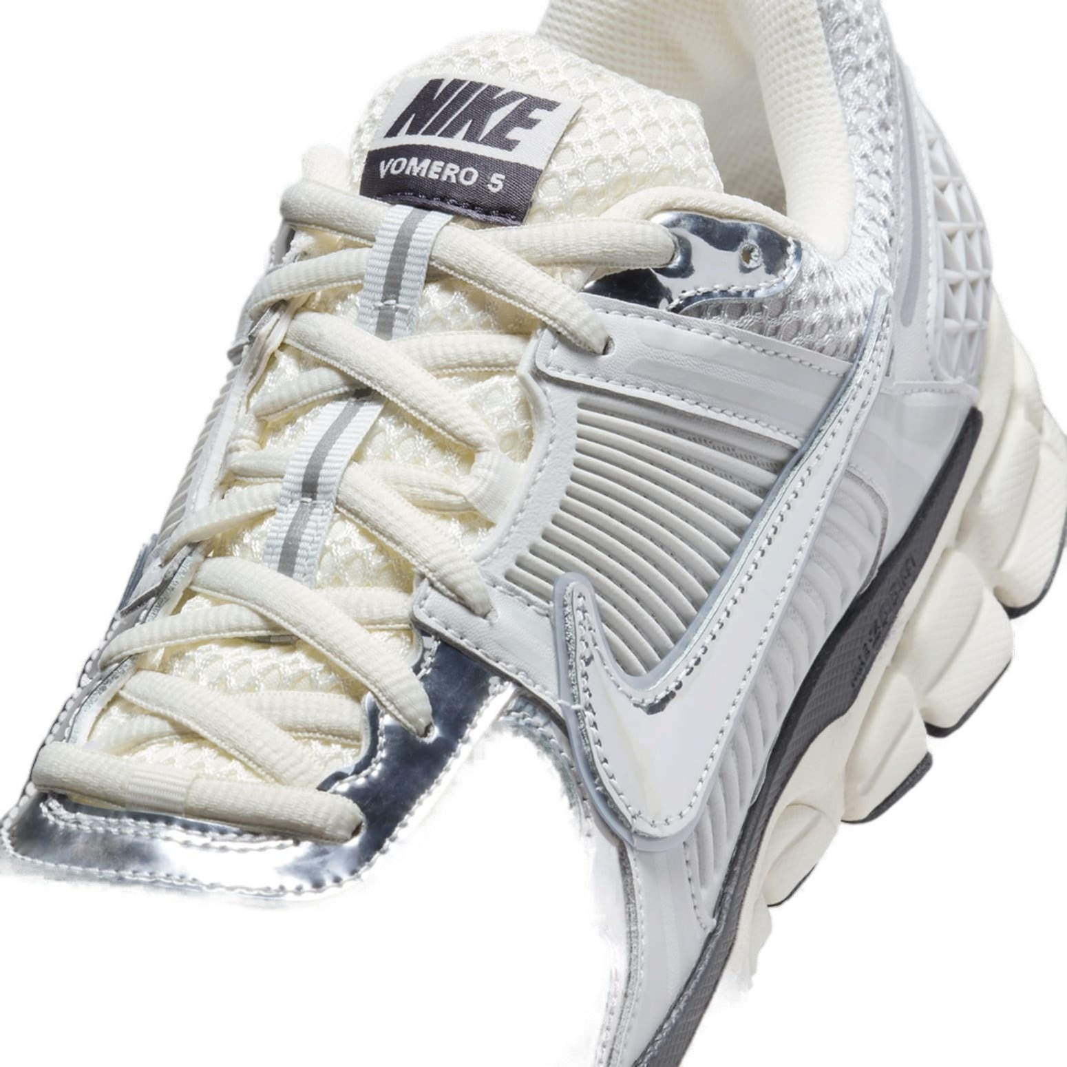The Nike Zoom Vomero 5 Chrome combines elements from lifestyle and running sneakers in the Nike catalog. It features a technical silhouette reminiscent of running shoes from the early 00s and modern updates for comfort.The upper is made of breathable mesh in Photon Dust with accents in Gridiron and Chrome. Metallic Chrome details on the forefoot overlays and the Swoosh stand out against the neutral background. Honeycomb-like paneling in the heel supports the ankle and helps the shoe keep its shape, while the front lace closure provides a secure fit. A Zoom Air unit adds bulk to the midsole and protects against impact stress. Finally, the black rubber outsole boasts a complex traction pattern that grips the ground.Our experts at Newsole like the tongue s logo tag, which features NIKE VOMERO 5 in boxy print and peeks out above the laces. The Nike Zoom Vomero 5 Chrome was launched on April 1, 2024, and sold for $160.