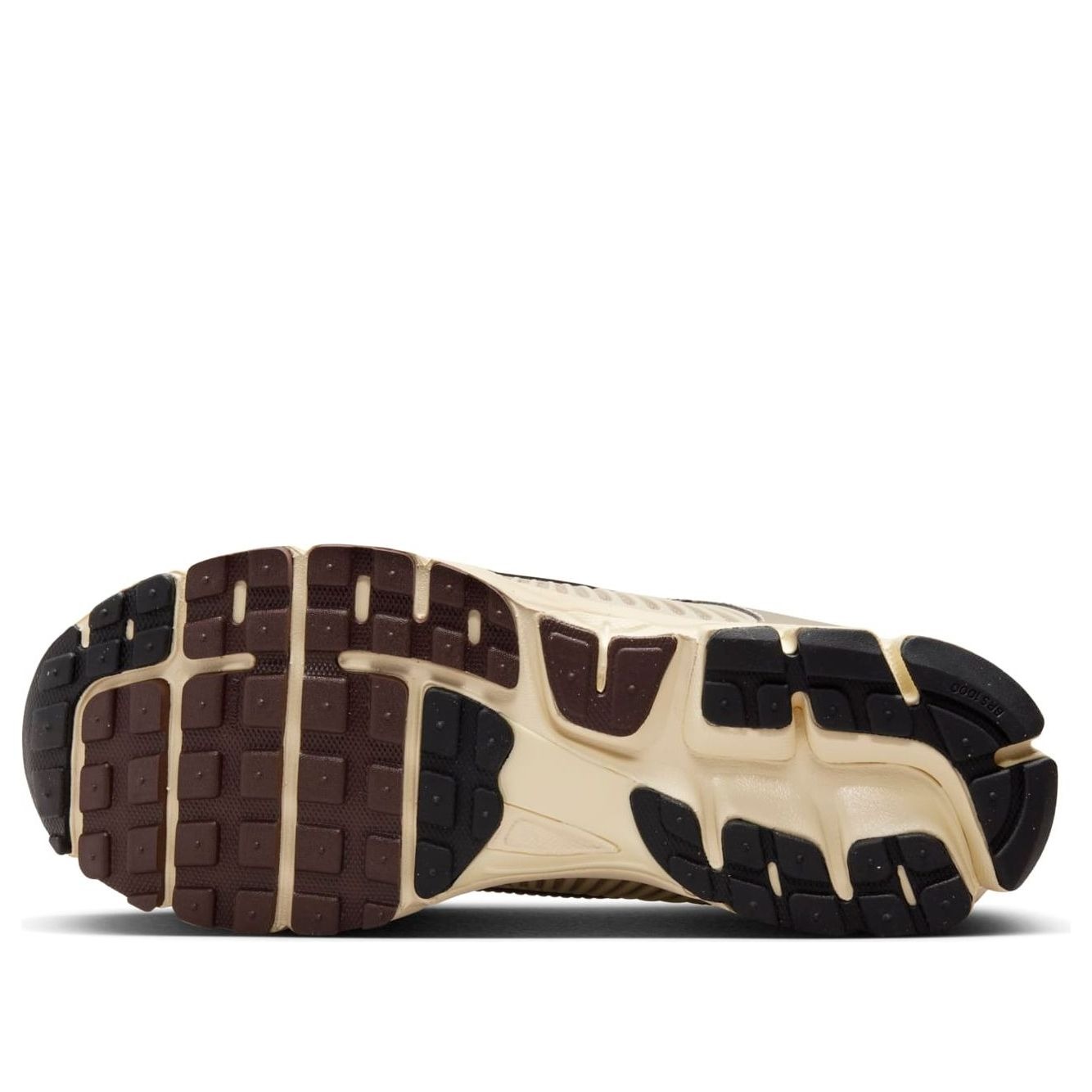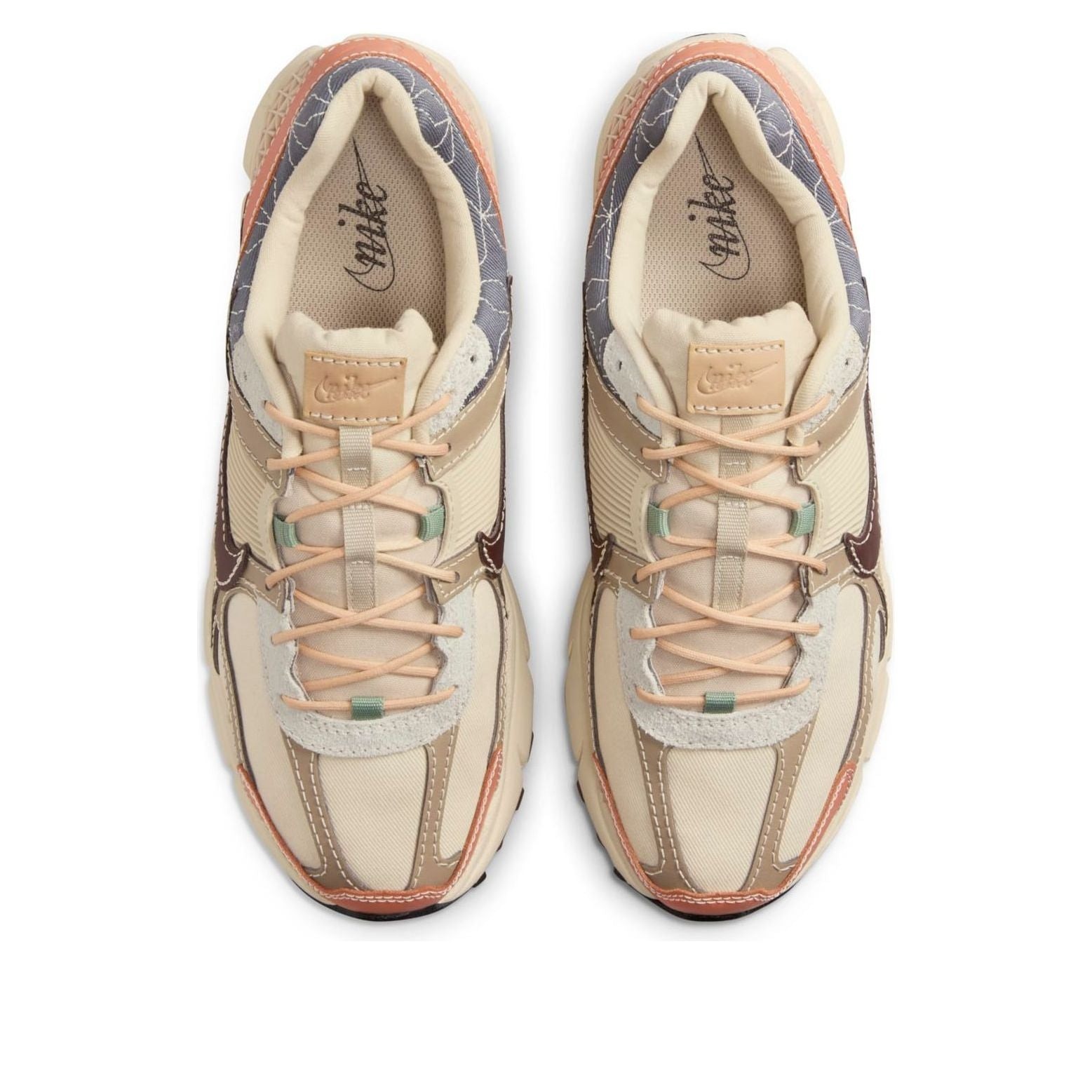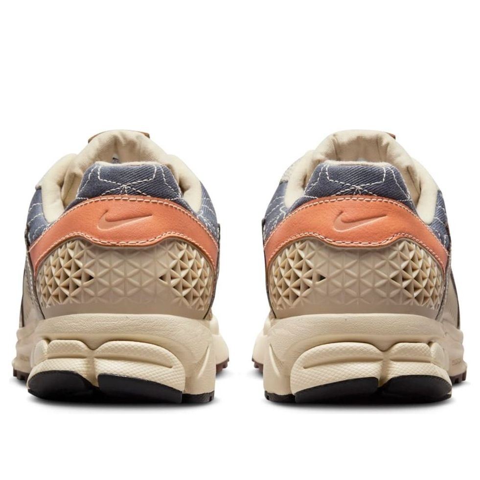 Tonal mesh on the side panel and light tan twill on the forefoot are elements of the Sashiko Nike Zoom Vomero 5. The heel, quarter panel, and toe box all have soft leather overlays in medium brown and orange that provide support and style. The eyestays are adorned with a pale gray suede overlay, and the Nike Swoosh on the side panel is made of dark brown leather. Both stability and ventilation are offered by a tan plastic cage at the midfoot and again at the heel. This artisanal-looking upper sits on top of a dark brown rubber outsole that is lugged for traction and impact absorption, and a sail-colored foam midsole with Zoom Air for long-lasting cushioning.