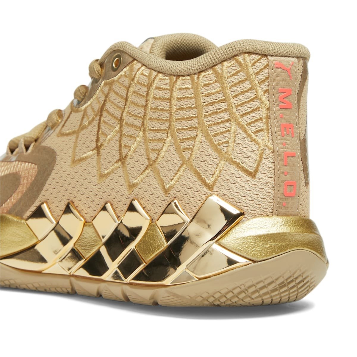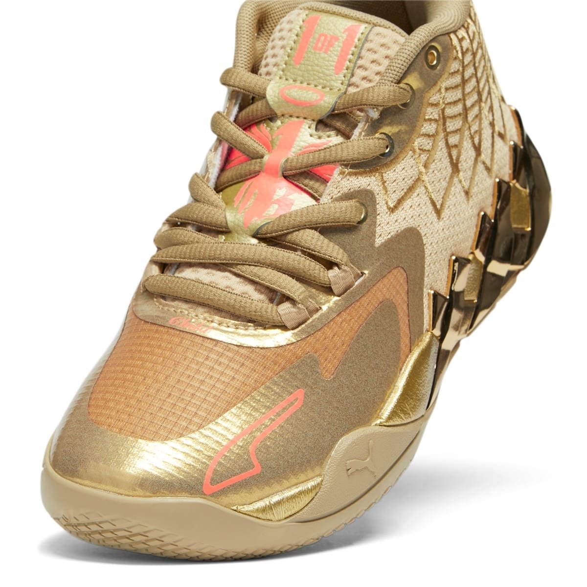 The Puma LaMelo Ball MB.01 Golden Child (GS) features a Metallic Gold/Fiery Coral colorway. This Puma LaMelo Ball MB.01 was first released for $120 on November 24, 2023.