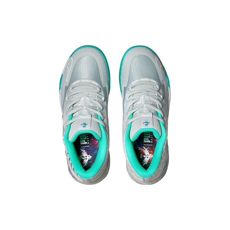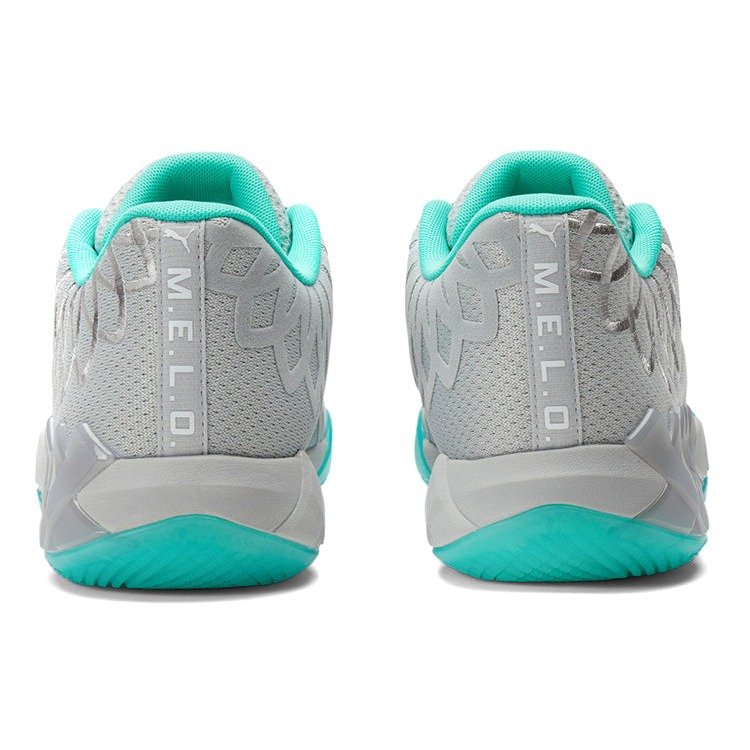 Continuing the storyline that LaMelo’s on-court skills and swagger are not of this planet, the Puma MB.01 Lo LaMelo Ball UFO draws inspiration from UFOs (Unidentified Flying Objects) and their radiant tractor beams. It is constructed with a light grey mesh and ripstop upper with reinforced seams and embroidered bird wing detailing similar to that of the high-top iteration. Geared for an explosive style of play, a Puma Hoops Nitro Foam midsole delivers maximum responsiveness and stability. Bright blue semi-translucent outsoles and sock lining add the finishing touch.The Puma MB.01 Lo LaMelo Ball UFO released in June of 2022 and retailed for $120.