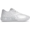 The Puma LaMelo Ball MB01 White Silver is a signature shoe created by Lamelo Ball and Puma.The Puma LaMelo Ball features a construction of white mono-mesh up the top of the shoe with a forefoot of tonal no-sew overlays. The low-top has its anchor from the white Nitro Foam midsole with the molded TPU frame for more stability. The padded mesh tongue is woven with a “1 of 1” tag to add sass to this iconic design. It has the LaMelo signature tagline “Not From Here” printed on the shoe vamp and the lateral collar embellished detailing.The Puma LaMelo Ball MB01 White Silver was released in July 2022 at a retail price of $120.