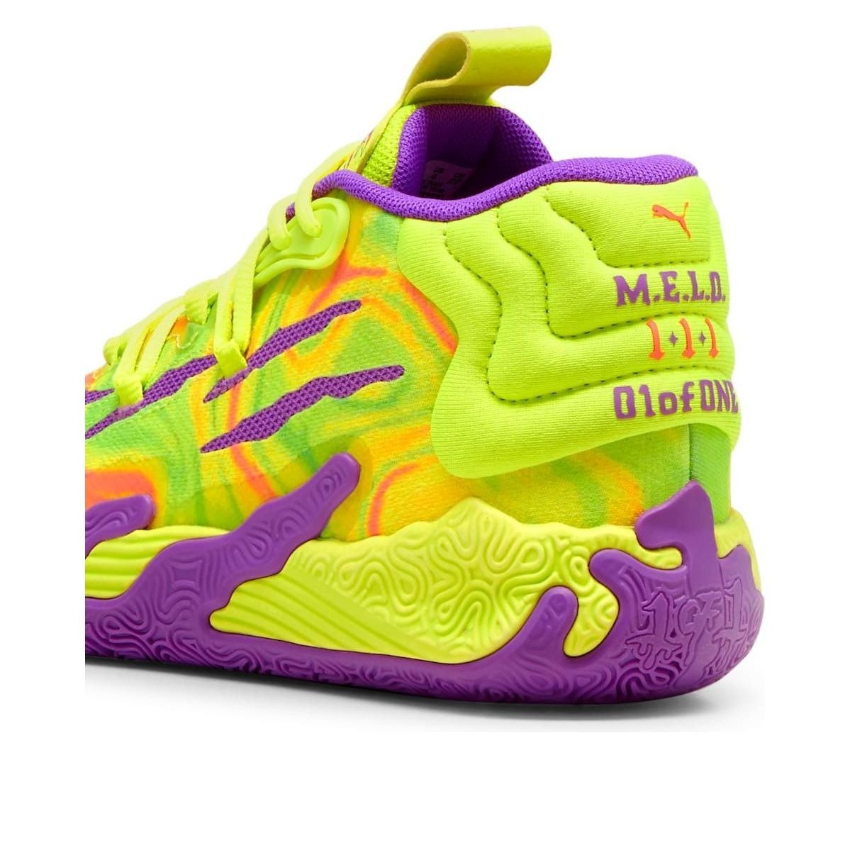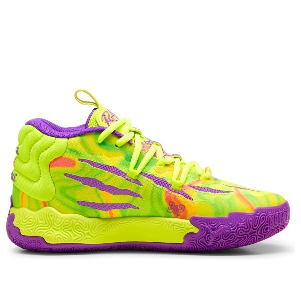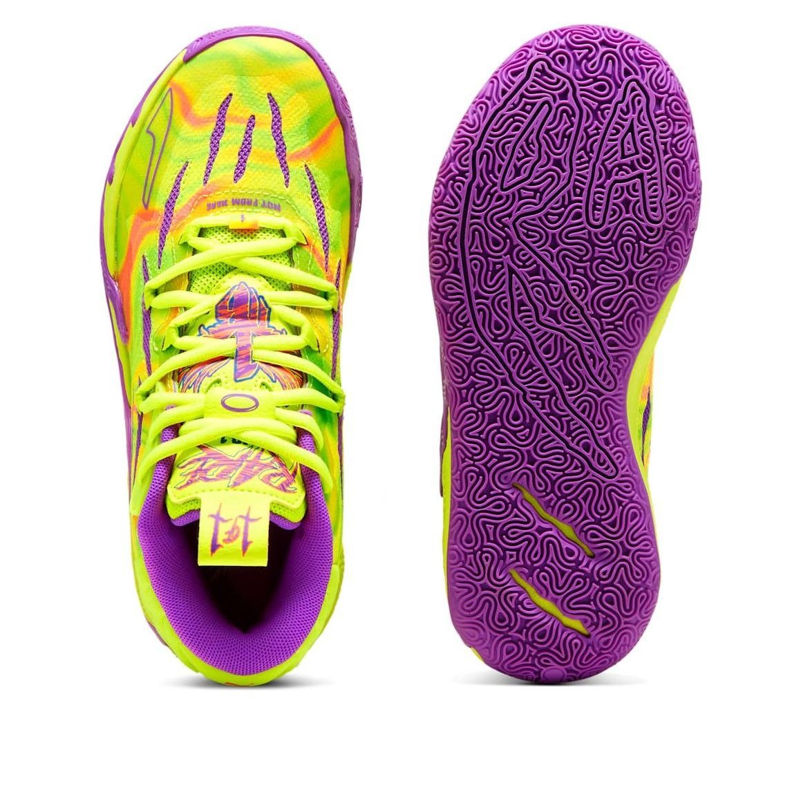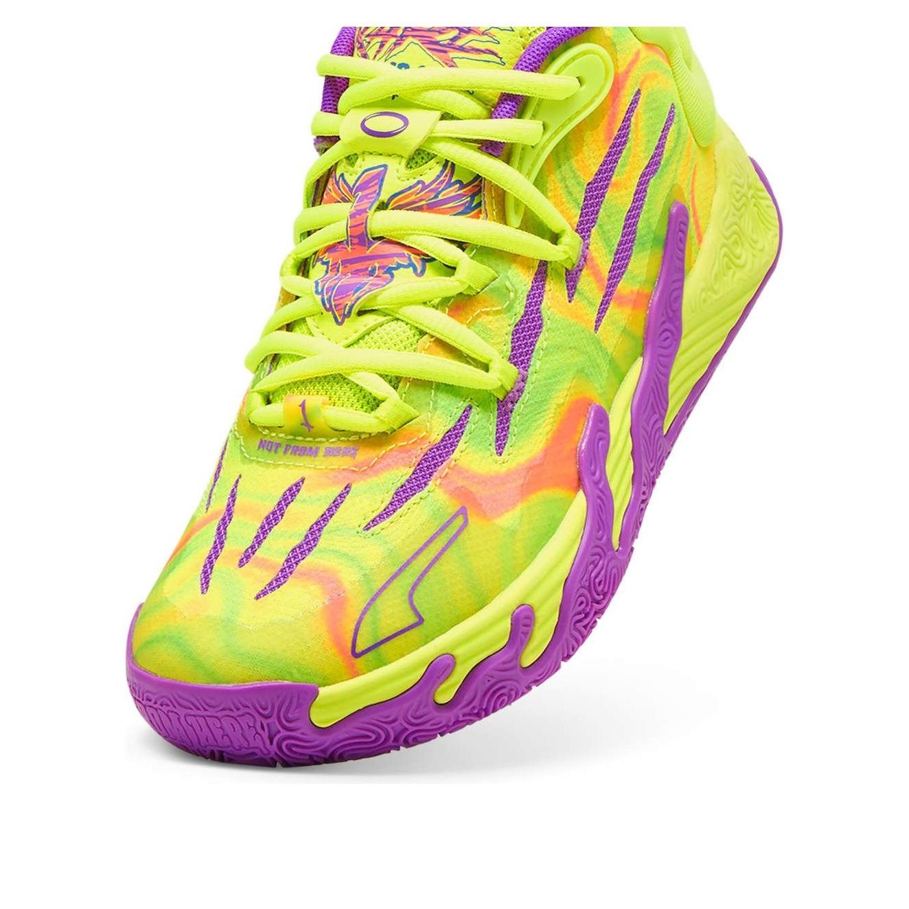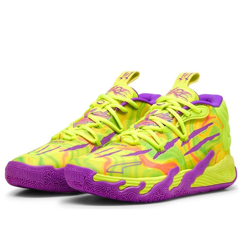 The Puma LaMelo Ball MB.03 Spark (GS) features a Safety Yellow/Purple Glimmer colorway. This Puma LaMelo Ball MB.03 was first released for $110 on April 05, 2024.
