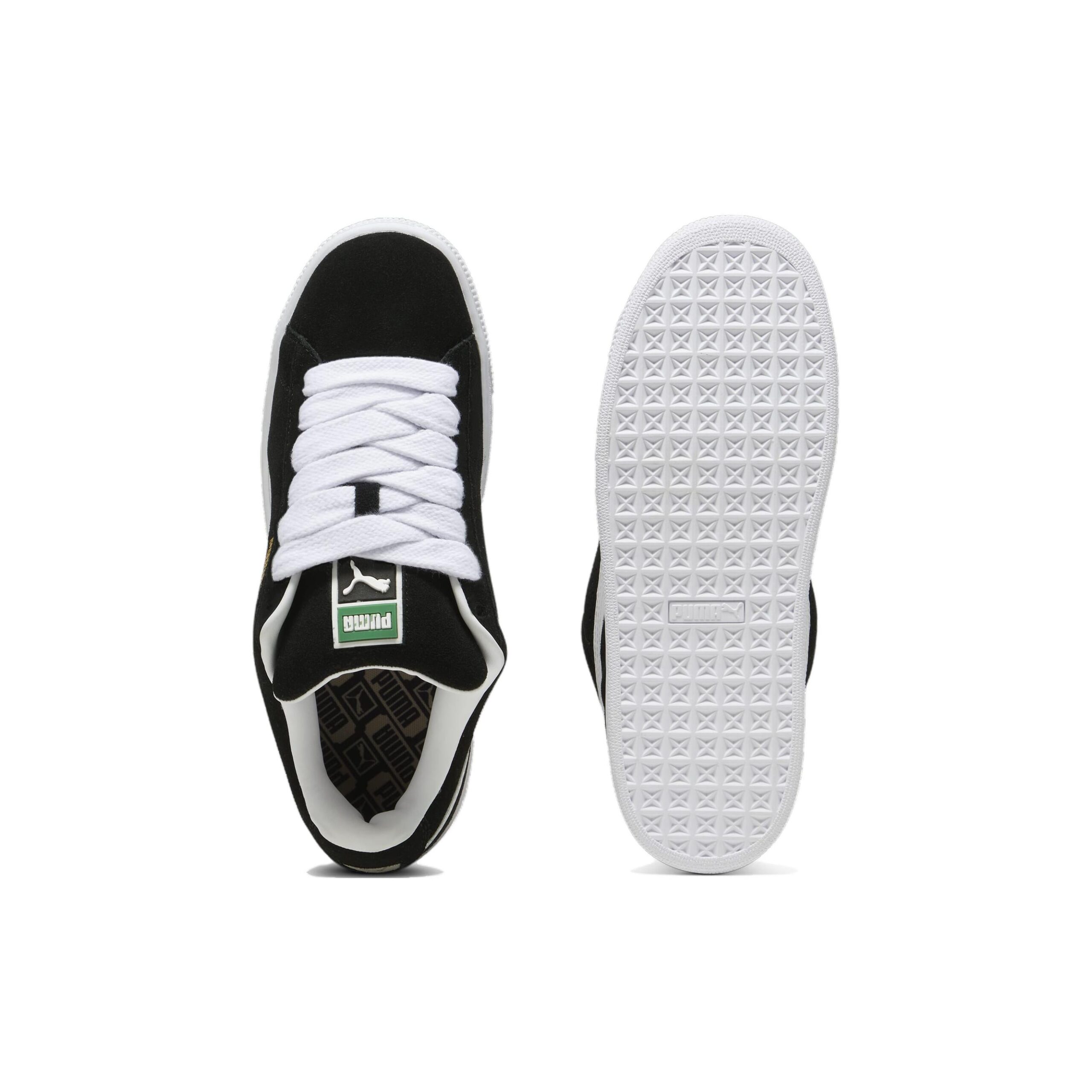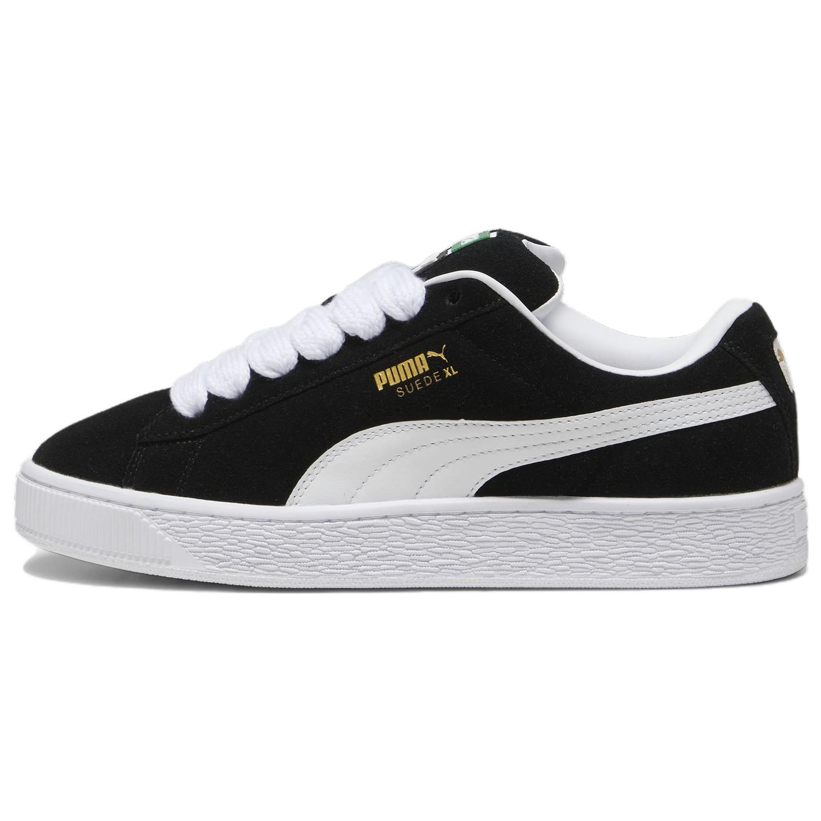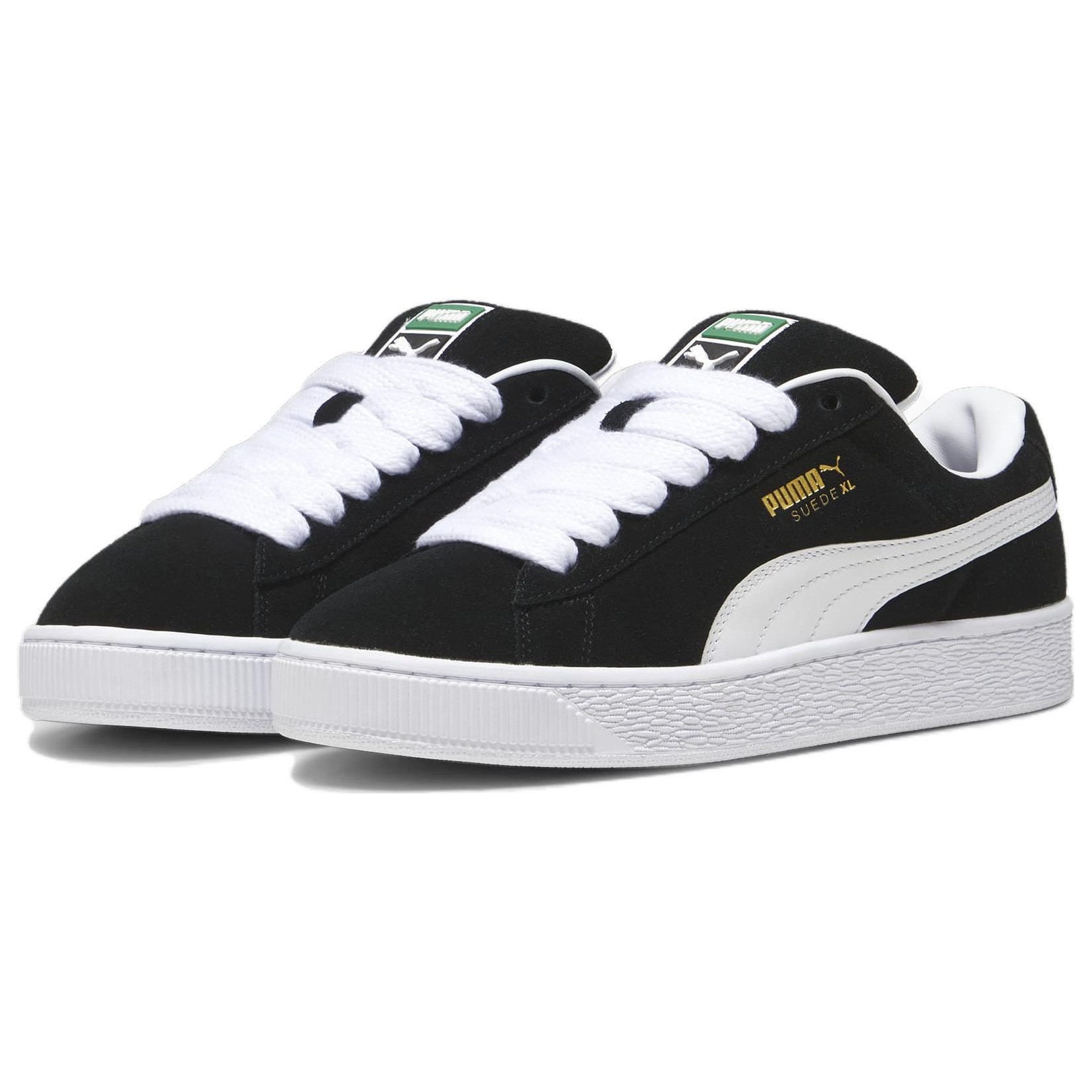 The Puma Suede XL Black White is a low-top lifestyle shoe with a chunky base that adds height, presenting in a crisp black and white color.The Suede XL pulls design inspiration from the original adidas Suede silhouette. While it stays true to some of the iconic elements, it mixes it up by adding a mega padded tongue and height boosting midsole. Dressed in plush black suede, the upper boasts white leather Formstrips on the side panels. A white liner and white midsole give this shoe a ying-yang appearance. Thick black laces complete the look.What do we think is a special design element of Puma Suede XL Black White? It d have to be the gold-colored accents that appear in the branding hits on the lateral side panel and the heel. They add just the right amount of pizzazz. This shoe retailed for $100 when it was released on April 8, 2018.