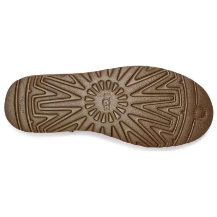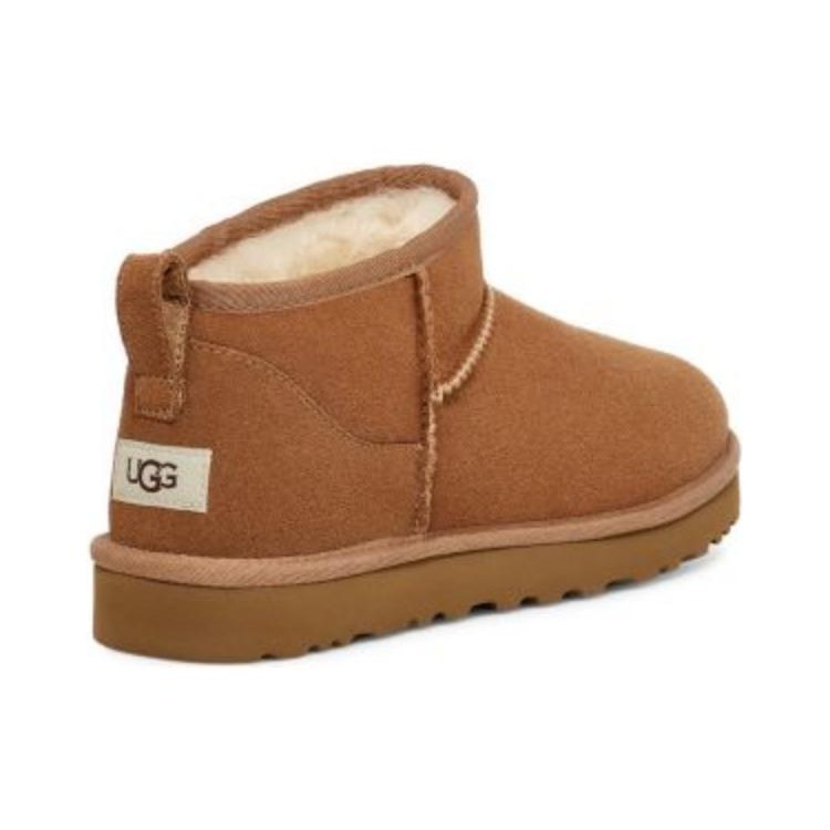 The UGG Classic Ultra Mini Chestnut, which was made available for women, features overlock stitch detailing on its seams, and an asymmetrical topline.The shoe is made of an upcycled wool upper made of Twinface sheepskin, a suede heel counter with a rear draw tab, a foam footbed, a lyocell insole, and a Treadlite outsole. The textile binding, which is created with polyester fibers recovered from other products, completes the look. An UGG-branded logo can be seen on the sewn heel. For traction, its outsole is chipped.The UGG Classic Ultra Mini Chestnut debuted on November 1st, 2021, and originally retailed at $140.