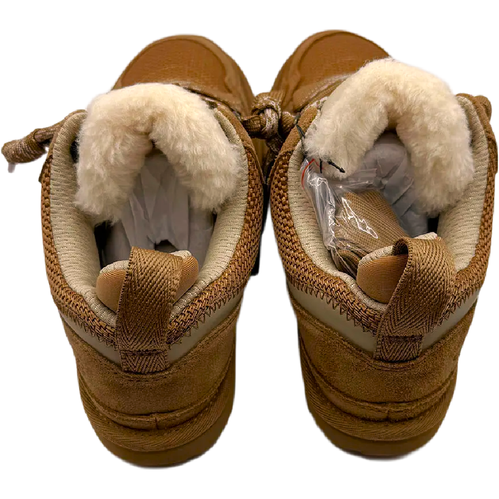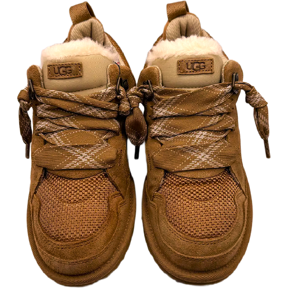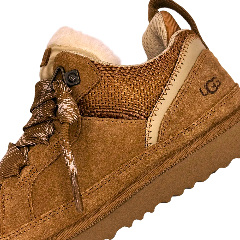 The UGG Lowmel Chestnut (Kids) is a shoe for kids that contains elements of both boots and sneakers for versatile wear. This iteration of the UGG Lowmel comes in a darker-brown Chestnut color throughout. Mesh makes up the toe box and ankle area, while Chestnut suede forms the toe cap, mudguard, sides, eyestays, and heel counter. The UGG brand name is embossed into the outer heel, while the heel counter is outlined in a gray color with decorative stitching. The heel also features a pull tab. The laces are thick and Chestnut colored, while the tongue is a cream color with an UGG branding patch. The inside is lined with thick shearling for warmth, and the shoe sits atop an EVA foam midsole and outsole. What we like most about this shoe is the shearling lining, which provides all the comfort and warmth of the classic UGG boot. The UGG Lowmel Chestnut (Kids) was released on June 25, 2024, for $100.