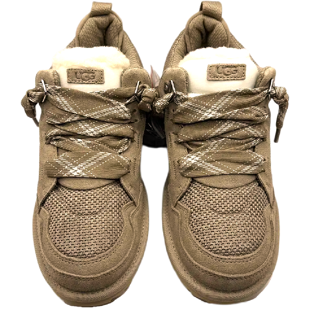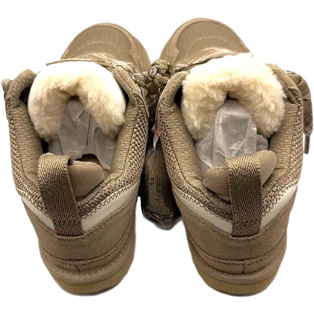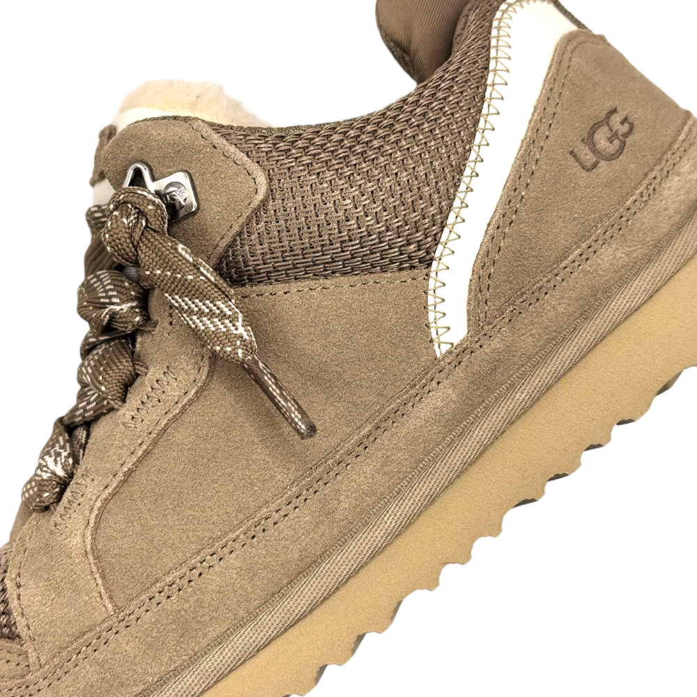The UGG Lowmel Dune (Kids) is a crossover shoe for kids that contains elements of both boot and sneaker. The Dune (Kids) UGG Lowmel features a toe box and ankle area made of flexible mesh in a Dune color. The sides, eyestays, heel counter, toe cap, and mudguard are all made of genuine calf suede in the same color, while the heel counter is outlined in white. Thick matching laces appear on the front, and the tongue is thick and white, bearing an UGG patch and lined with shearling. The UGG logo can also be found on the lateral heel. There is a pull tab at the heel, and the shoe sits on a foam outsole. The inside of the shoe is also lined with shearling for warmth. What we like best about this shoe is its crossover effect it makes it both stylish and comfortable. The UGG Lowmel Dune (Kids) was released on November 14th, 2024, for an original price of $100.