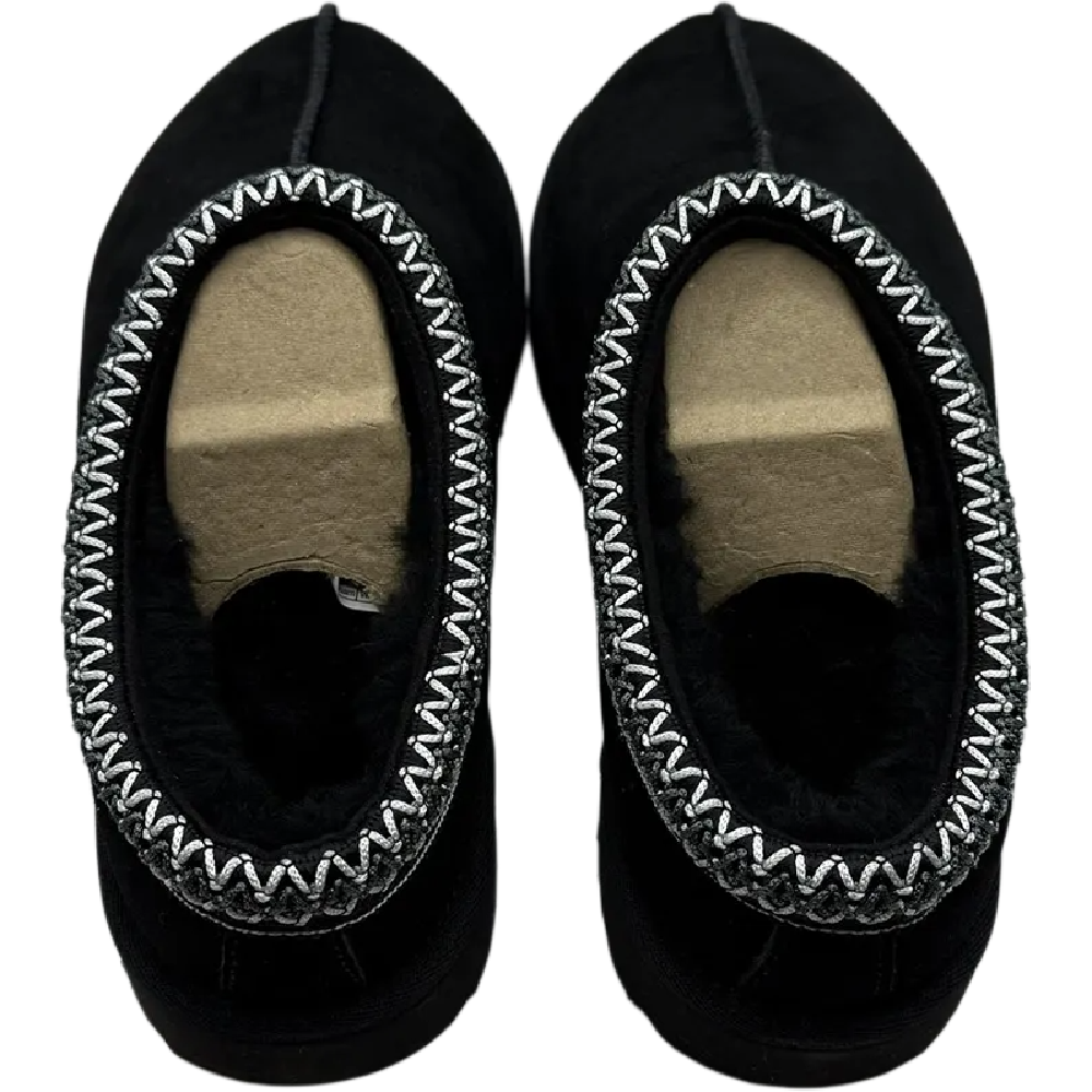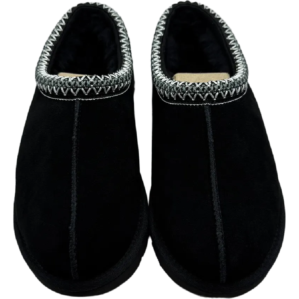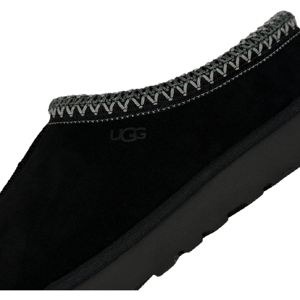 The UGG Tasman Slipper Black W is a suede slipper with a Treadlite sole, a soft genuine-shearling inner, and an embroidered accent. The Australian shoe company UGG’s women’s Tasman Slipper is a slip-on style with a black suede covering. For warmth, the lightweight slipper is lined with soft UGG wool. For grip, there is an exterior Treadlite outsole in addition to a foam footbed underneath. The UGG logo is heat-embossed on the side for branding purposes.