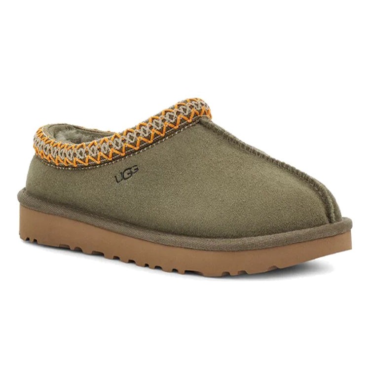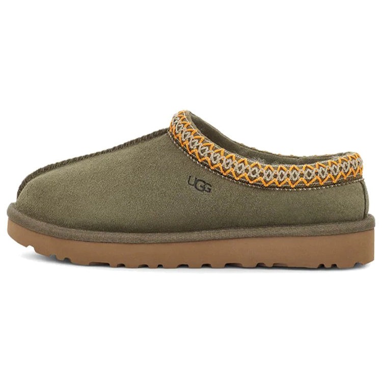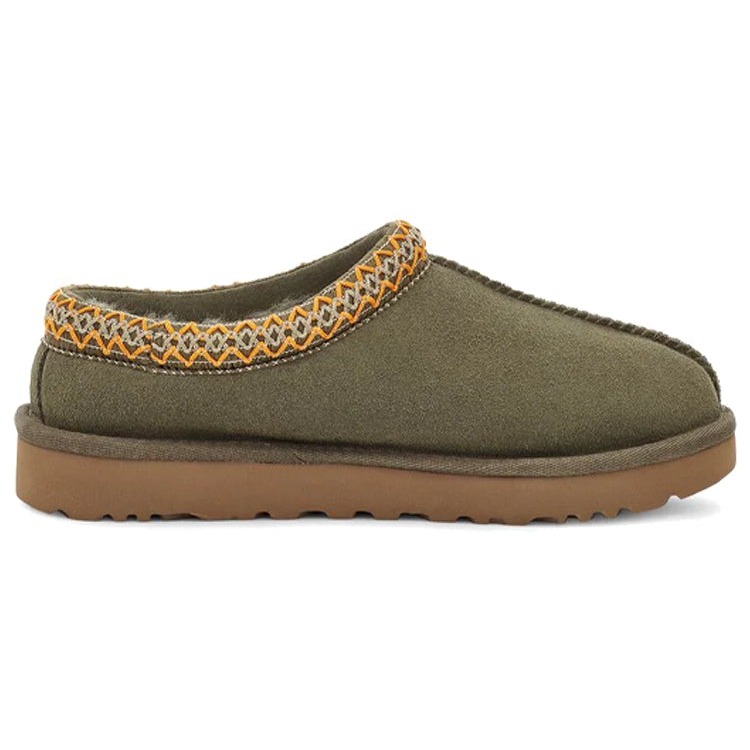The UGG Tasman Slipper Burnt Olive W is a slip-on footwear for women that can be worn as either a slipper or a shoe.This Burnt Tasman Slipper model has an upper section made from soft suede with embroidered braiding around the cuff. The plush lining combines sheepskin and upcycled wool and the insole is made from upcycled wool. The outsole is made of Treadlite by UGG and features a starburst traction pattern. This sustainable slipper with a heat embossed logo is held together by 100% recycled polyester fiber binding.The UGG Tasman Slipper Burnt Olive W was released on November 1st, 2021 at a retail price of $100.