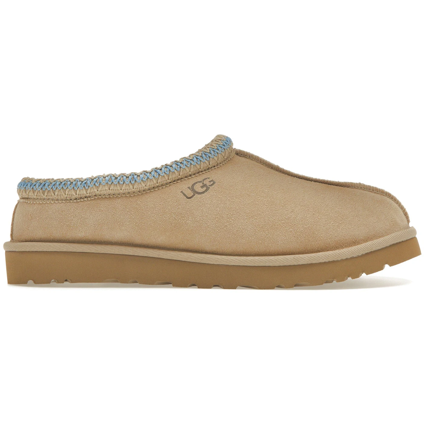 The UGG Tasman Slipper Santorini Sand is a slip-on shoe made for both comfort and durability. This iteration of the UGG Tasman Slipper has an upper made of suede in a light tan Santorini Sand color. The UGG logo is embossed into the suede on the lateral side just under the opening. The UGG braid around the opening is made from recycled polyester and appears in a blue and Santorini Sand color. It has a foam footbed lined with wool for extra comfort and warmth, and an UGG branding patch is also visible on the heel. The outsole is made of thick EVA foam for comfort and durability. What we like most about this shoe is the decorative braid, which adds a nice pop of color to an otherwise simple shoe. The UGG Tasman Slipper Santorini Sand was released on November 1, 2023, for a retail price of $180.